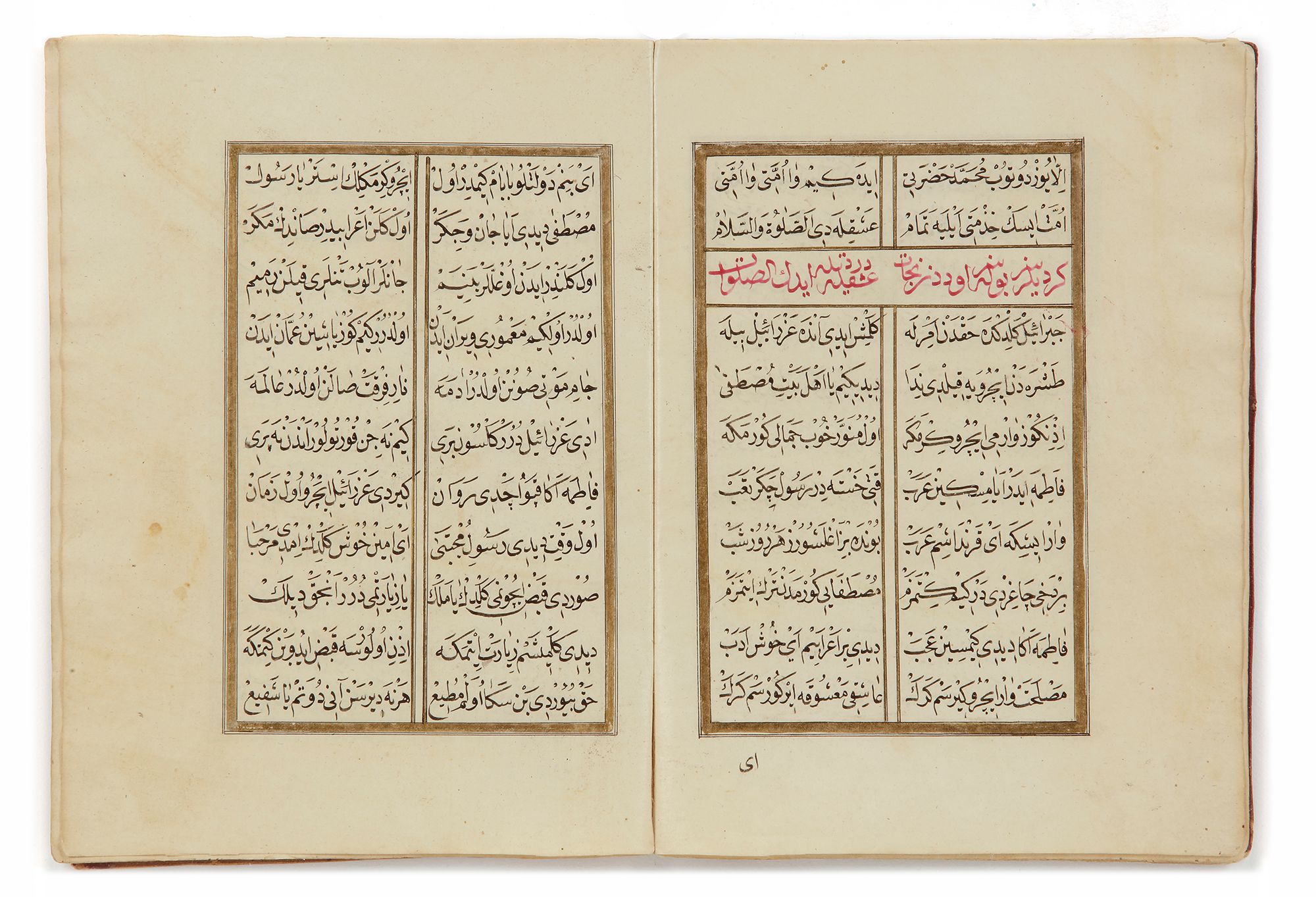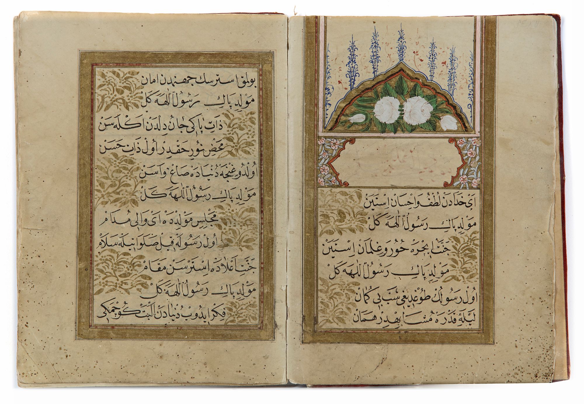 Al-Mawlid al-Nabi - Prayer book commemorating the birth of the Prophet Arabic manuscript of 39 leaves on beige paper, calligraphed in beautiful and regular naskh in black ink on eleven lines per page. A beautiful illuminated frontispiece 'sarlowh' decorated with roses opens the manuscript, with the title in thuluth red slightly erased, on the first. The large spelling at the beginning becomes tighter from folio 5 or the text becomes poetic in two columns up to folio 37b. Titles in red thuluth. At the end, blessings to Sultan 'Abdul-Mejid and his armies. Binding in red morocco stamped with golden geometric decoration, without flap and detached. 27 by 17 cm.