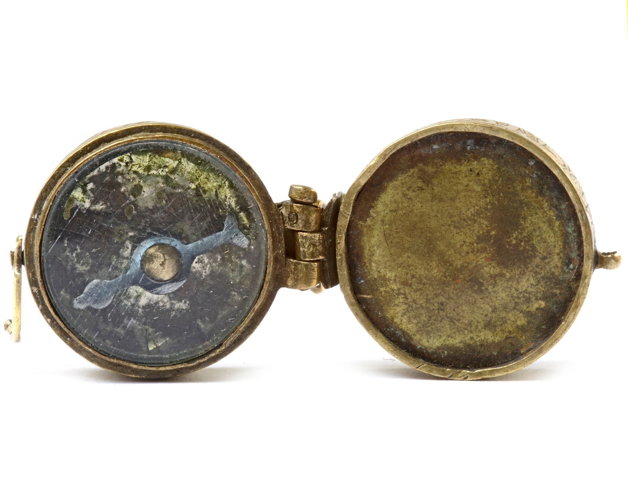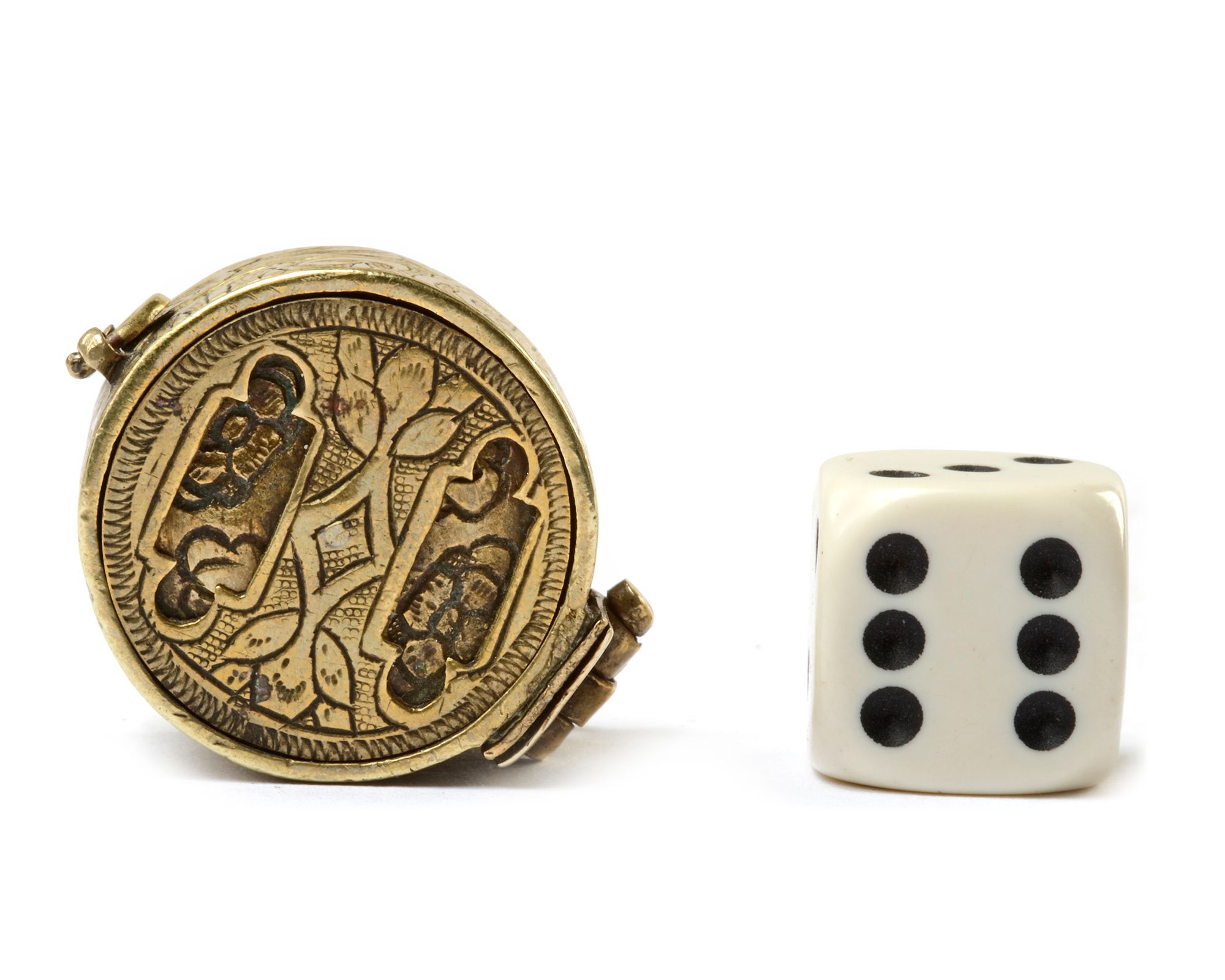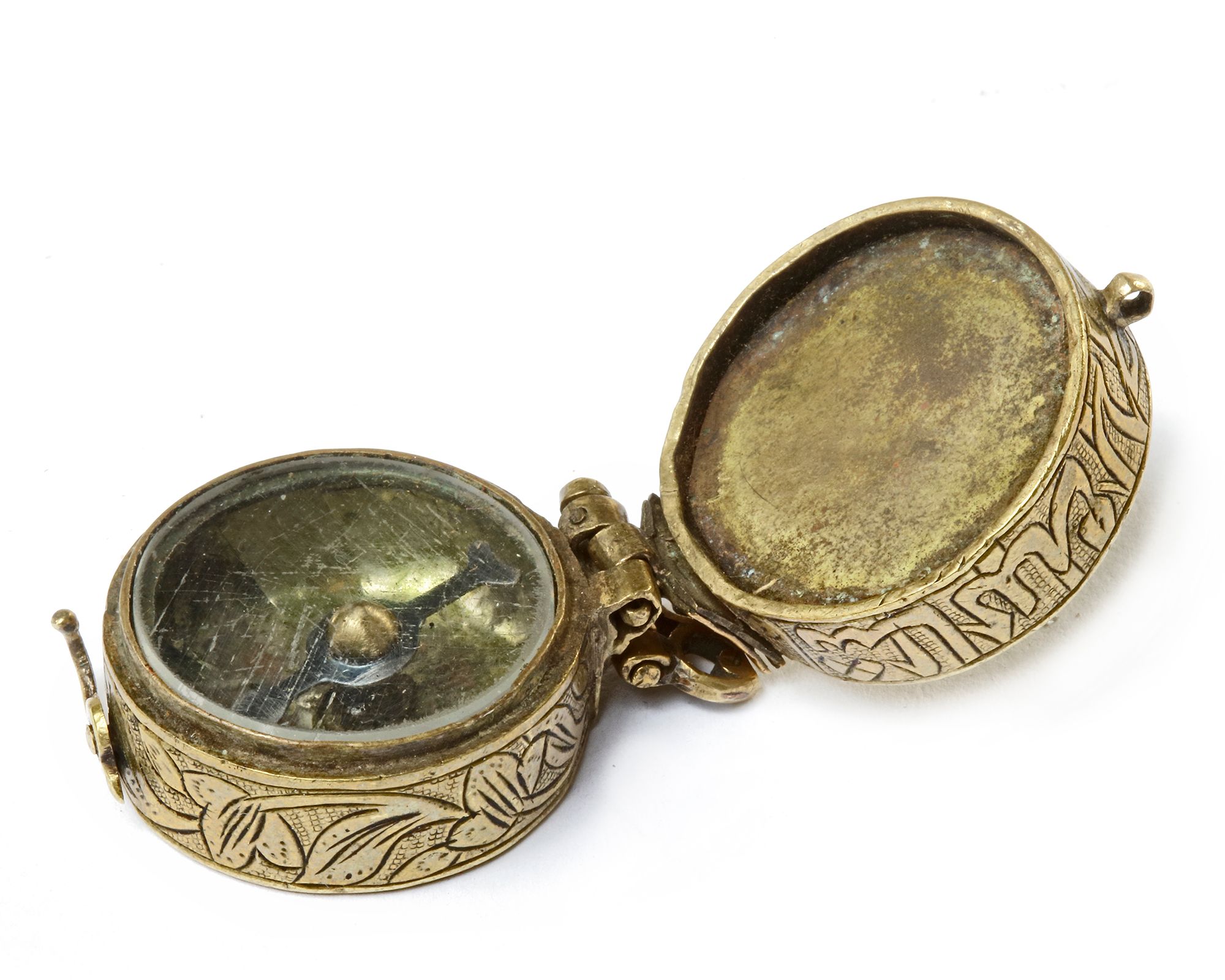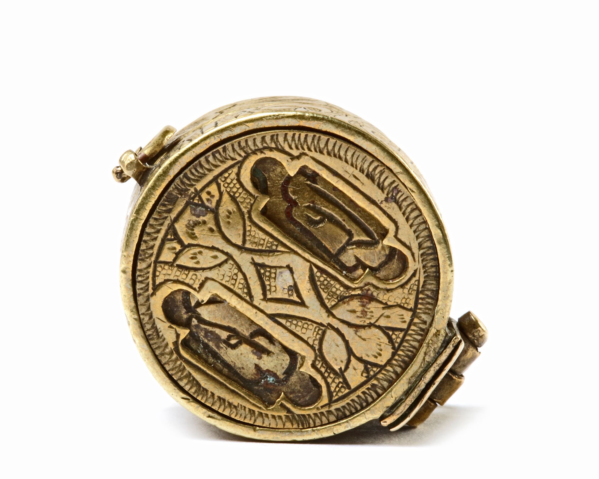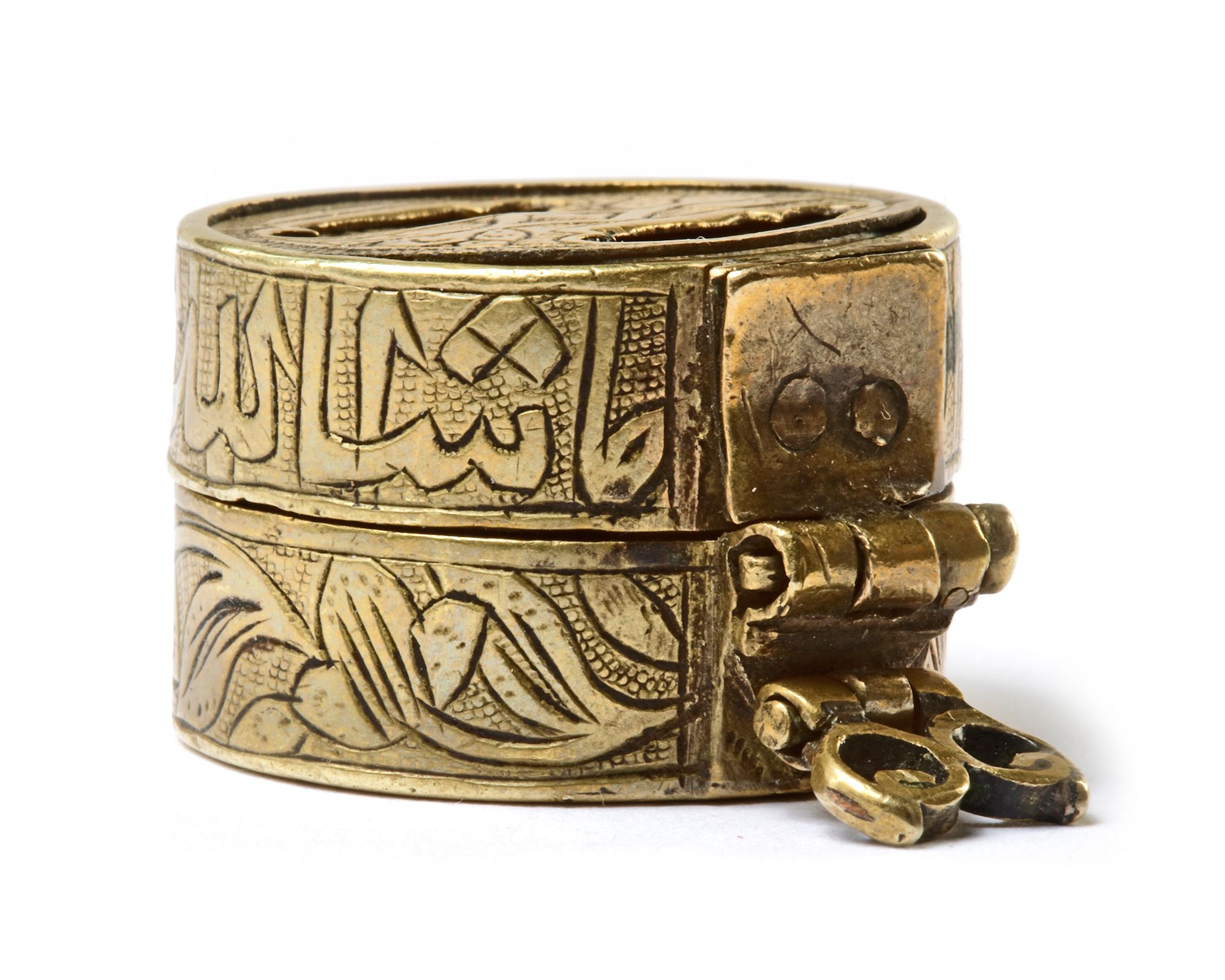 Of circular form with hinged lid, incised with Arabic inscriptions and foliage, the interior with glass frame and compass. Inscriptions: Mashallah ,'what God has willed' and is used to express appreciation, joy, praise, or thankfulness for an event or person that was just mentioned. Hawqala: there is no power nor strength except by Allah, is mentioned by muslims when seized by a calamity or in a situation beyond their control. The cover is incised with 'Omar and Ali'. 2 cm. high, 3 cm. diam.