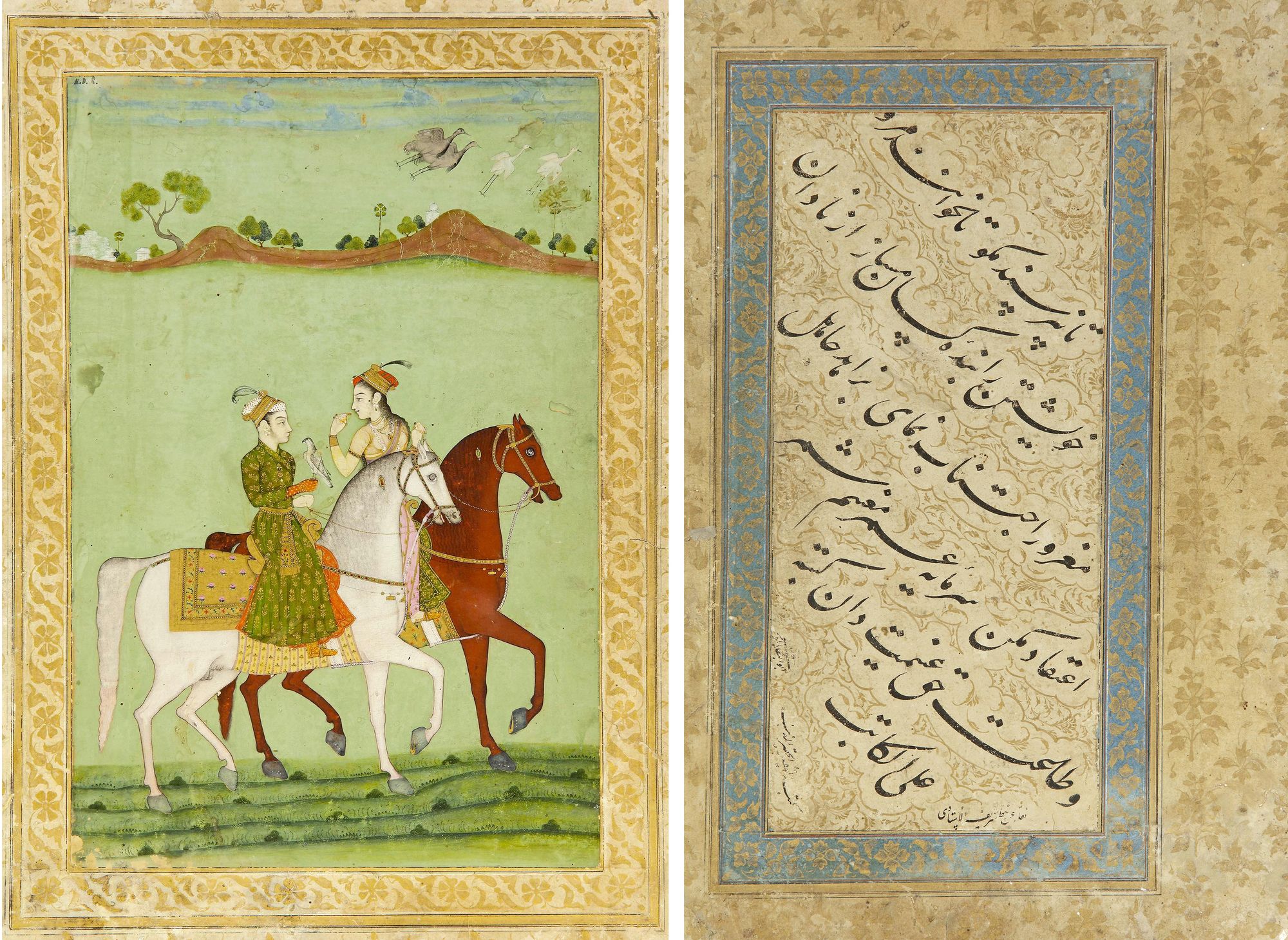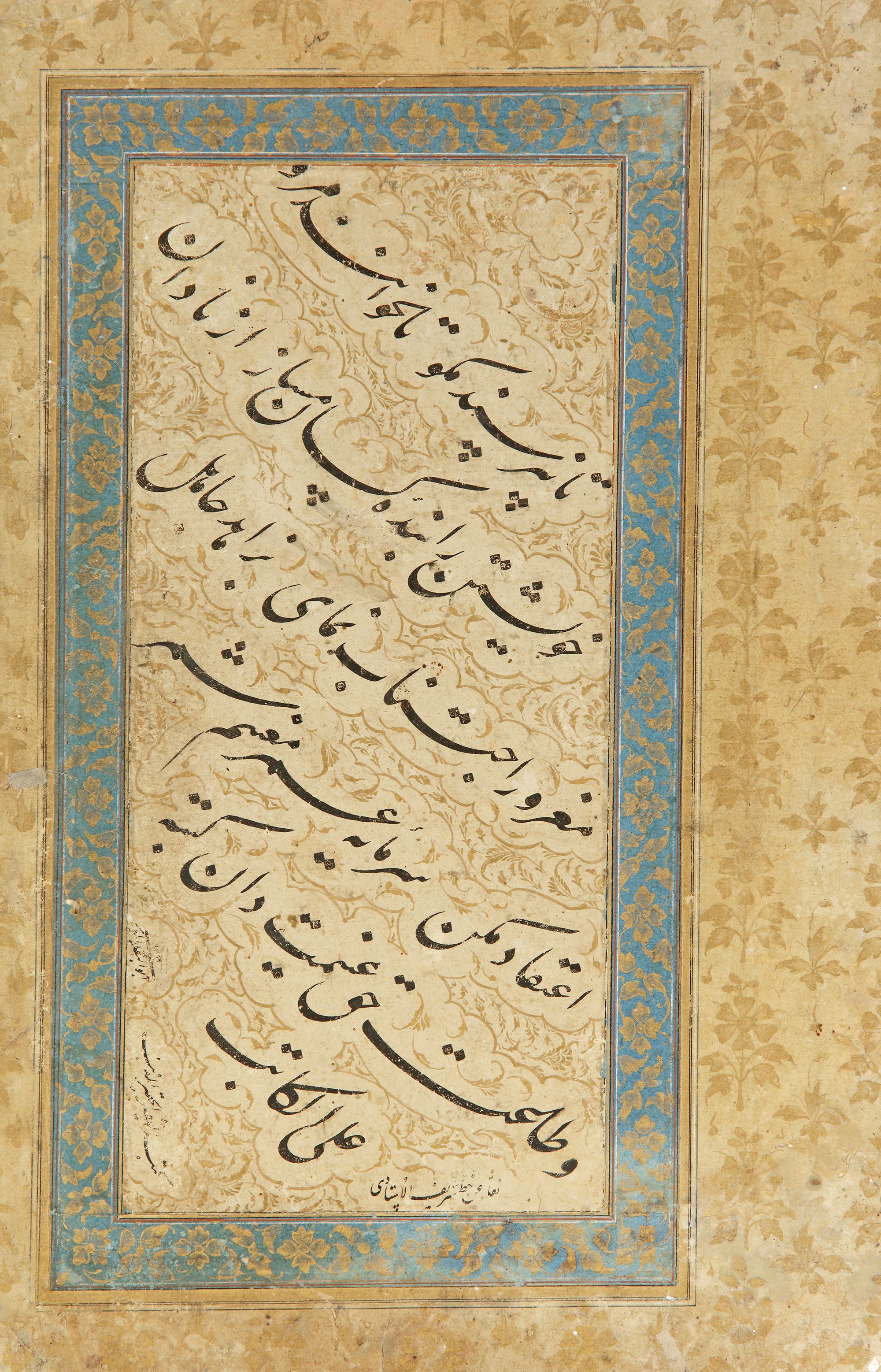 Verso: A nastaliq quatrain, signed Abu Al-Baqa’ (Al-Musawi) circa 1680-1690. Ink and pigments on paper, the calligraphy in six lines of elegant black nastaliq script, each line in cloud on illuminated gilded floral ground, with cream borders, Panel: 35 by 25.5 cm. Calligraphy: 25 by 12 cm.