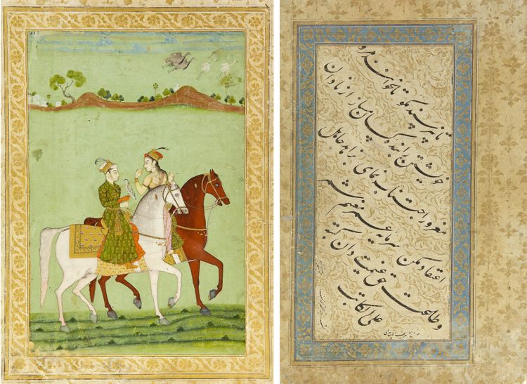 Gouache heightened with gold on paper, laid down on an album page with narrow gold border rules. Painting: 25 by 17 cm. Leaf: 35.5 by 25.5 cm.