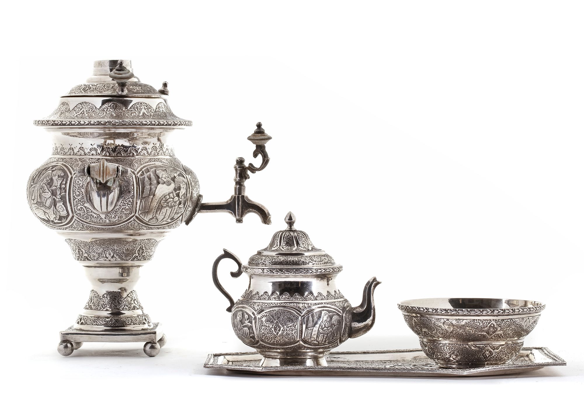 A Sheffield plate tea urn, the body is supported on a oval pedestal rising from a rectangular base with bun feet, decorated with panels enclosing figures and floral designs. H: 22 cm. A small teapot with a cup and a small tray similarly decorated. Teapot: 10 cm. Cup: 4 by 10 cm. Tray: 15 by 23 cm.