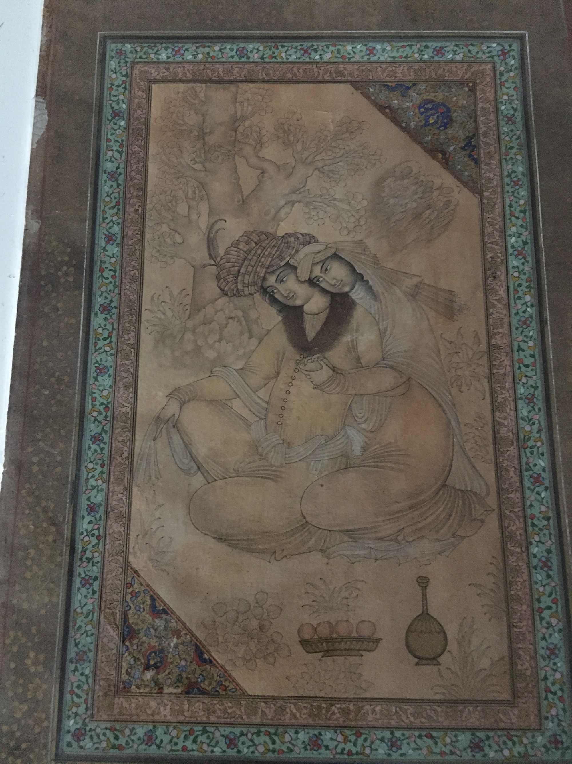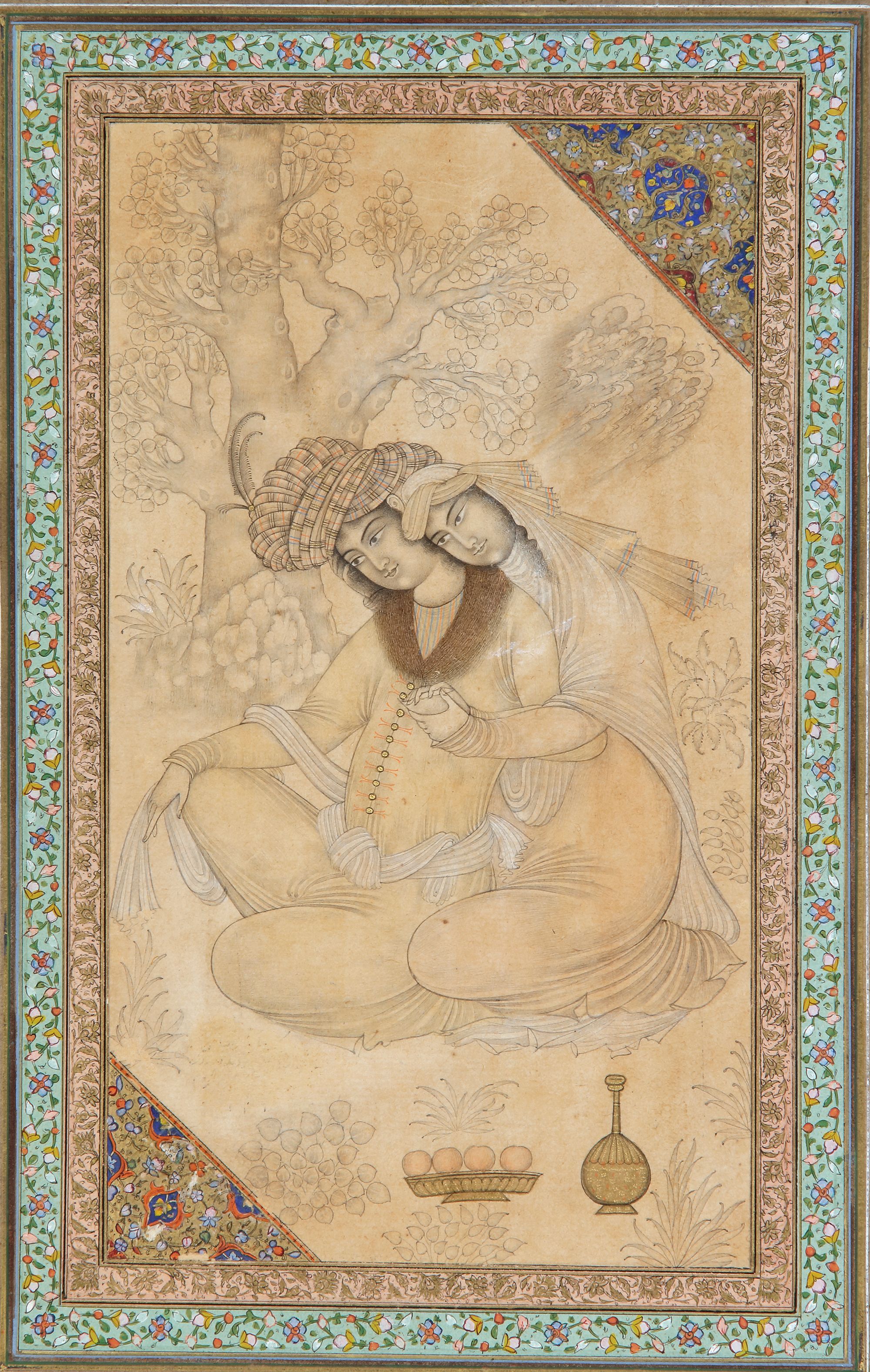 Pencil and ink on paper, heightened with gold, laid down on album page, depicting a seated couple in landscape.