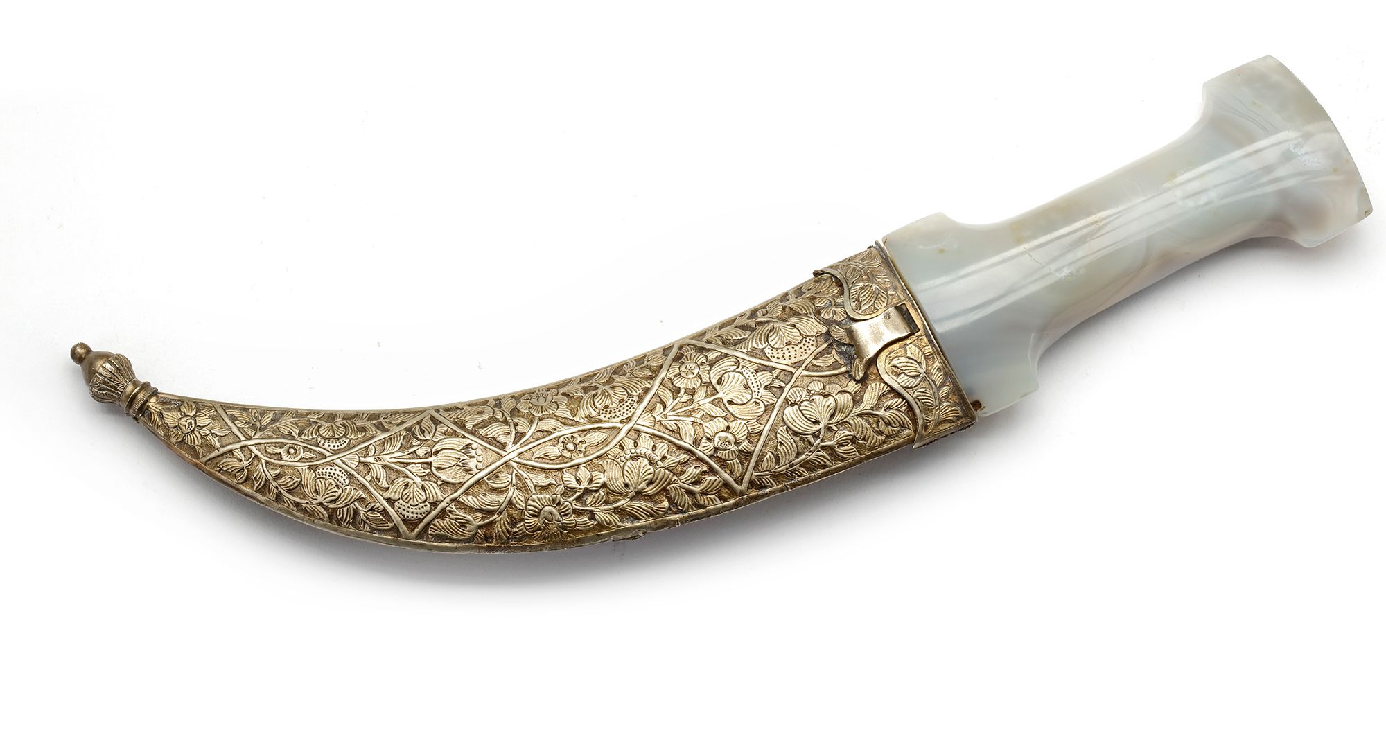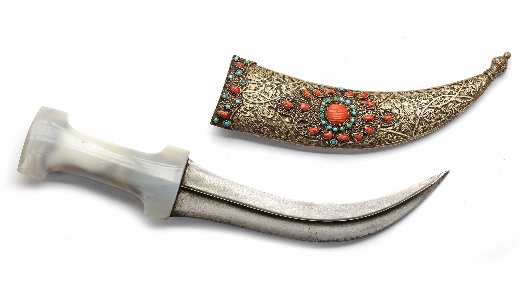 The double-edged watered steel blade with central spine, the hilt is carved out of a greyish and milky white agate. The sheath made of wood covered with silver decorated with palmettes and floral patterns, furthermore decorated with filigree coral and turquoise inlay. 32 cm.