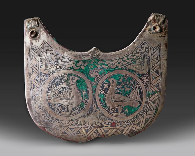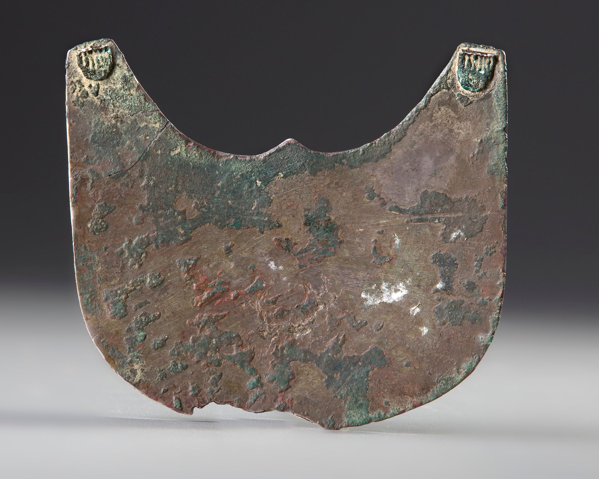 Of demi-lune form the surface lightly engraved with two confronted peacocks within roundels against a ground of scrolling vegetation, a crouching hare in the space beneath them, two smaller birds in the spandrels above, surrounded by a knotted border, two attachment knops in top two corners, small portion missing at bottom edge.