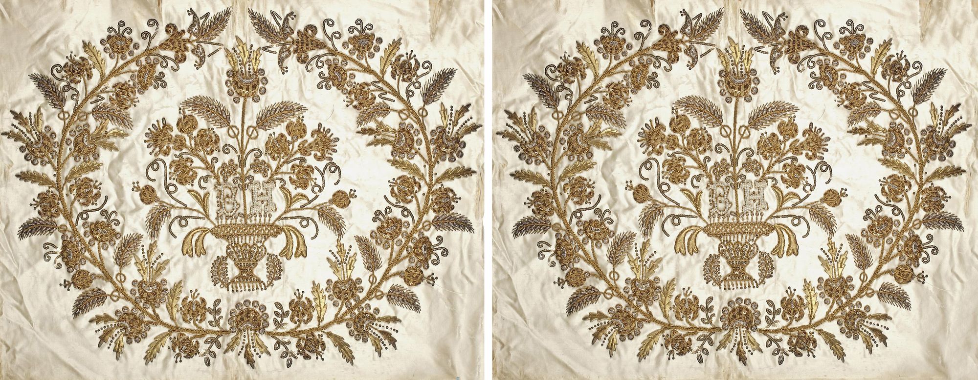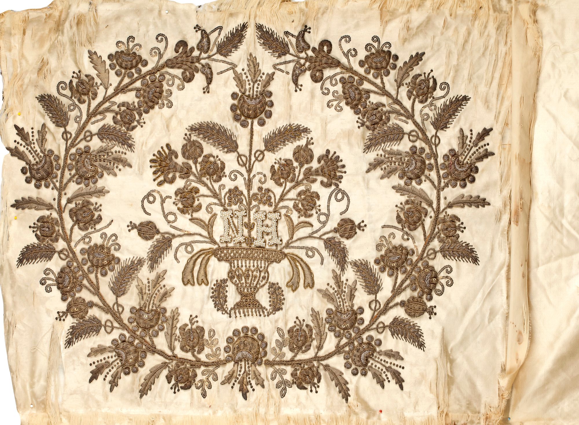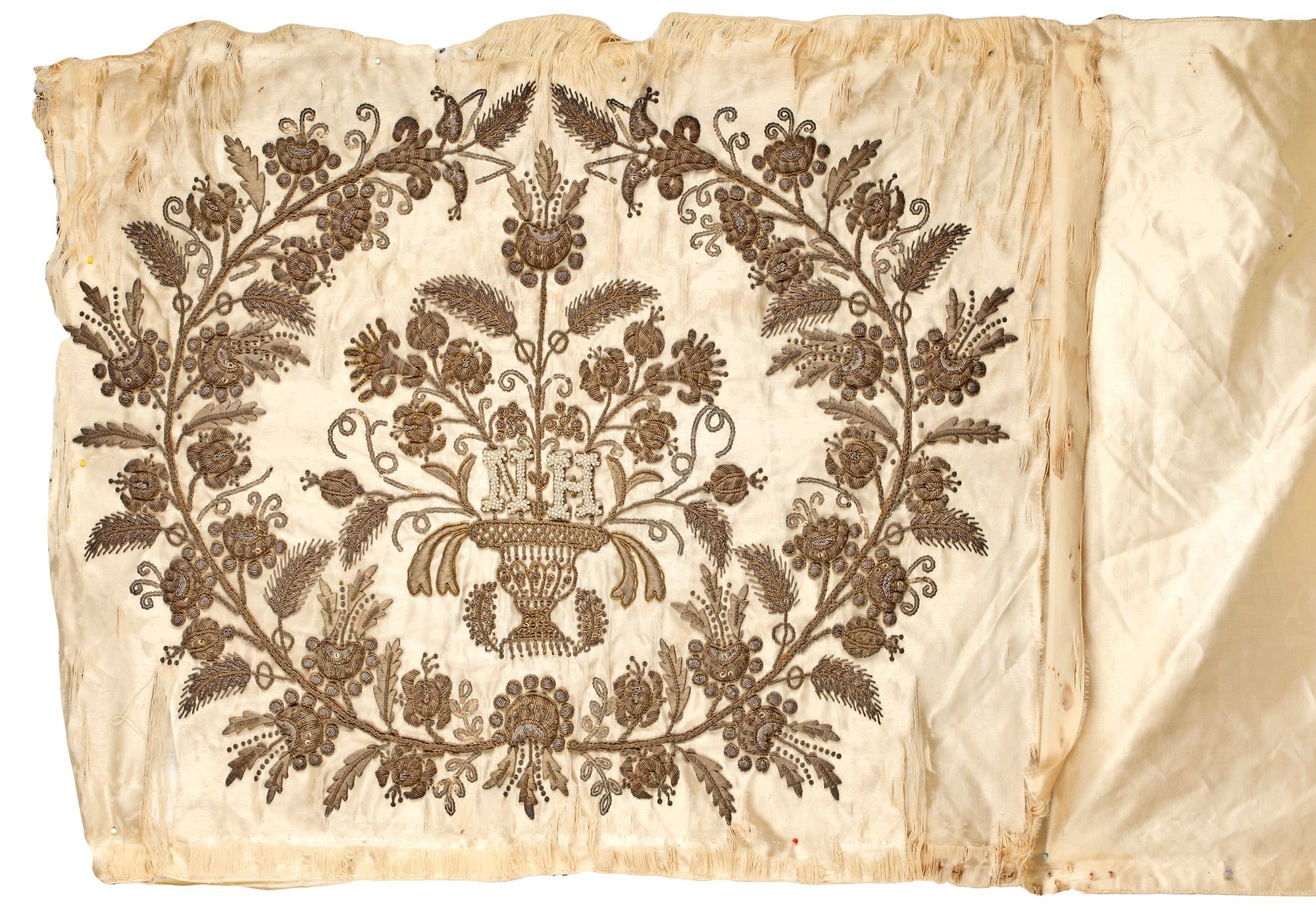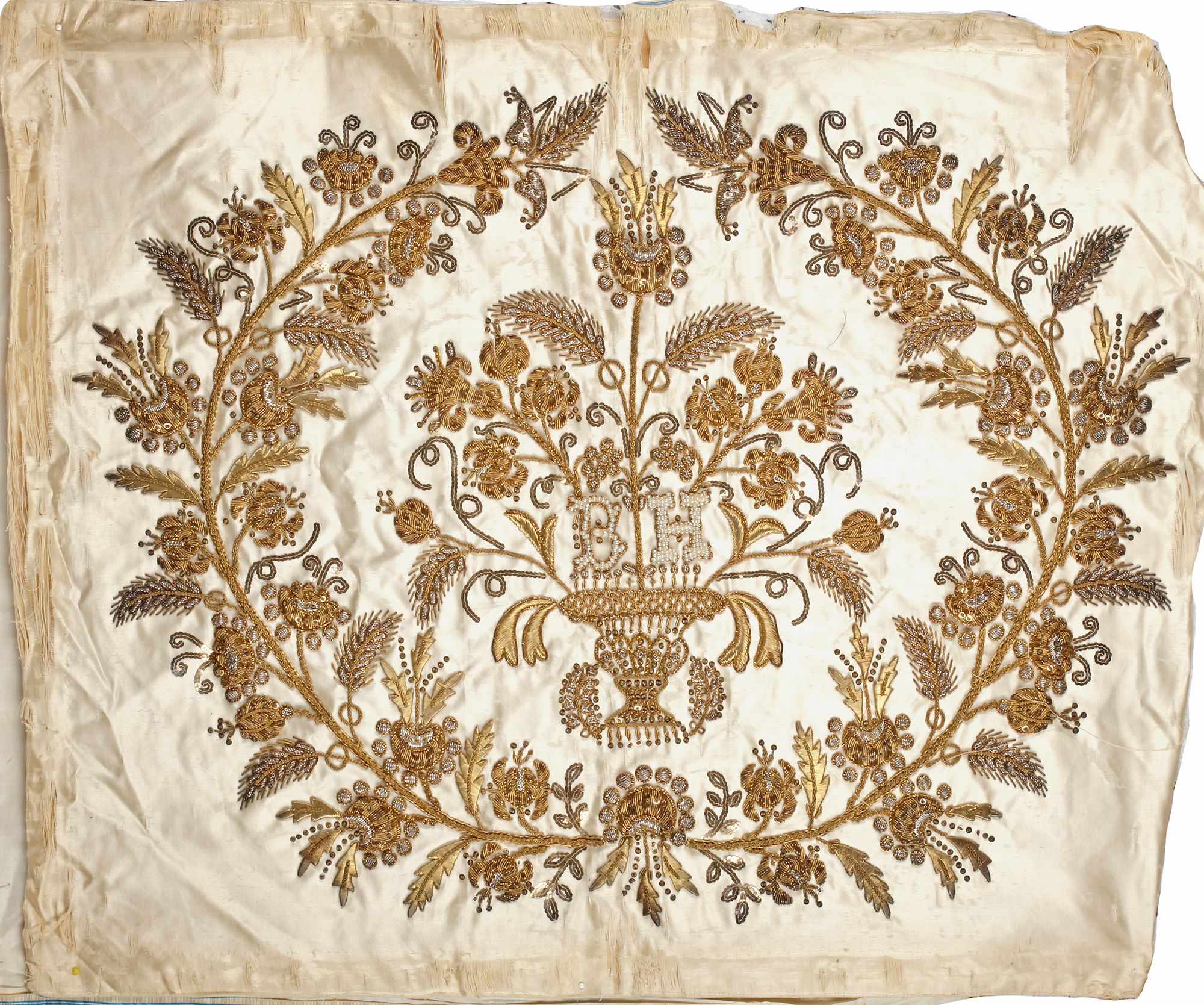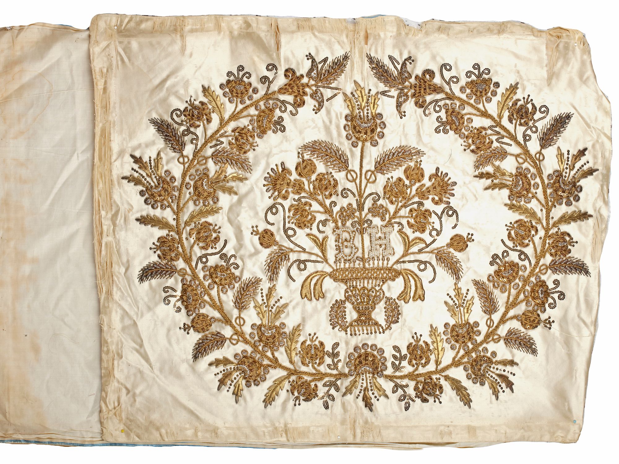 Two embroidered cushion covers, cream silk satin embroidered in yarn and gold cane of a flowered cut in a crown of flowers, ears of wheat and pomegranates; initials BH embroidered in seed pearls, (acc., oxidized embroidery on one). The larger one: 54 by 68 cm. The smaller one: 50 by 60 cm.