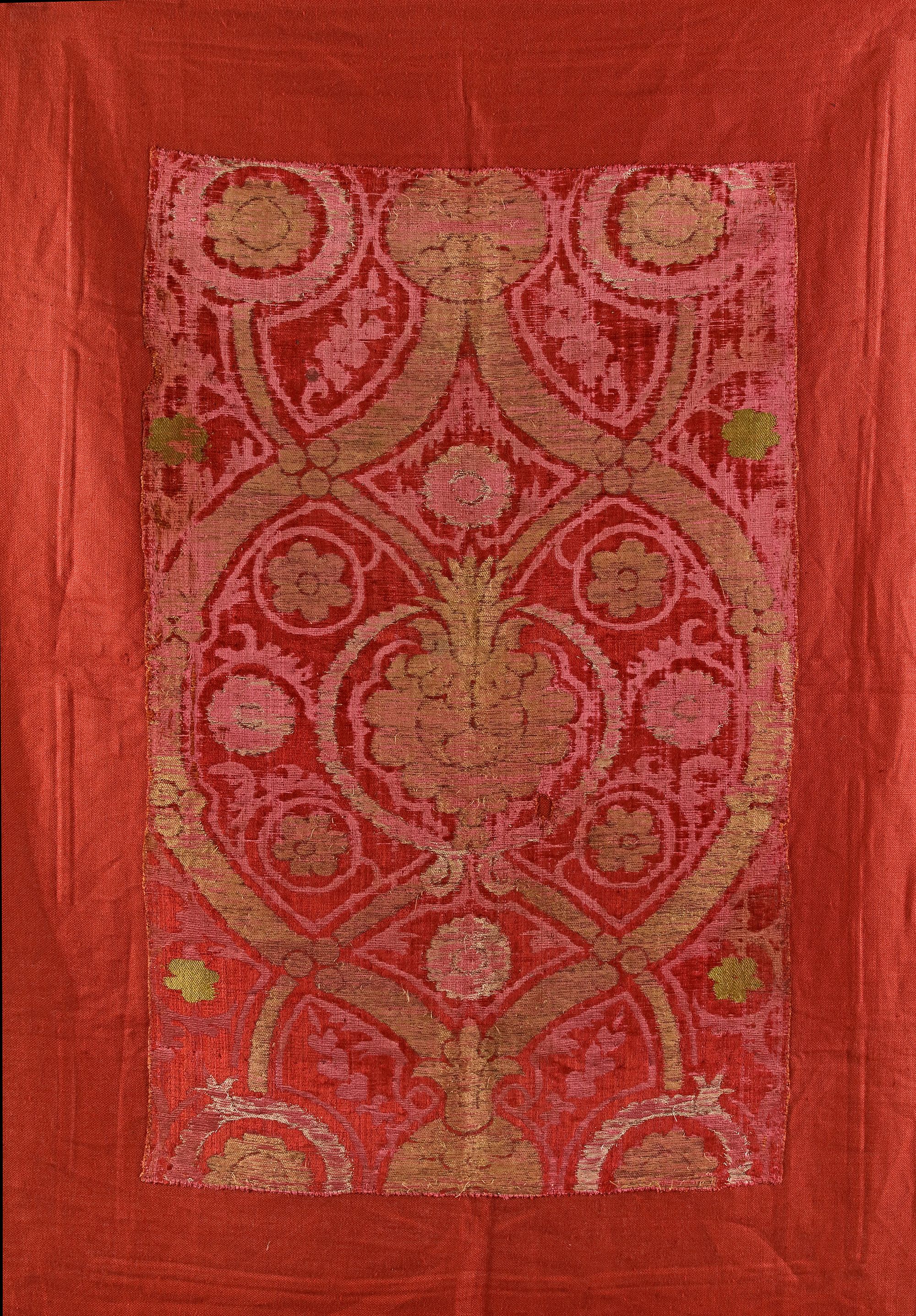 The red ground with an ogival lattice of gold strapwork containing a fine triangular diaper, the lattice enclosing flaming ogival medallions with carnation sprays on gold ground around a central floral medallion,