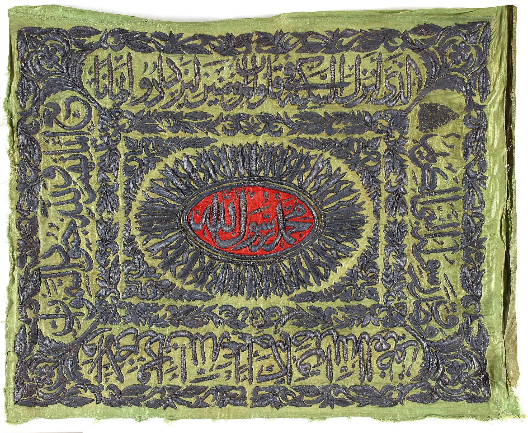 Rectangular form, the green ground embroidered with silver metal threads with central oblong red ground cartouche enclosing Muhammed is Allah messenger framed by cartouches with 48 Quran surah Al-Fath v.4 with foliate scrolls and wreaths.