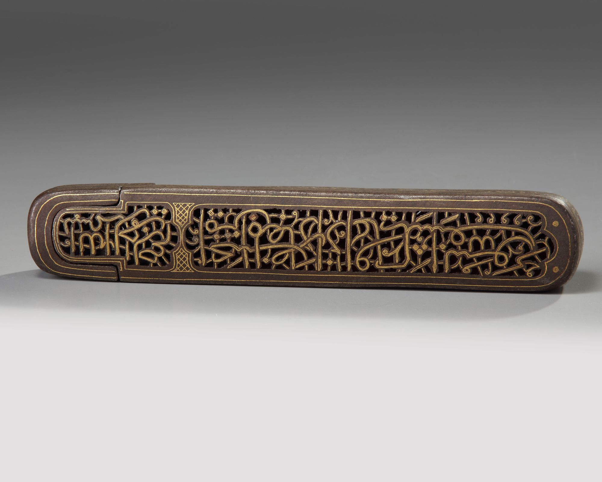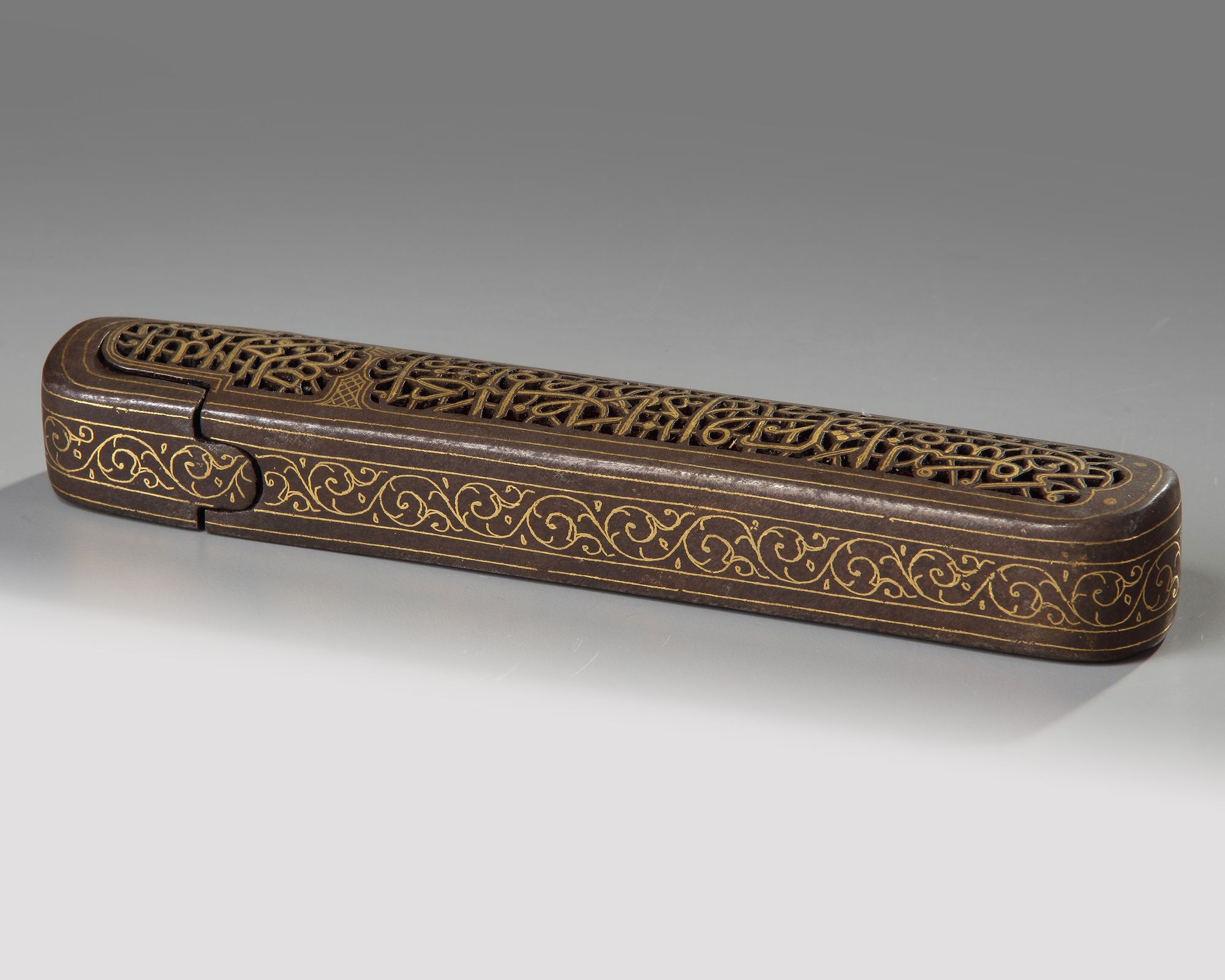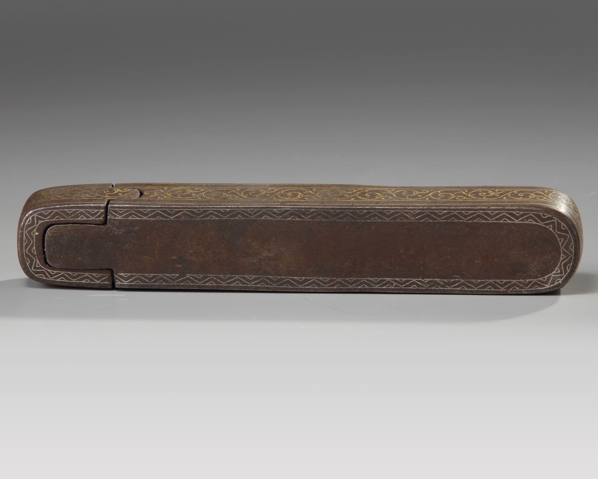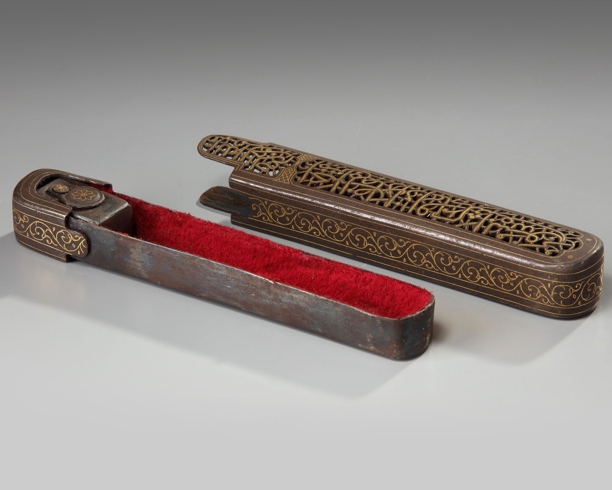 An Islamic gilt metal Qalamdan or pen box with Inkwell and matching box. The front of the qalamdan bears various notations in Arabic calligraphy, Quran sura, of delicate artisan work. Gold decorations on the notations. Gold border. Both sides of the qalamdan have curvy and rounded gilt decorations.