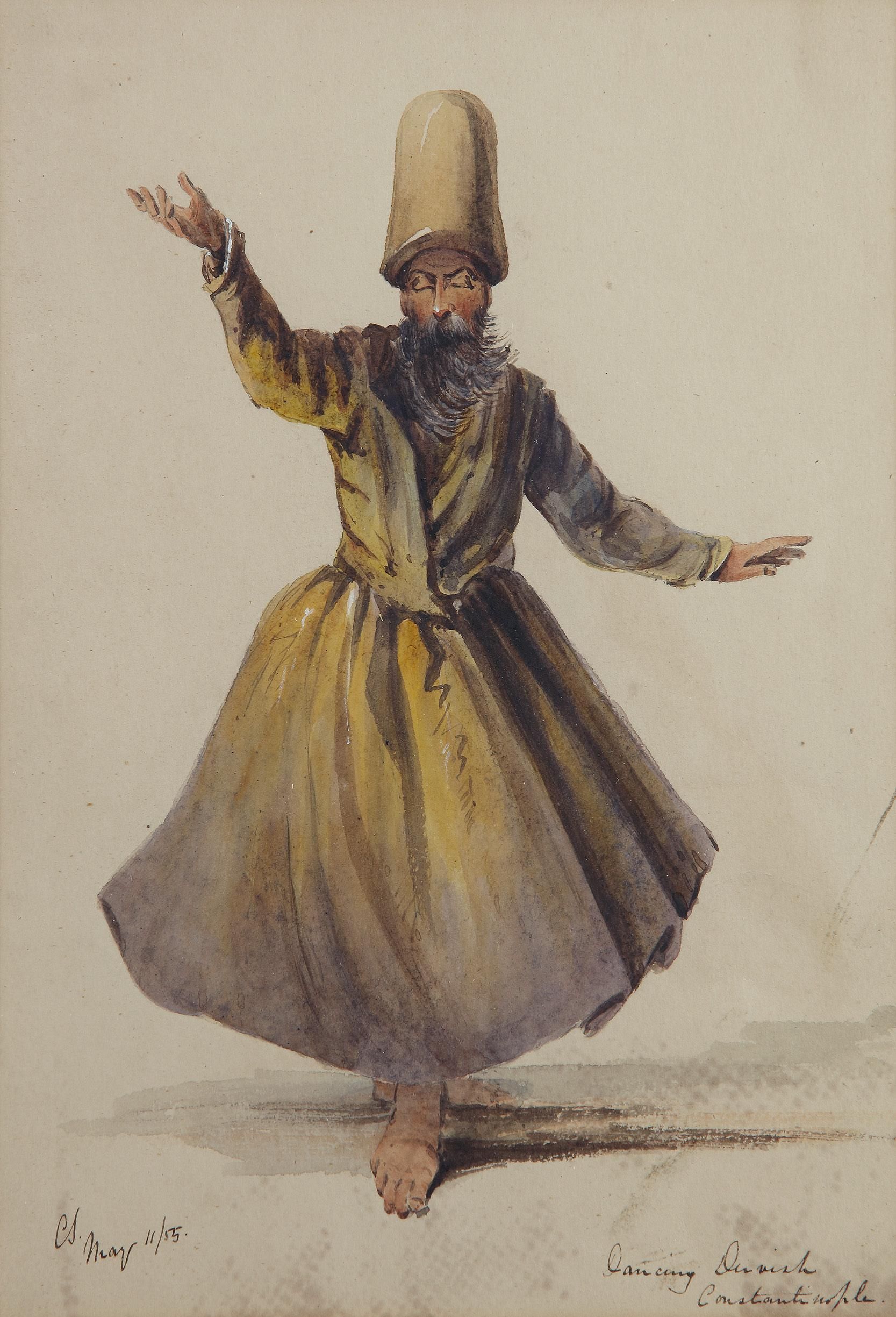 Two watercolours representing various figures with English annotations i.a. A Man reading / 'Dancing Dervish, Constantinople'. Watercolours.