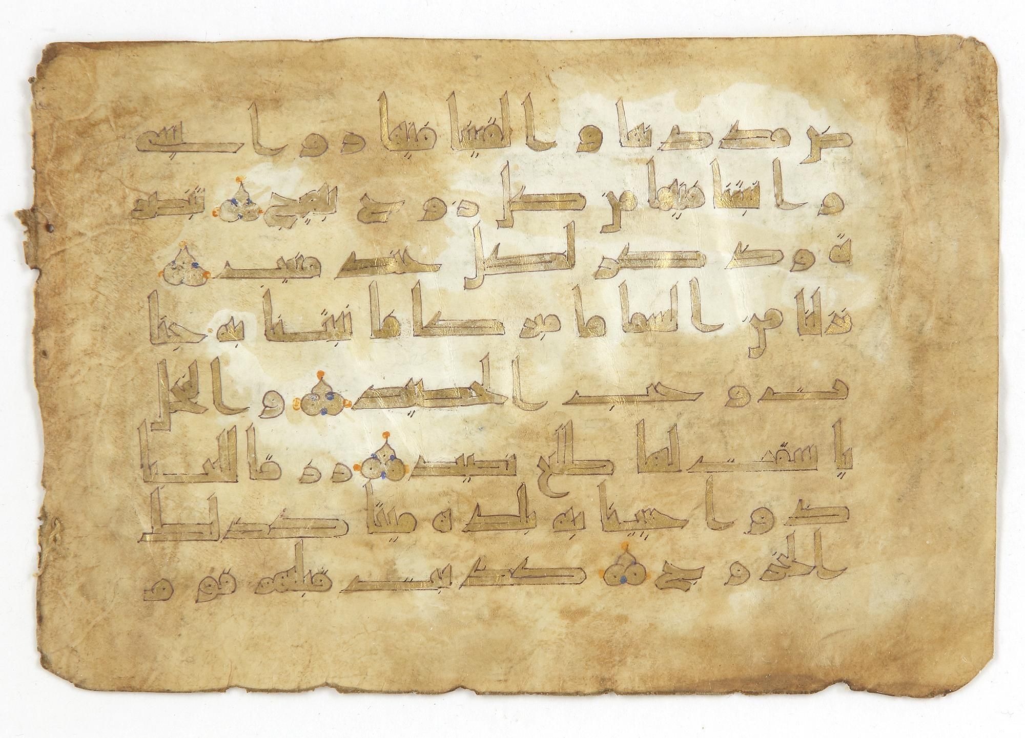 Arabic manuscript on vellum, 8 lines to the page, written in gold Kufic script outlined in brown.