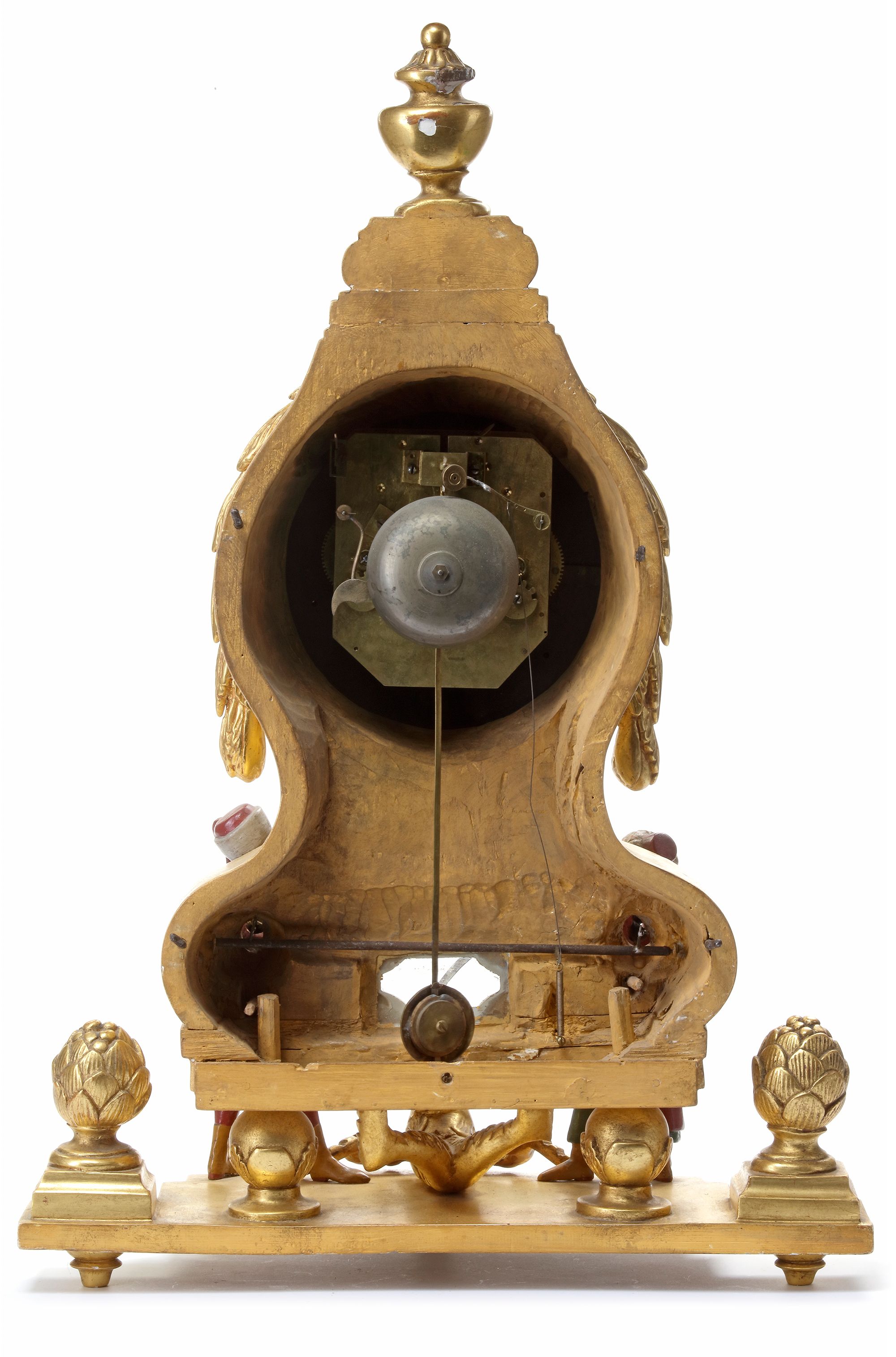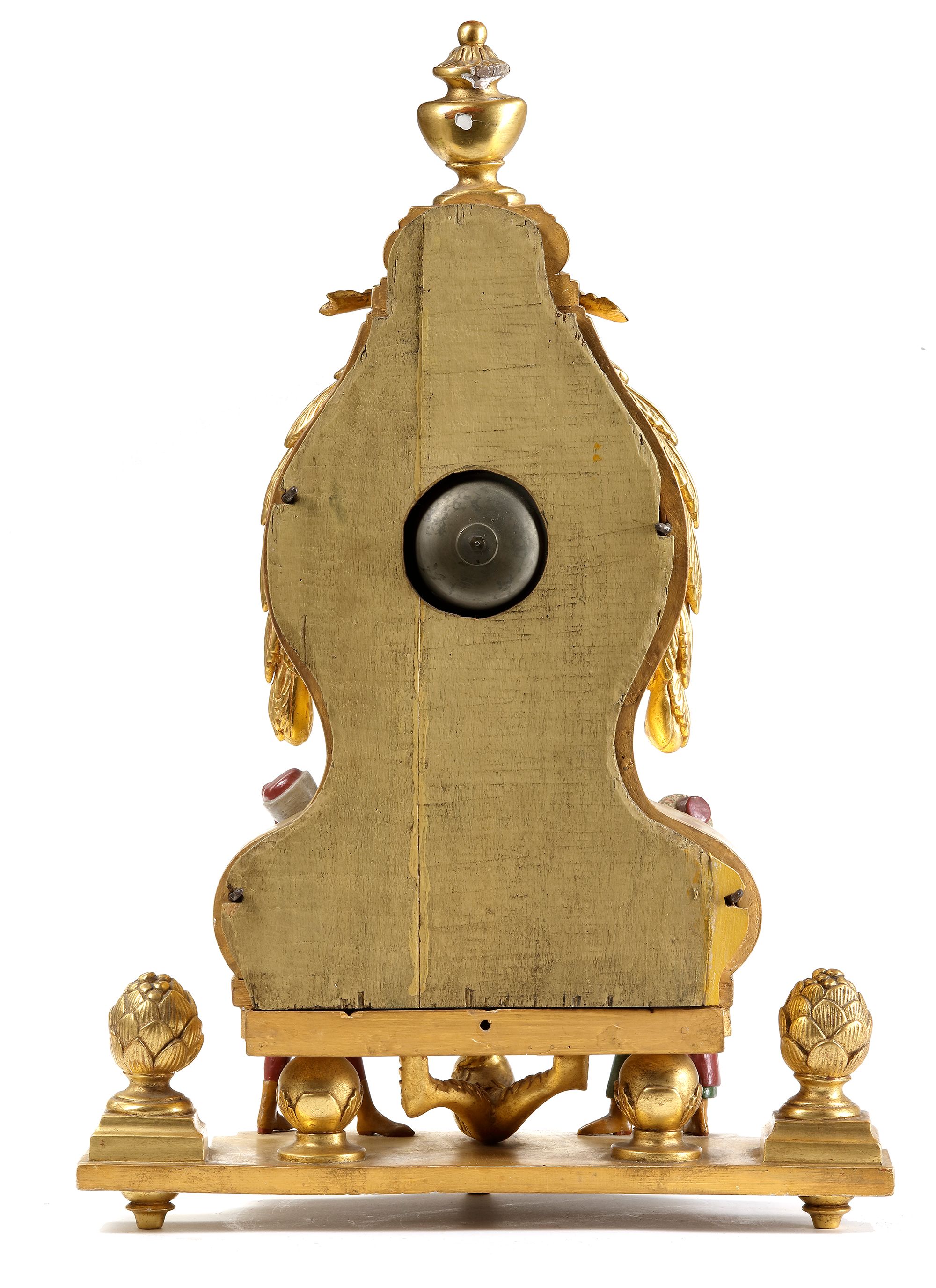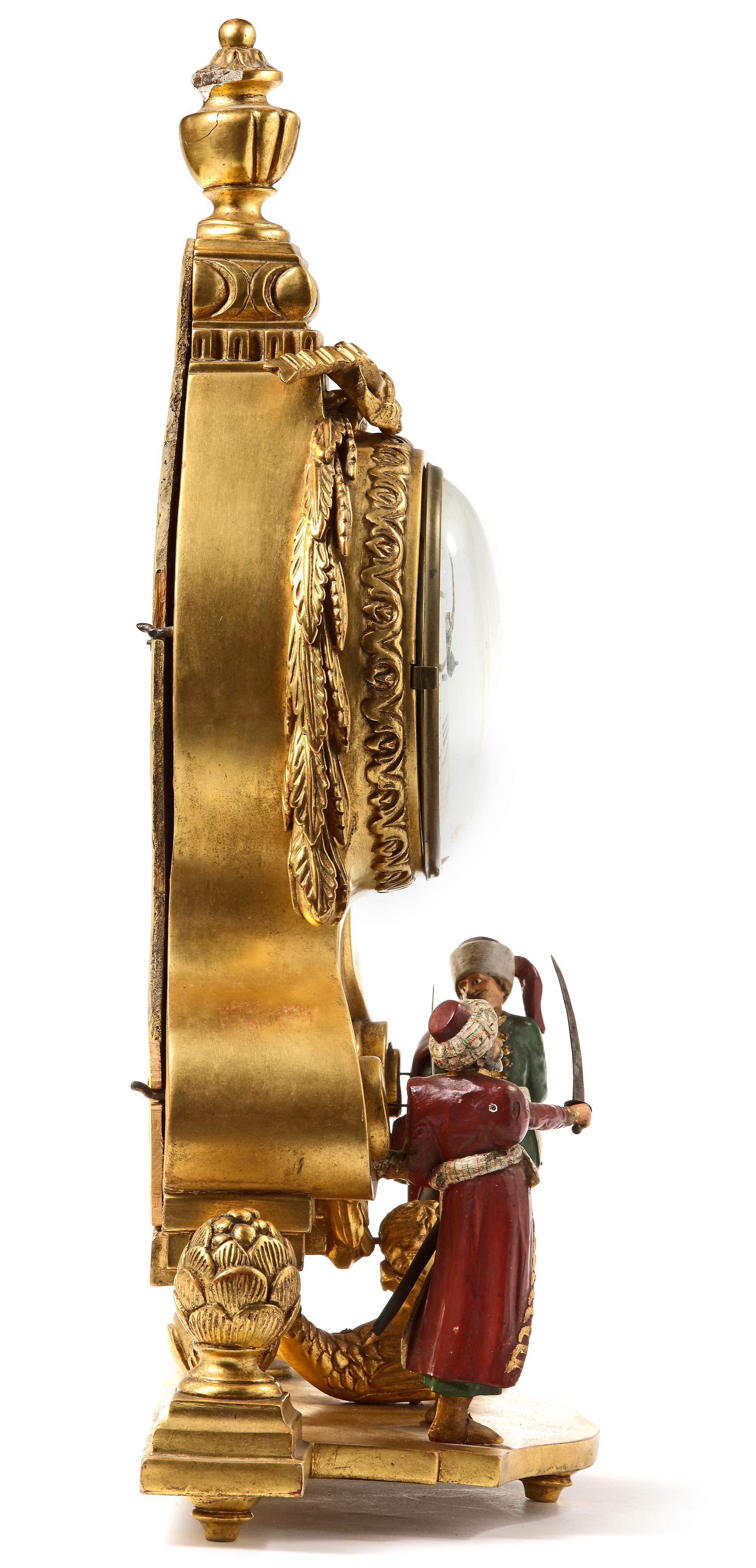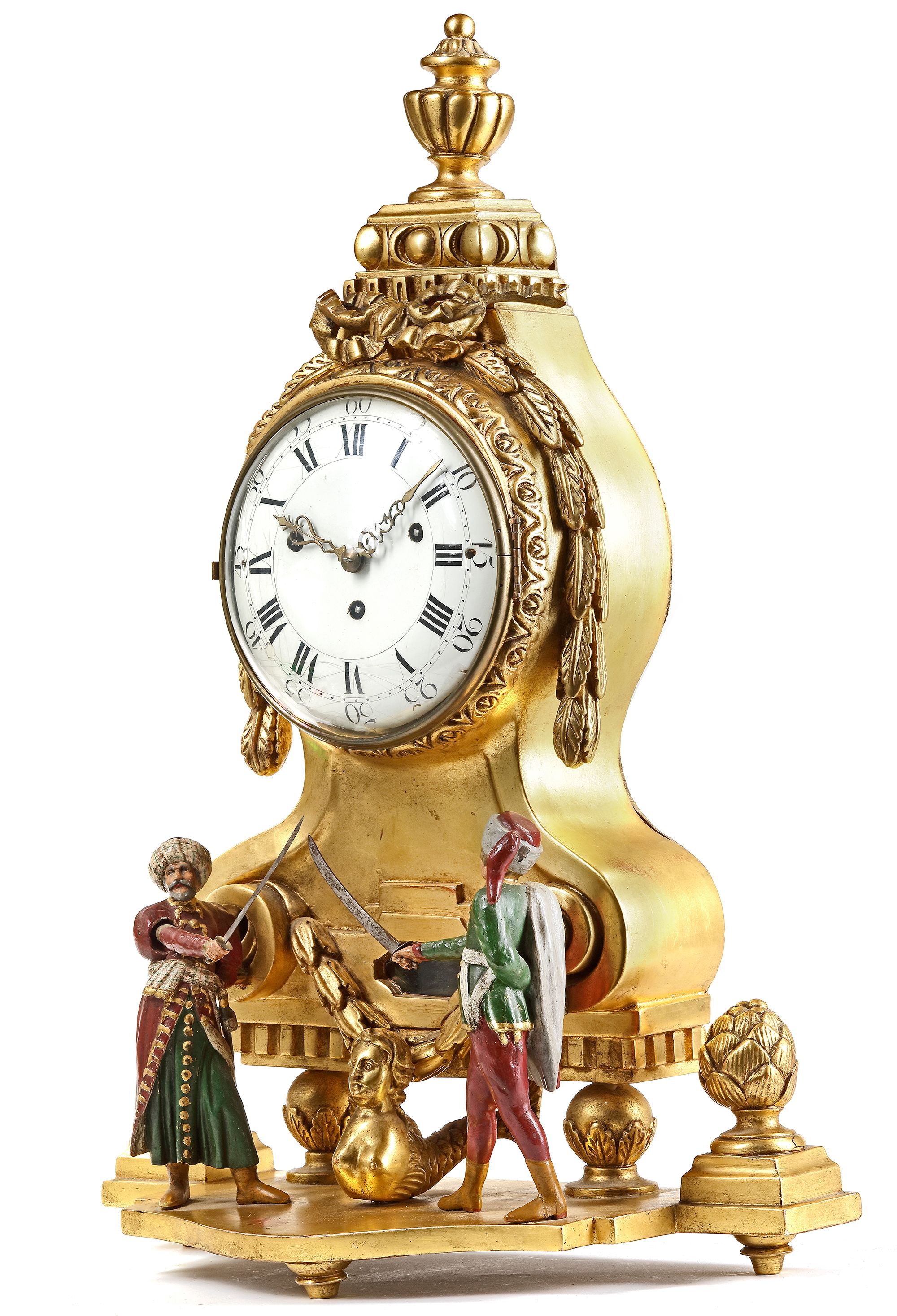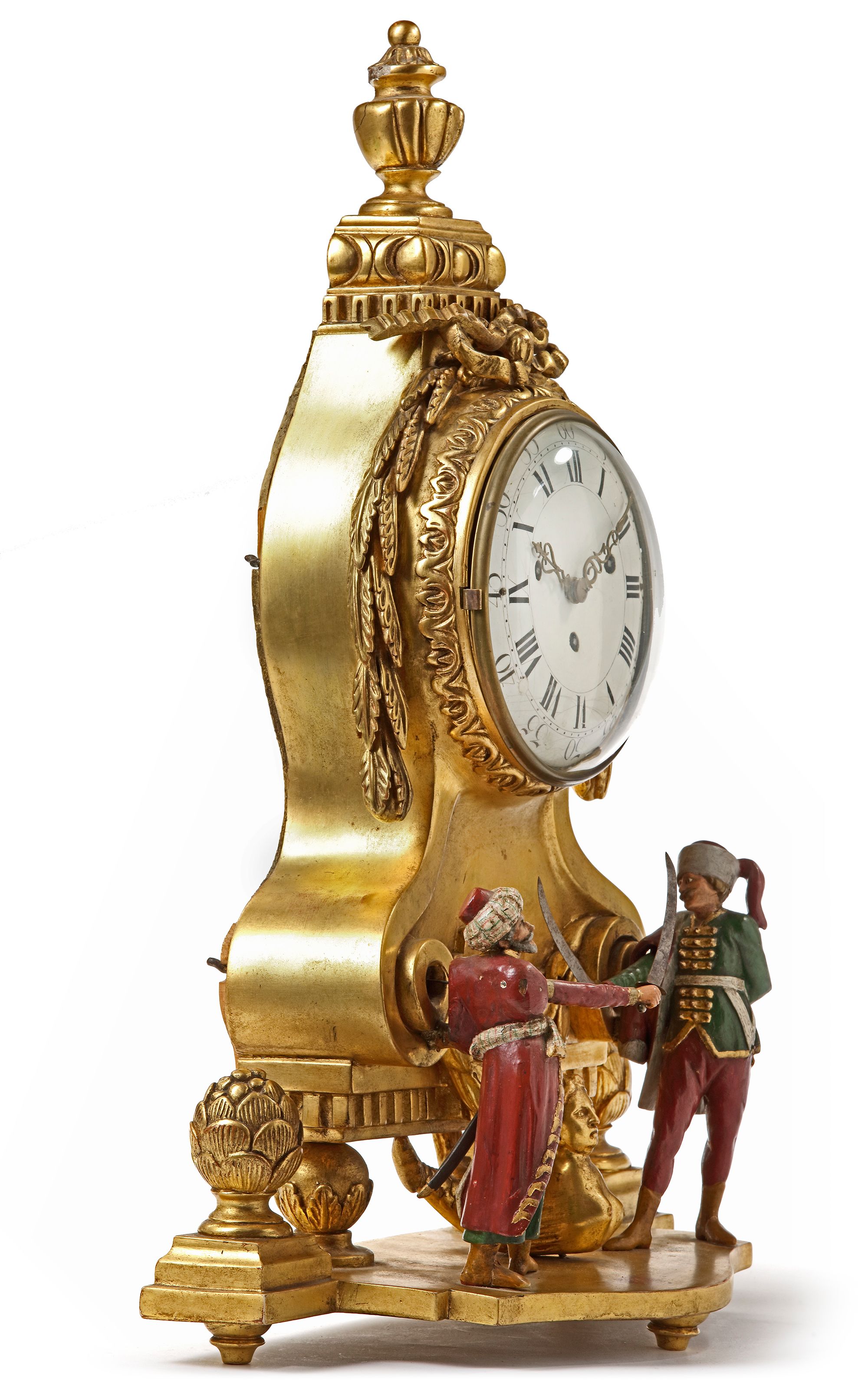 A gilt wooden table-clock for the Ottoman market, decorated with two Ottoman figures holding moveable swords. The clockwork is French, early 19th century. The housing and mechanism for the moving swords, South-Germany/Austria, early 19th century.