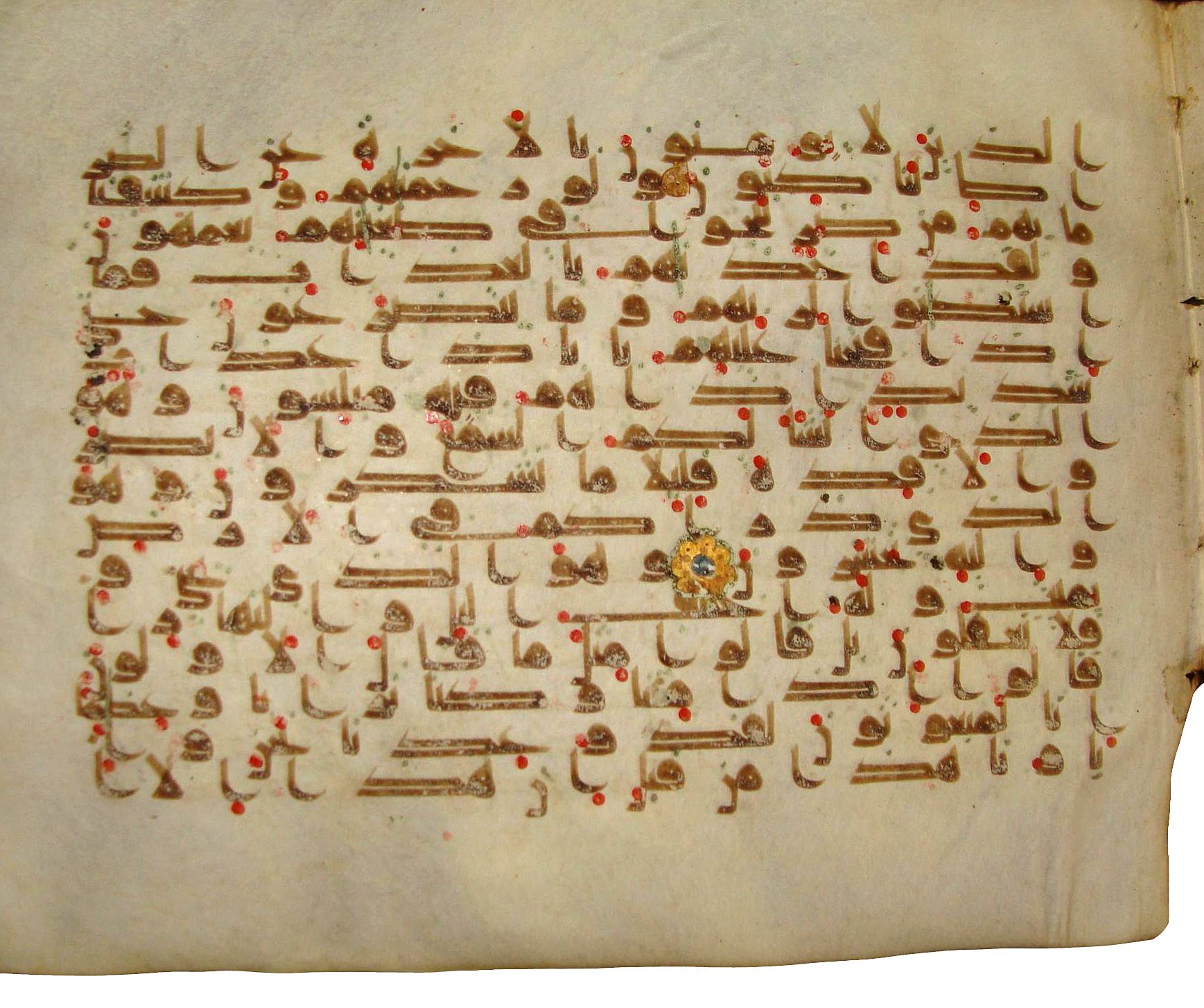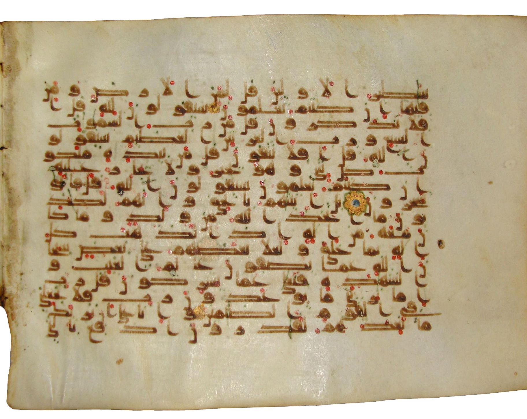 CATALOGUE NOTE The origins of this particular dispersed Quran have never been definitively identified as Near Eastern or North African. Its script follows many characteristics of North African Kufic scripts from the period, however the elongating of letters to this unusual form is a characteristic much attributed to leaves copied in contemporary Damascus (see F. Déroche, The Abbasid Tradition: Qurans of the 8th to the 10th Centuries, 1992, pp. 44-47). For other leaves from the same Quran have been for sale on several auction houses.
