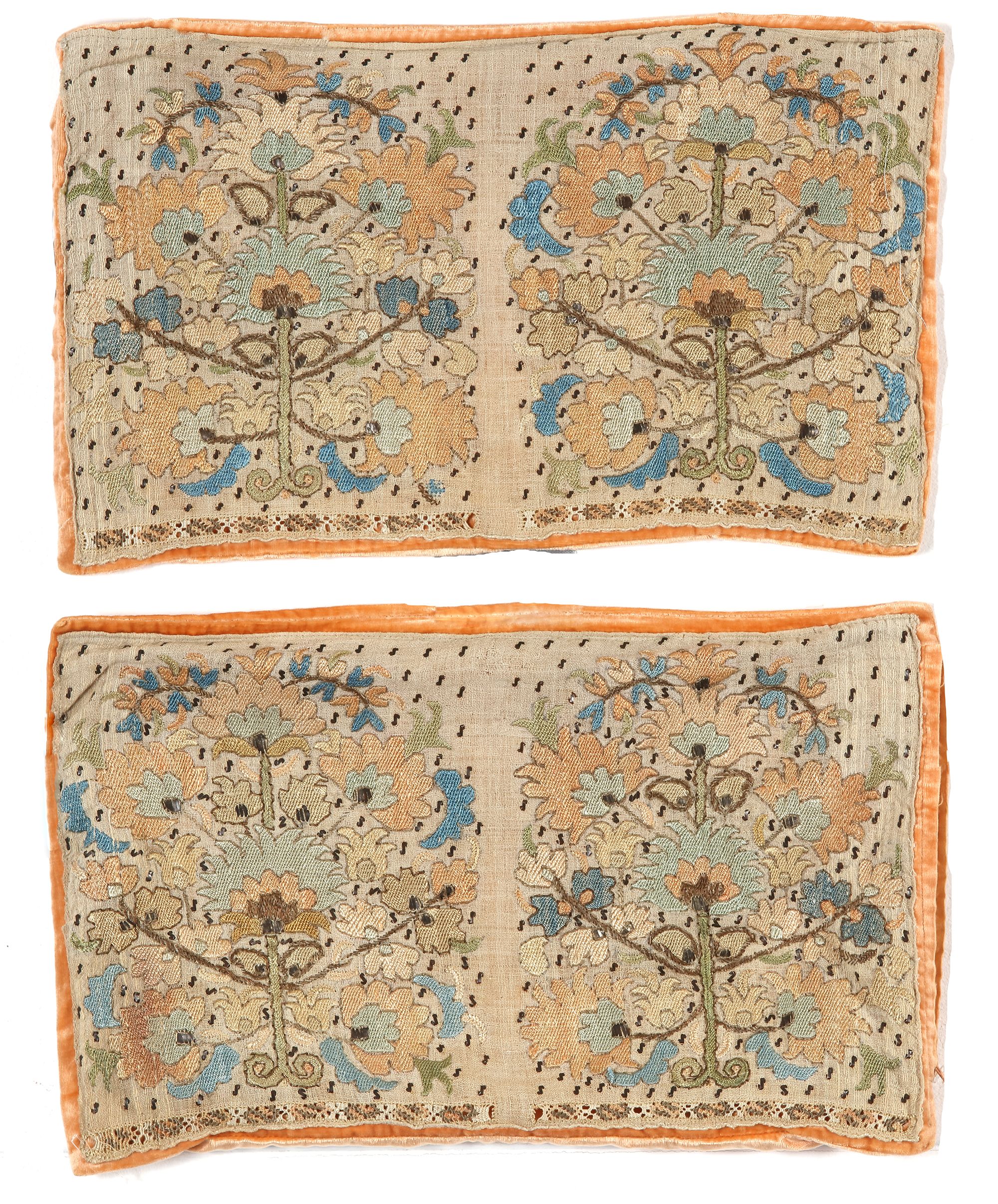 Cotton embroidery on linen and velvet reverse. Decorated with floral sprays, in pastel colours. 26 x 44 cm.