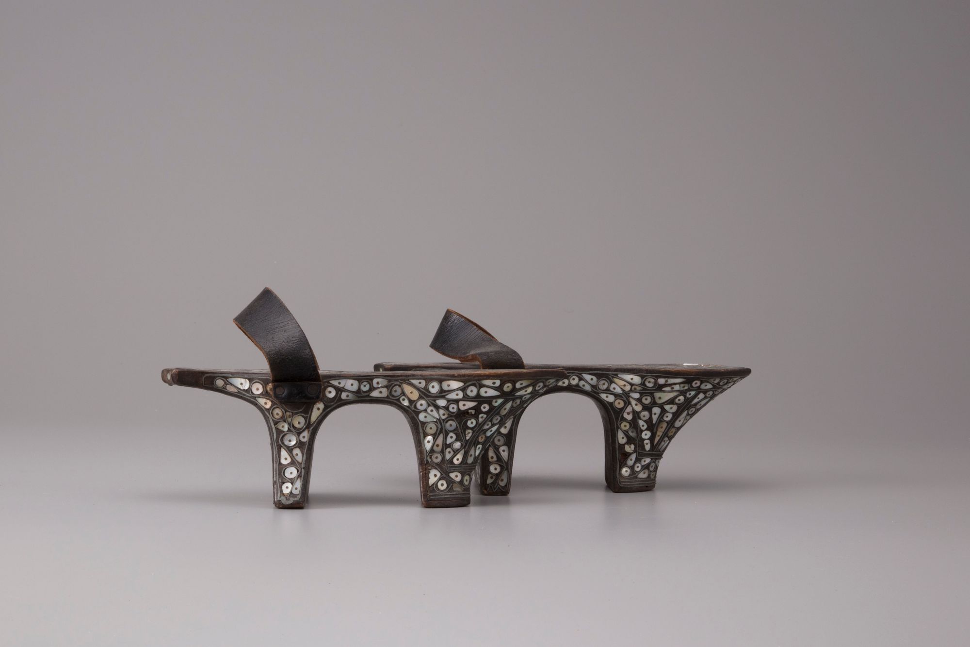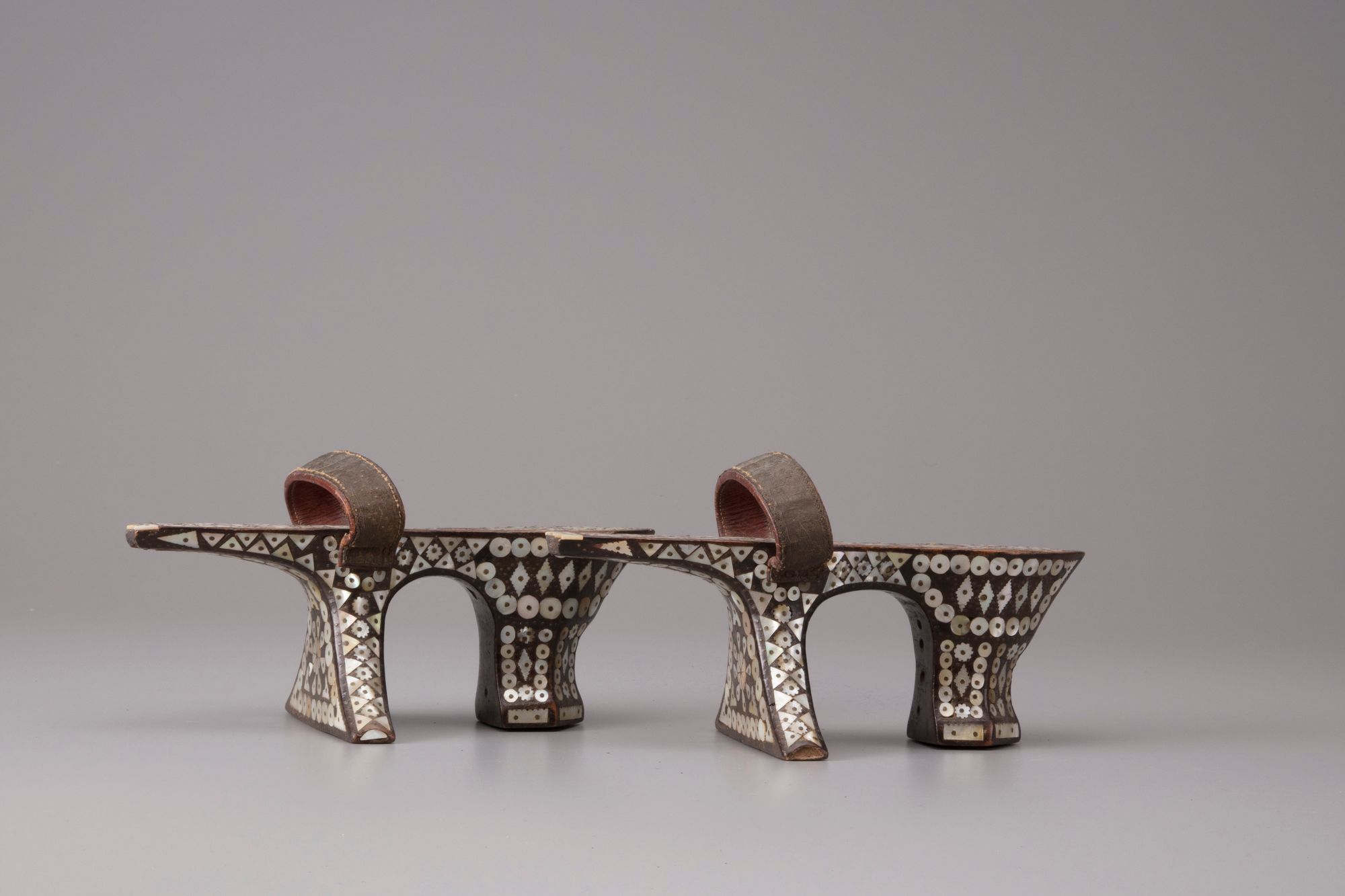 Each with flat base resting on twin splayed trumpet feet, the surface decorated with geometric shapes in mother-of-pearl, each with leather strap.