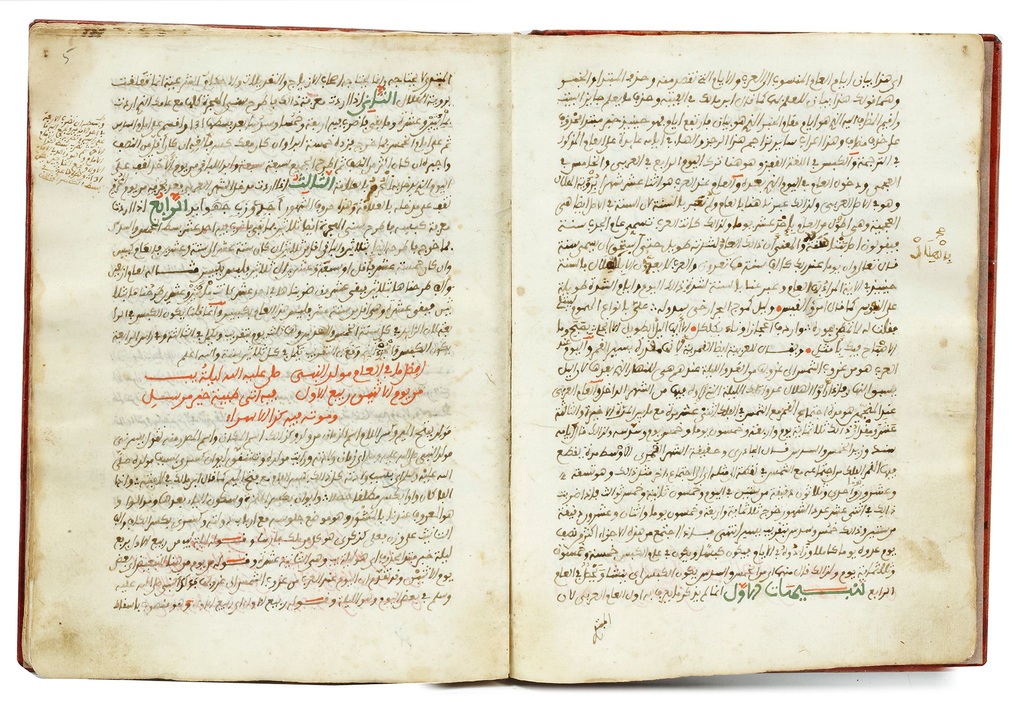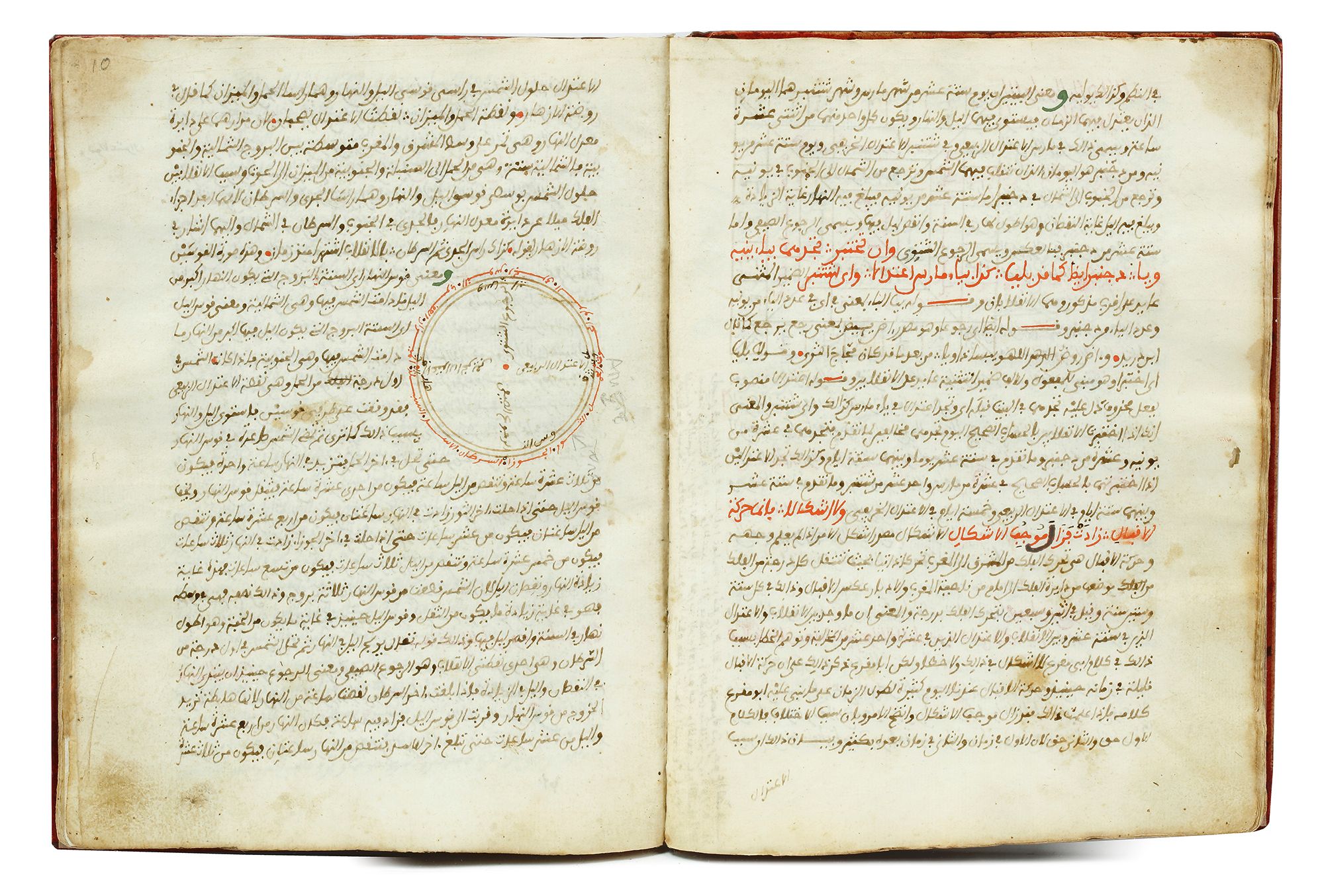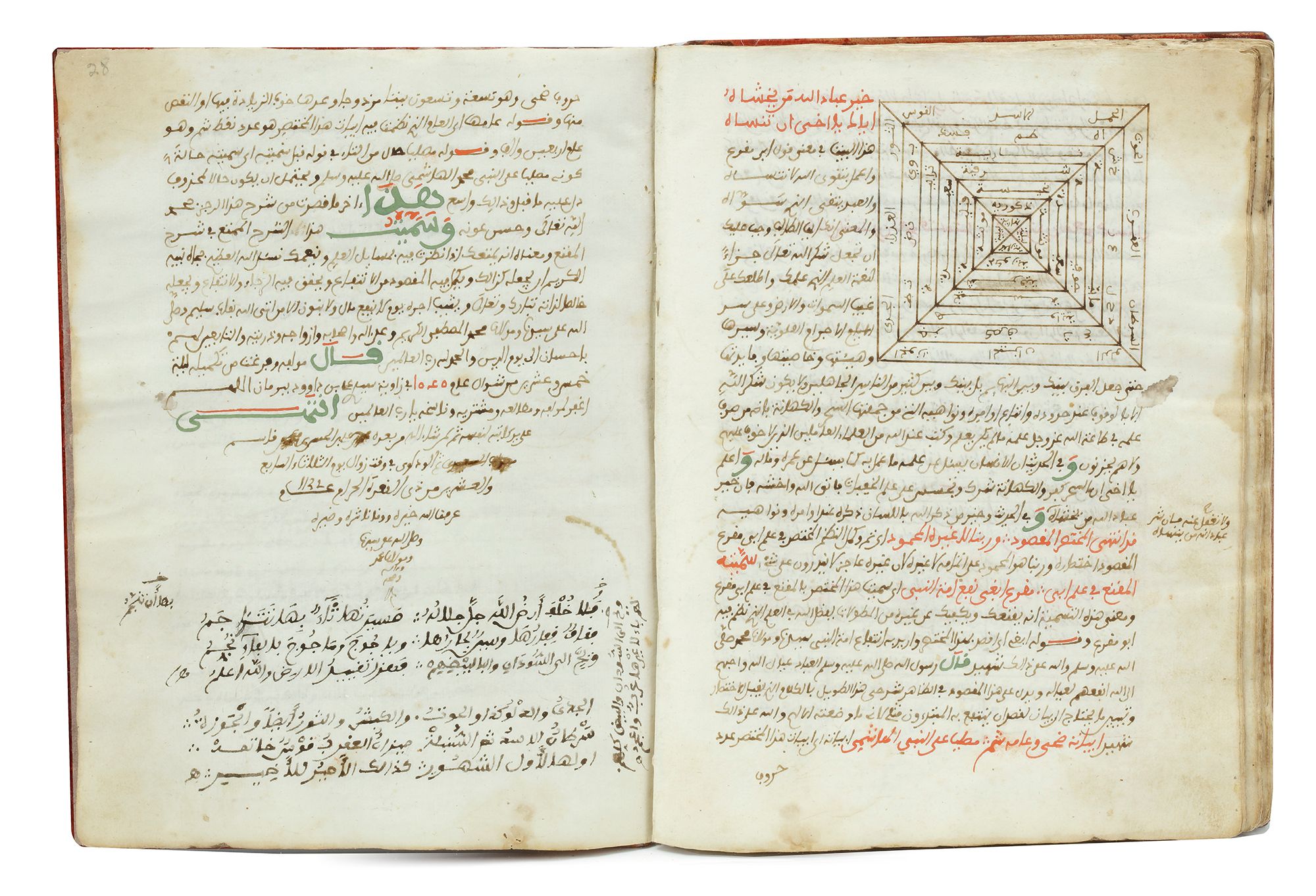 Tables and drawing in red, green and brown ink. Throughout the book Arabic poems in red ink.