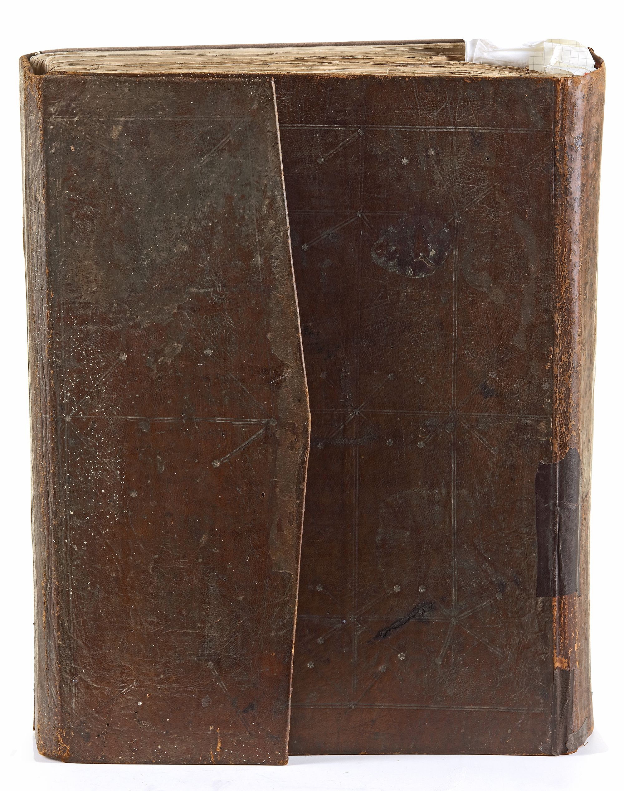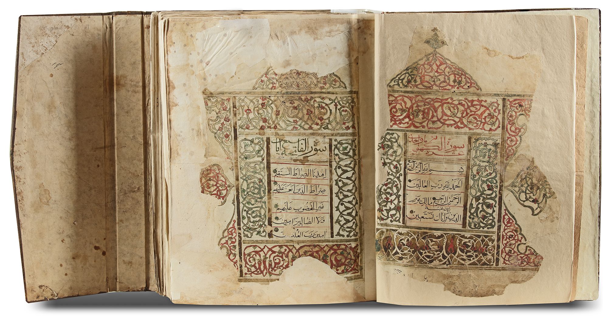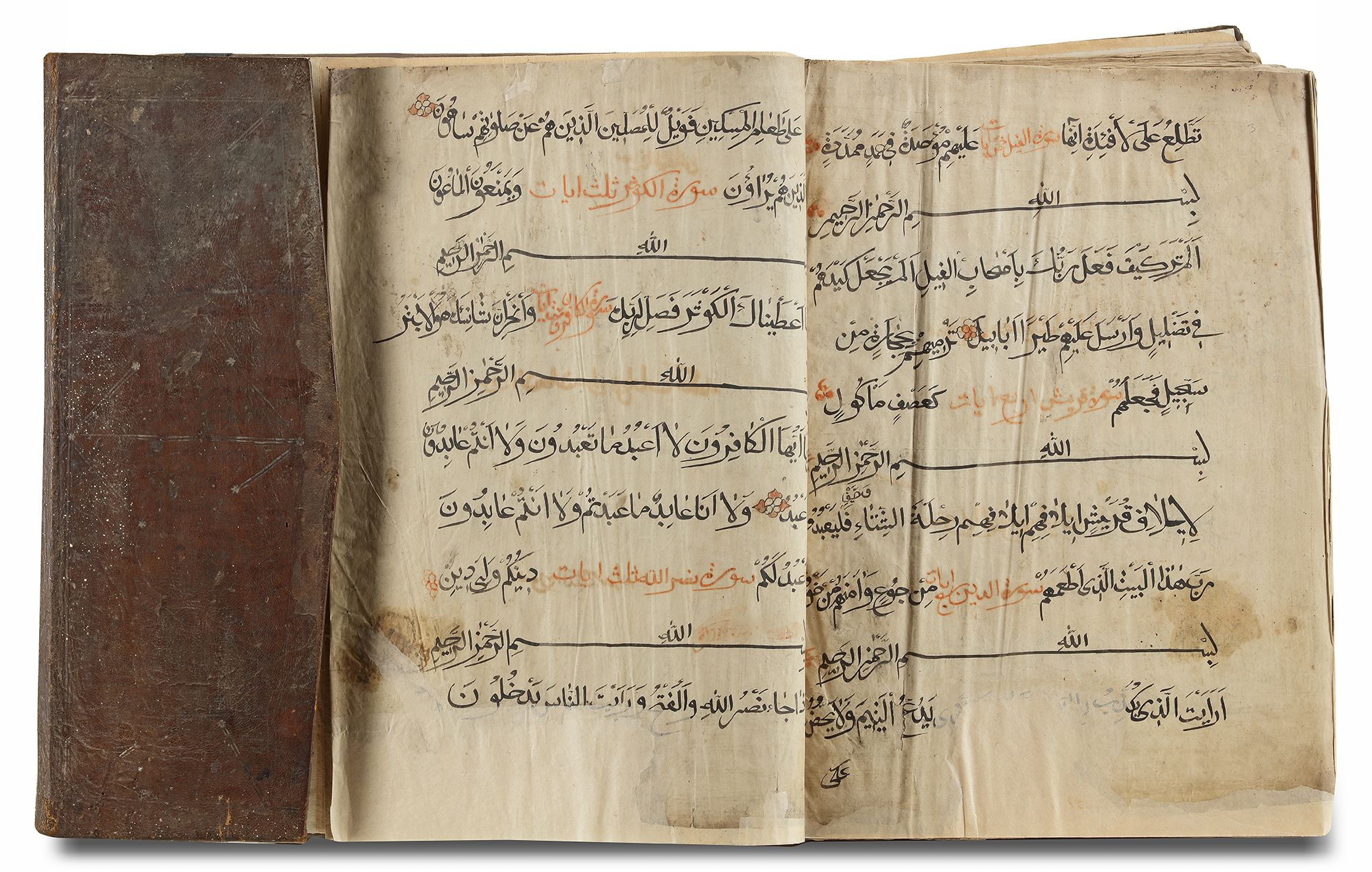 An Arabic manuscript on paper, with 10 lines to each page, written in black naskh script, polychrome verse markers. Two opening biofolia with blue and dark green decoration, marginal occasional notes marking 'khums, 'ash and juz'. Brown morocco leather binding with a flap. 33 by 43 cm.