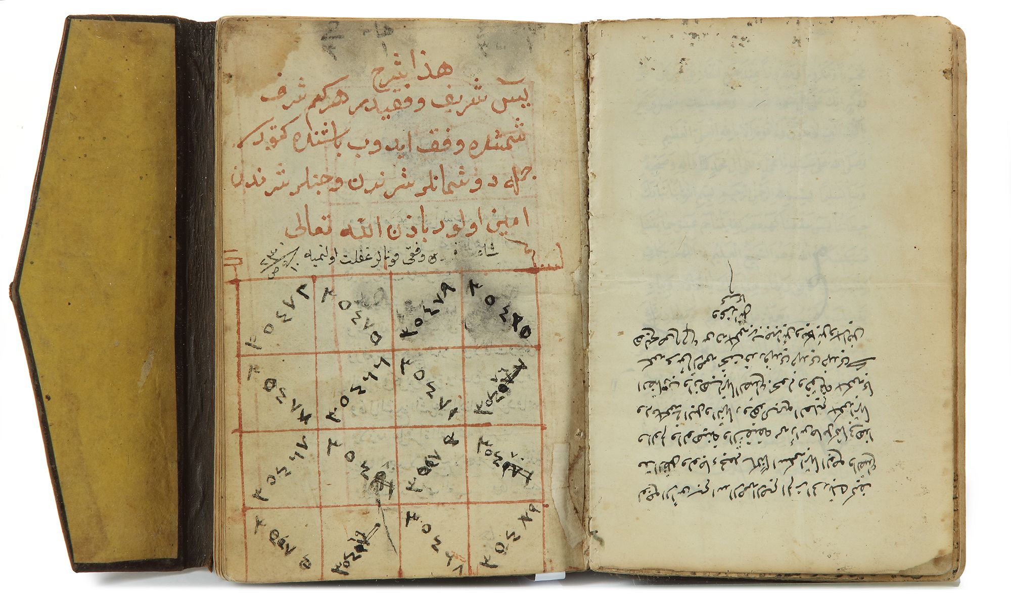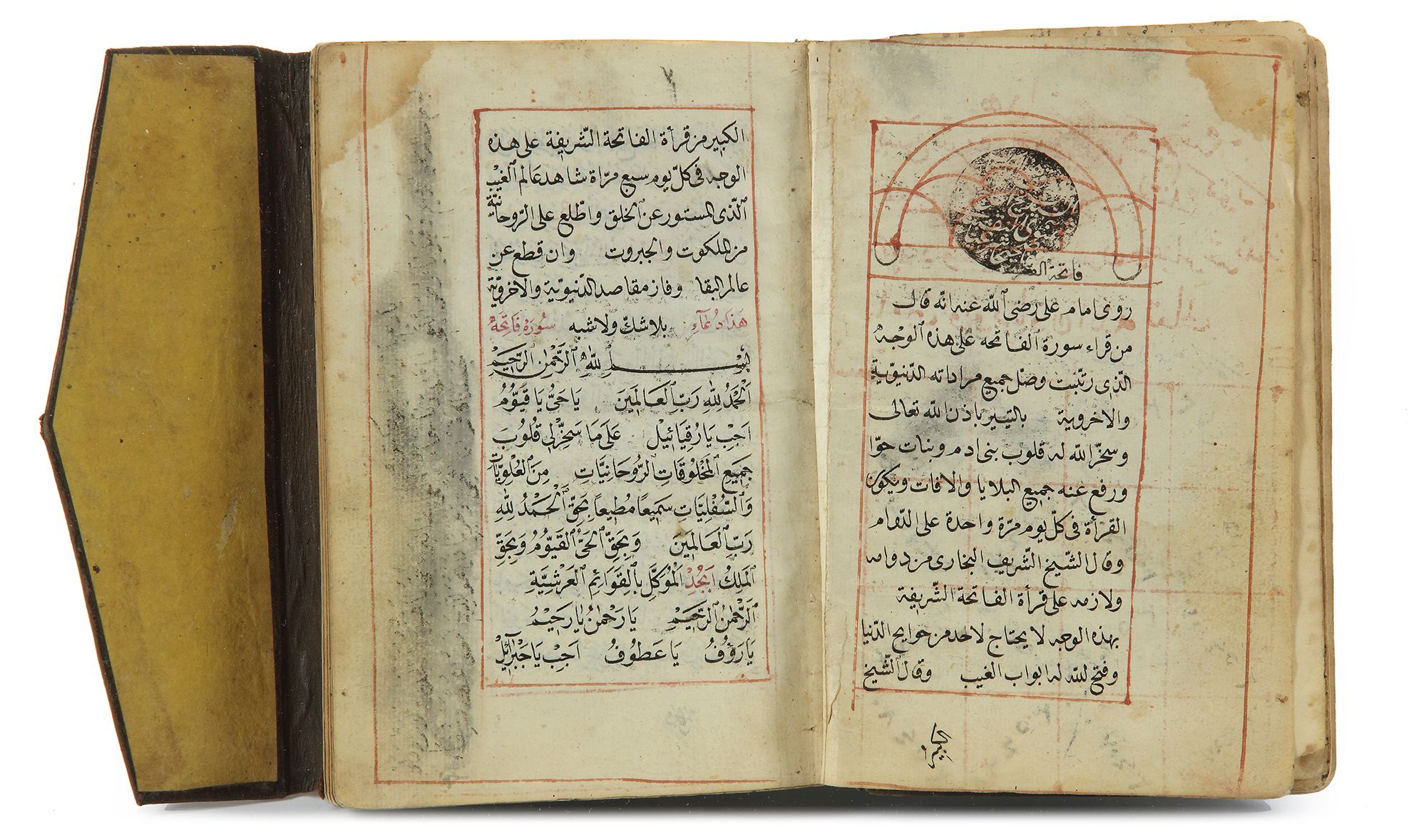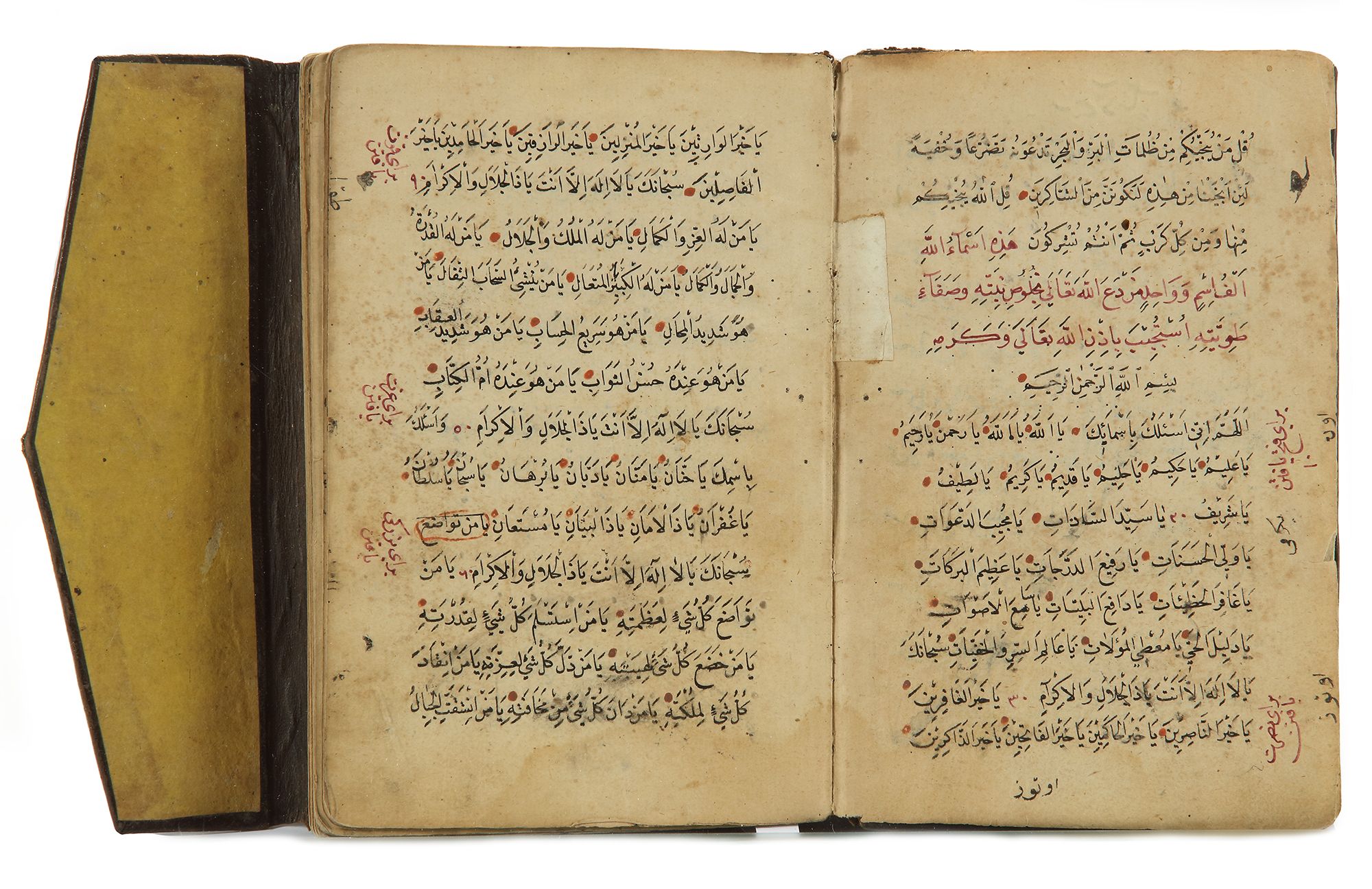 Arabic manuscript on paper, 100 leaves with 15 lines to each page, written in black naskh script with catch words in red ink within a red border. Talismanic numbers tables with with occasional marginal notes, contains many well-know prayers with the names of Allah. 18 by 12 cm.