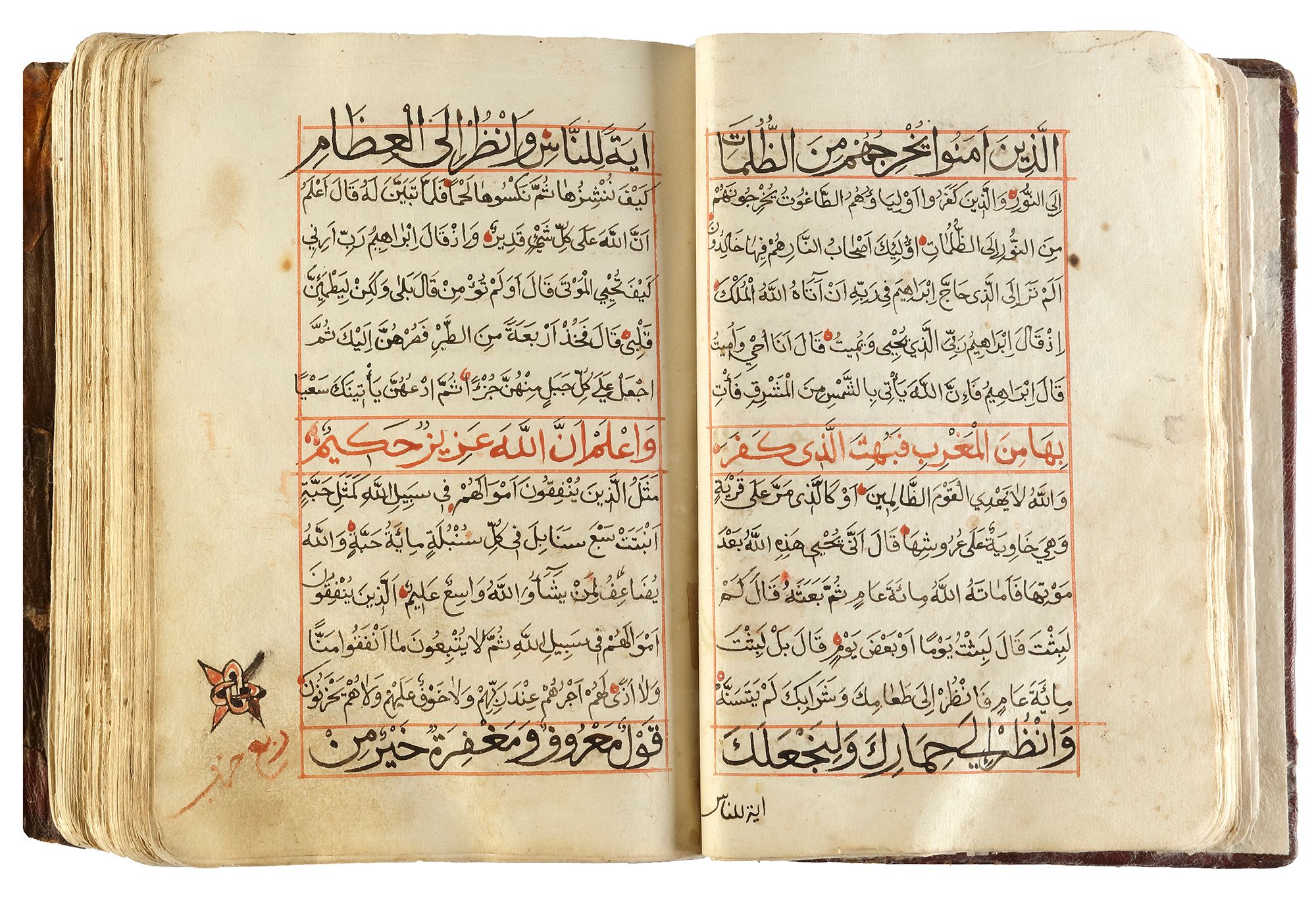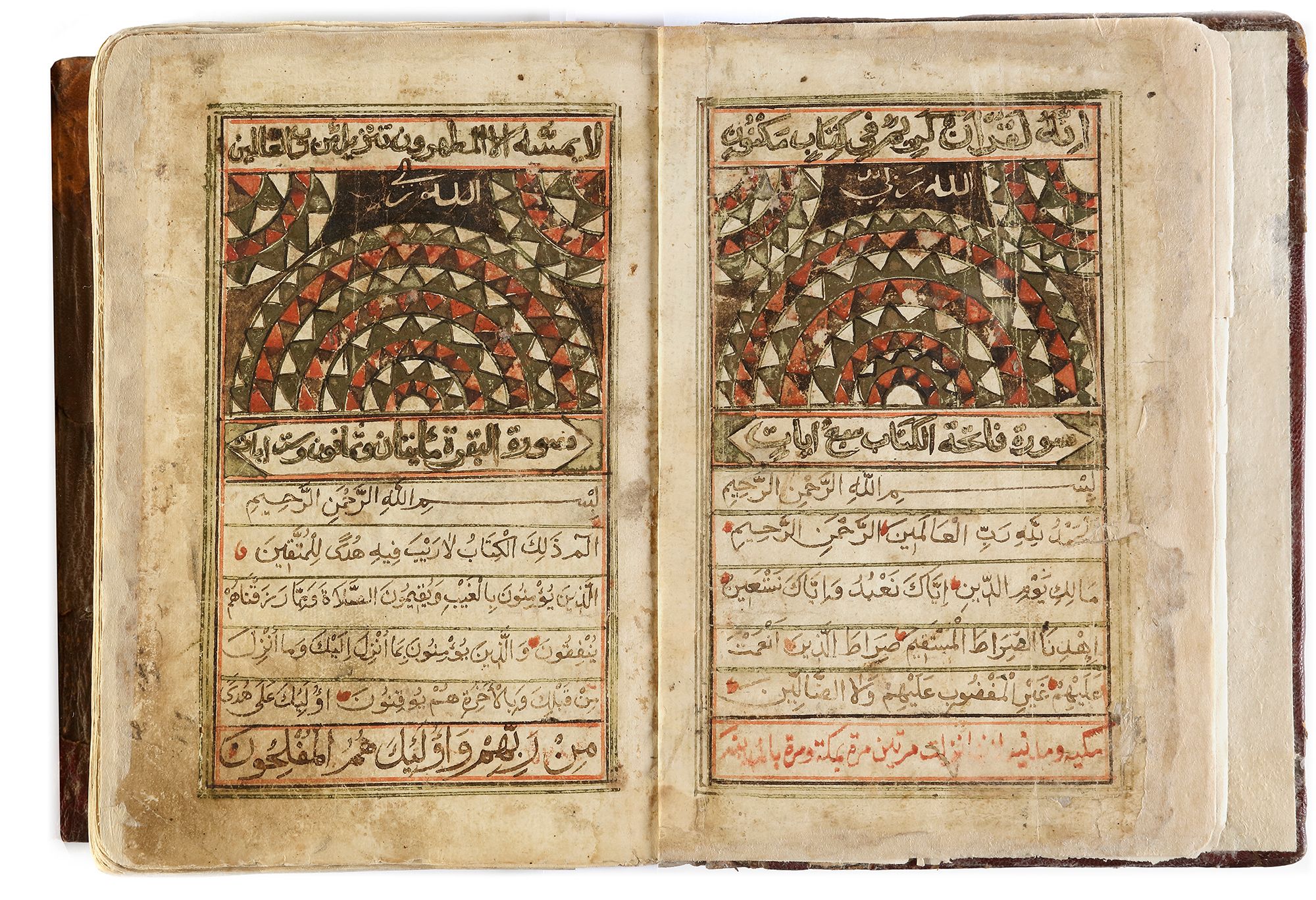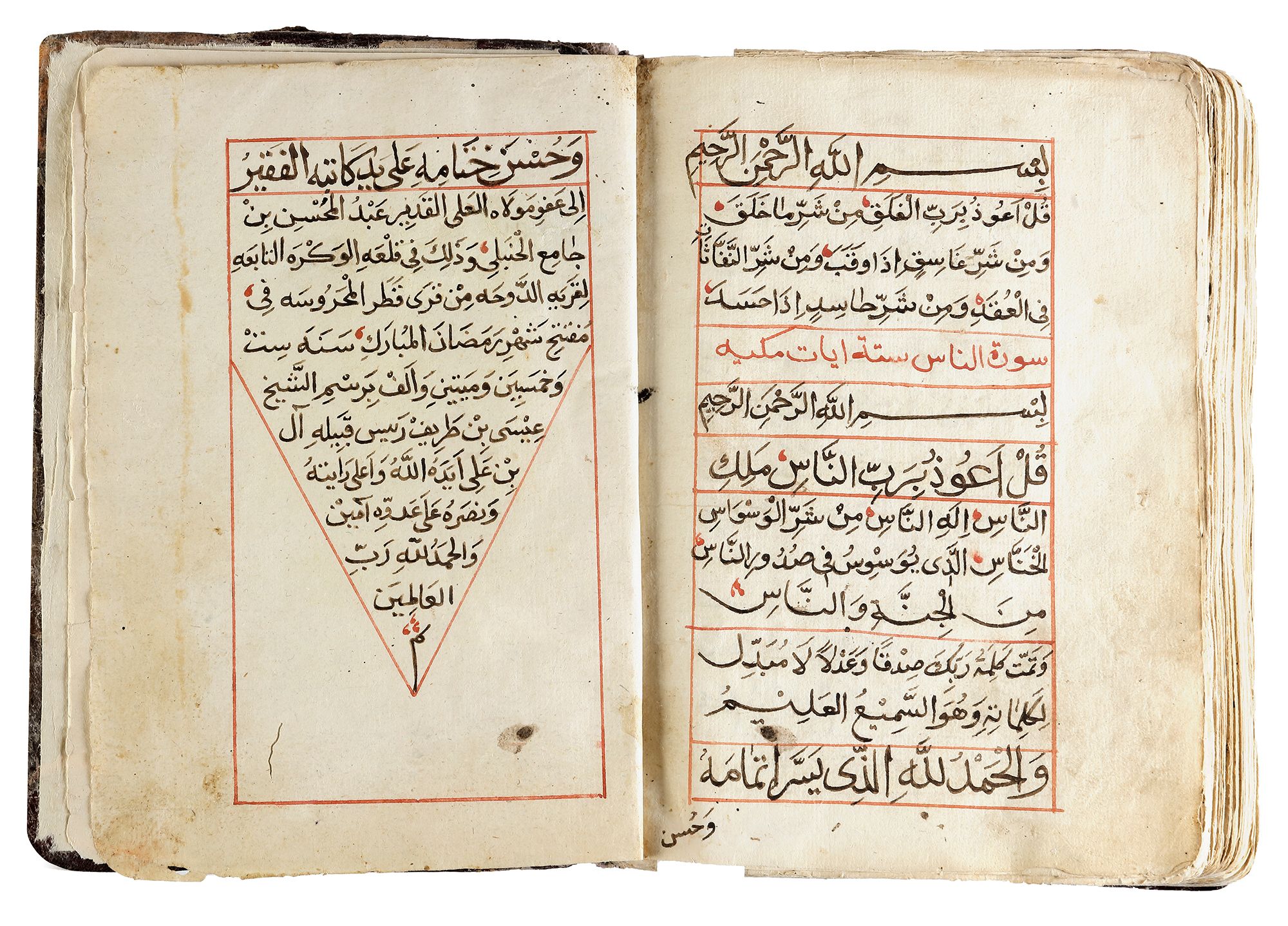 Arabic manuscript on paper, a complete Quran, 13 lines to each page, written in black Najdi naskh style, surah headings in red ink, all ruled in double red border. Red roundel verse markers, two opening pages with green and red decoration, no missing pages. Written by Al-Sheikh Abdul Mohsen bin Jami'a alhanbali in Alwakrah village nearby Doha in Qatar in 1256 AH/1840 AD, written for a well-known member of the Al Bin Ali family, Sheikh Isa bin Hamad bin Tarif Al Bin Ali. He was the chief of Al Bidda (known today as Doha) the capital of Qatar, as well as the chief of the Al Bin Ali tribe from the beginning of the 19th century until his death in 1847. He was described by the political agents in the Persian Gulf as being one of the most energetic and powerful chiefs in the region. 22 by 16 cm.