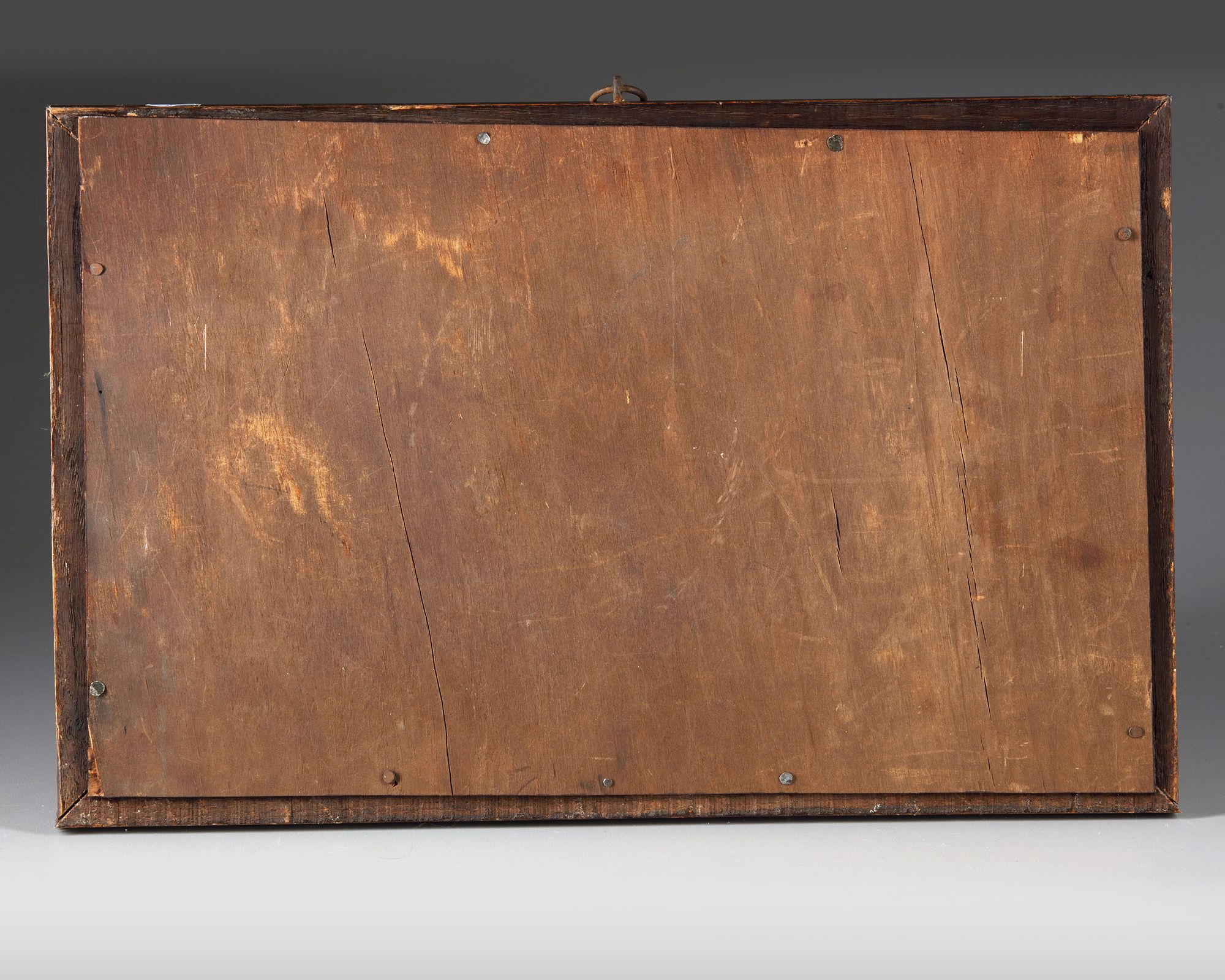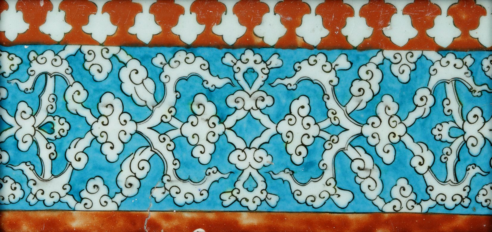 An Iznik tile of a rectangular form and decorated in turquoise and coral red with flower scrolls and Arabesques.