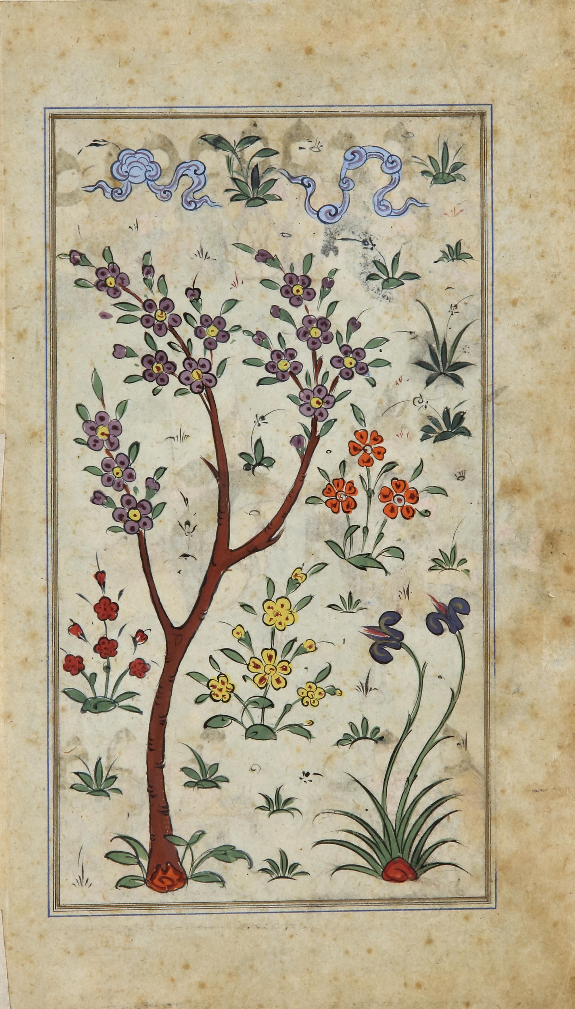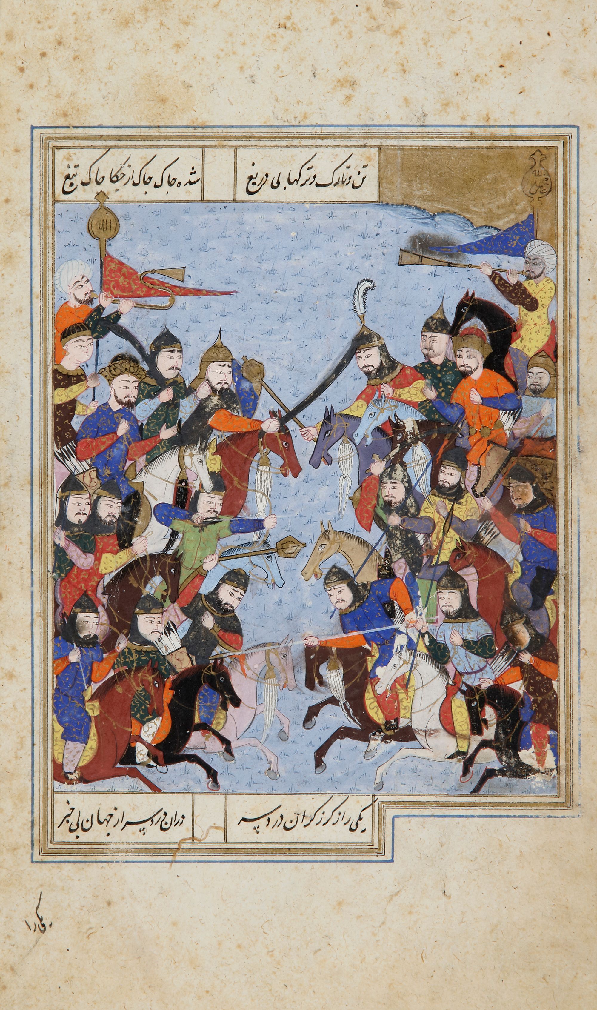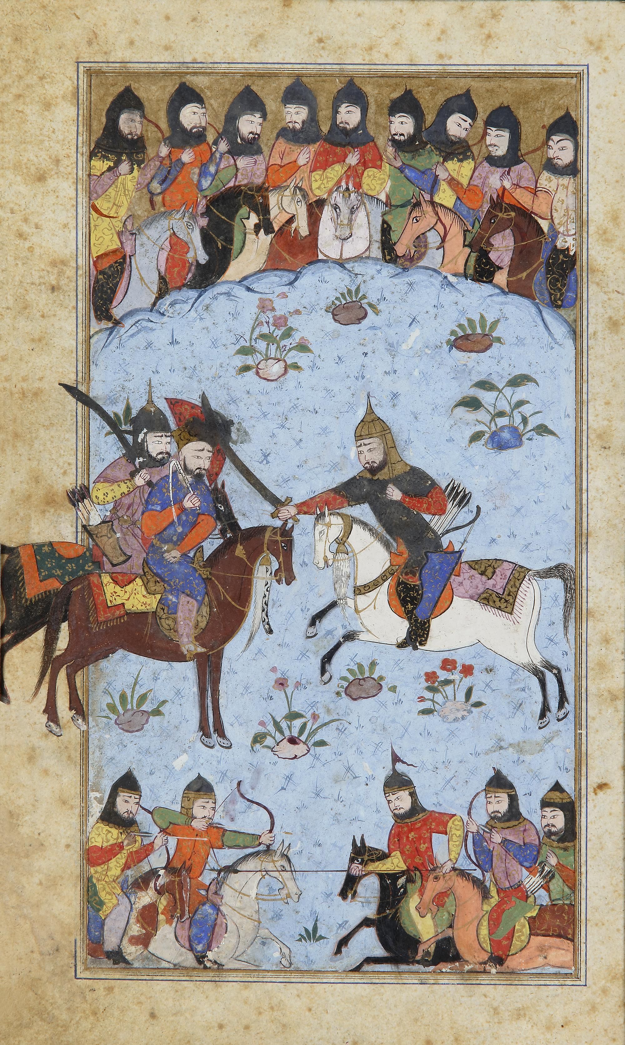 And a miniature on paper, painted in gouache enhanced with gold and silver, probably representing a battle scene around Khosrow Parviz. On the back, a painting of flowers was added later. Painting: 23.5 by 15.5 cm