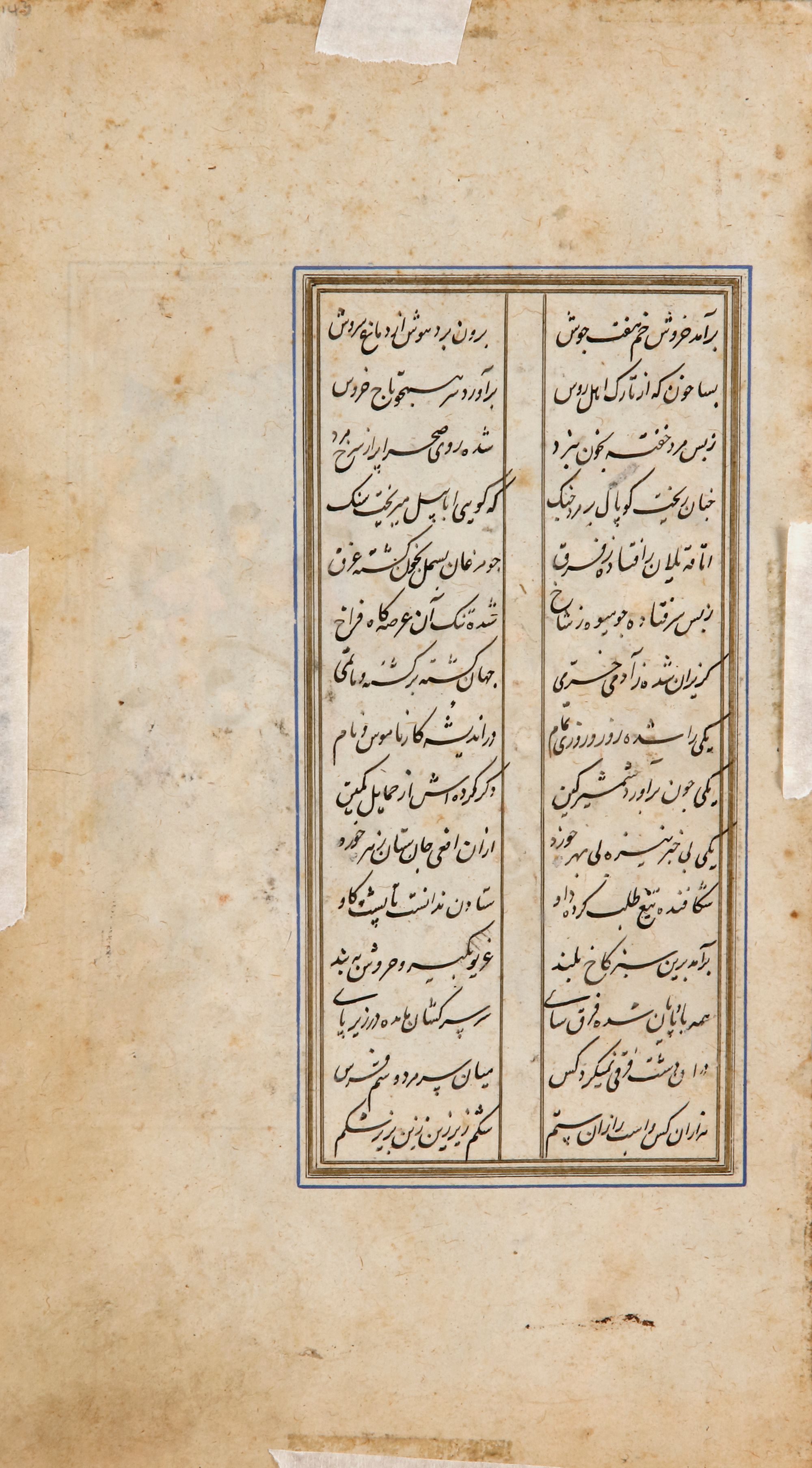 Depicting soldiers watching from the hillside, leaf from a Shahnameh, illuminated manuscript on paper, ink and gouache on paper, image depicting Rustam and Afrasiyab fighting on horseback. Nasta'liq text on the front in cartridges and on the back in two columns. Painting: 22 by 15 cm.