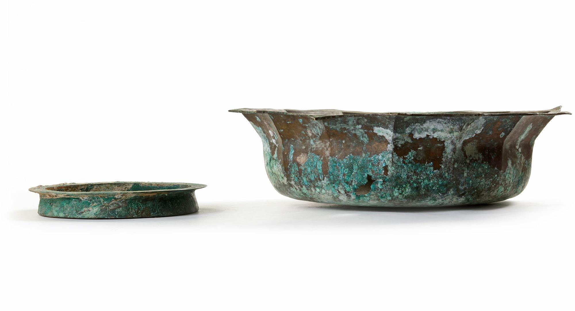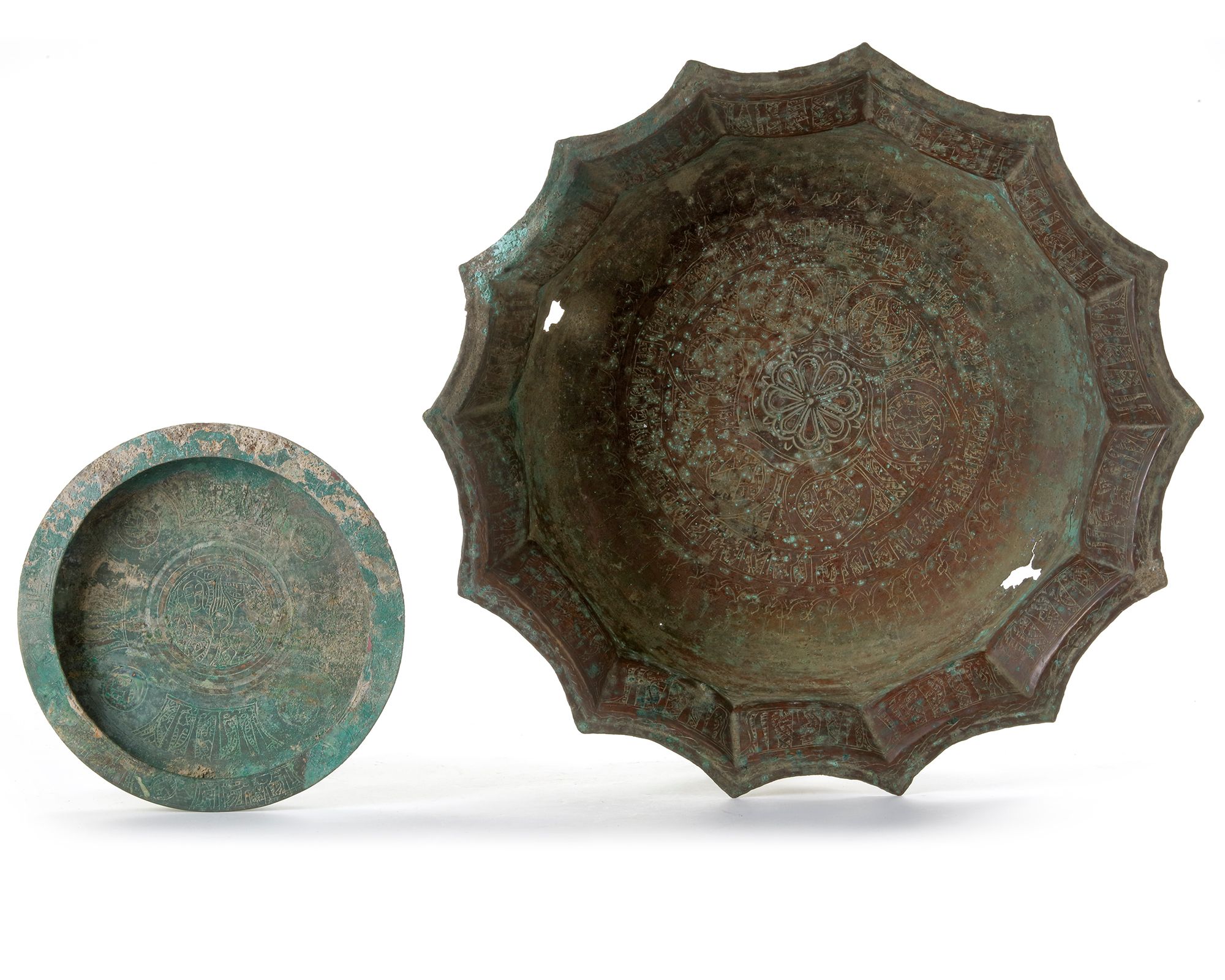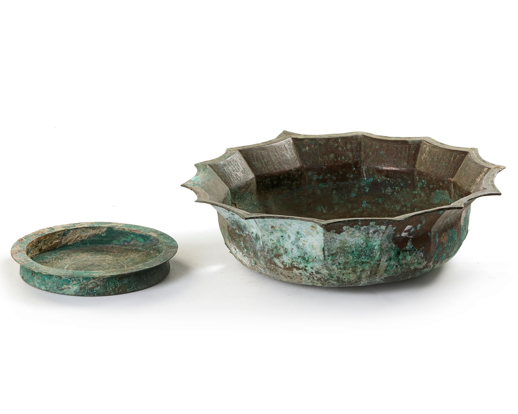 A Persian bronze lobed bowl decorated with calligraphy.