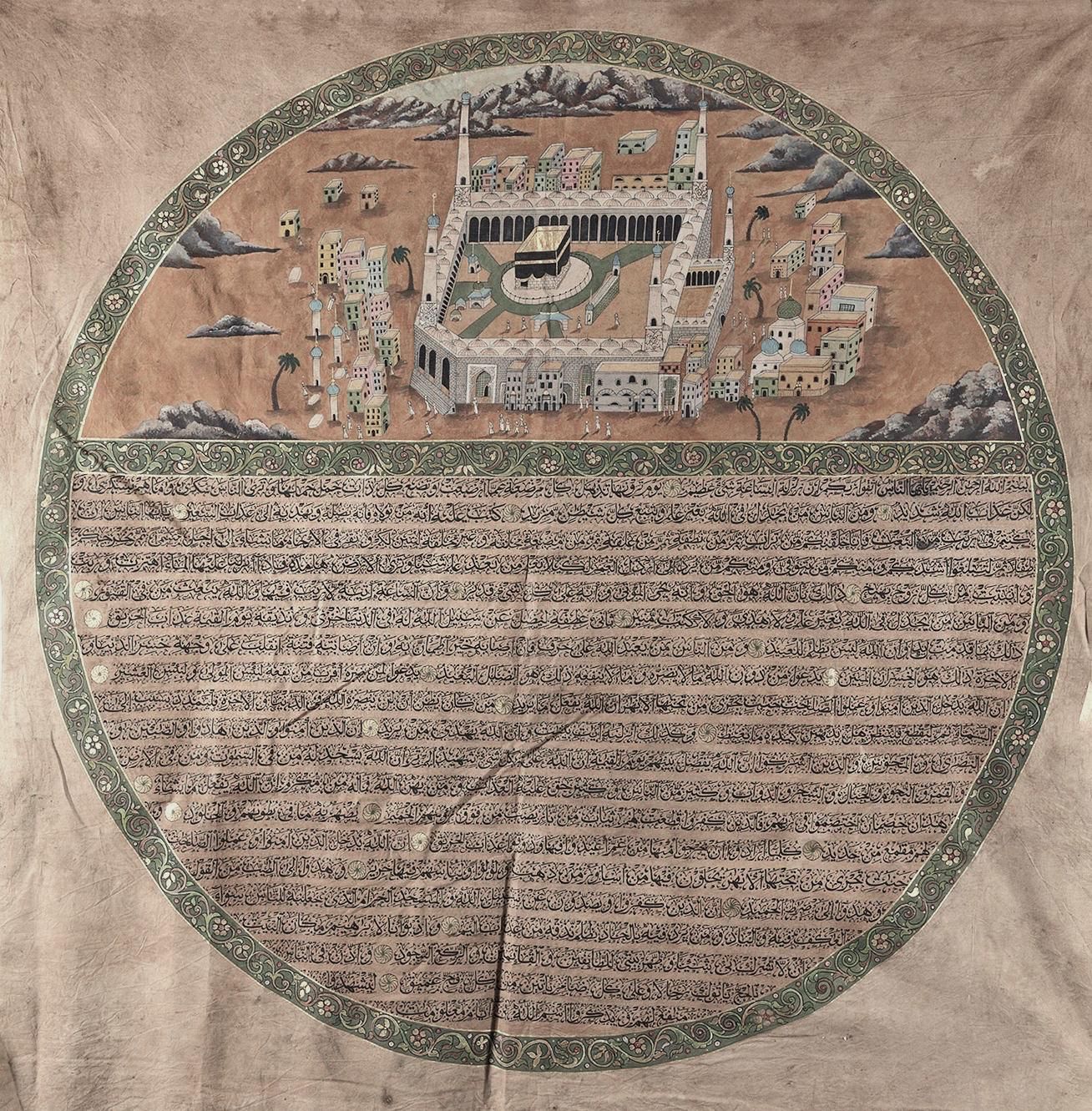 A painting on textile The upper register of the ruondel shows a topographic view of Mecca with its large mosque in the center surrounded by city houses and hills adjacent to Mecca. In the middle of the large heavenly mosque, the Kaaba stands in the shape of the glorious black cube, the sacred sanctuary in Islam, surrounded by houses with a mountains in the background. The lower register contains the sura of Al-Ḥajj (Arabic: الحج, "The Pilgrimage, The Hajj") which is the 22nd chapter (sūrah) of the Qur'an with 78 verses (āyāt) All surrounded by a band of flower and classic foliage scrolls.