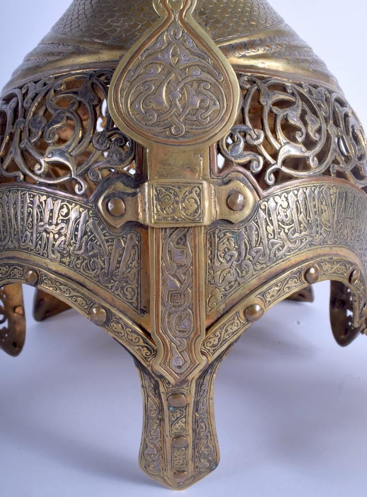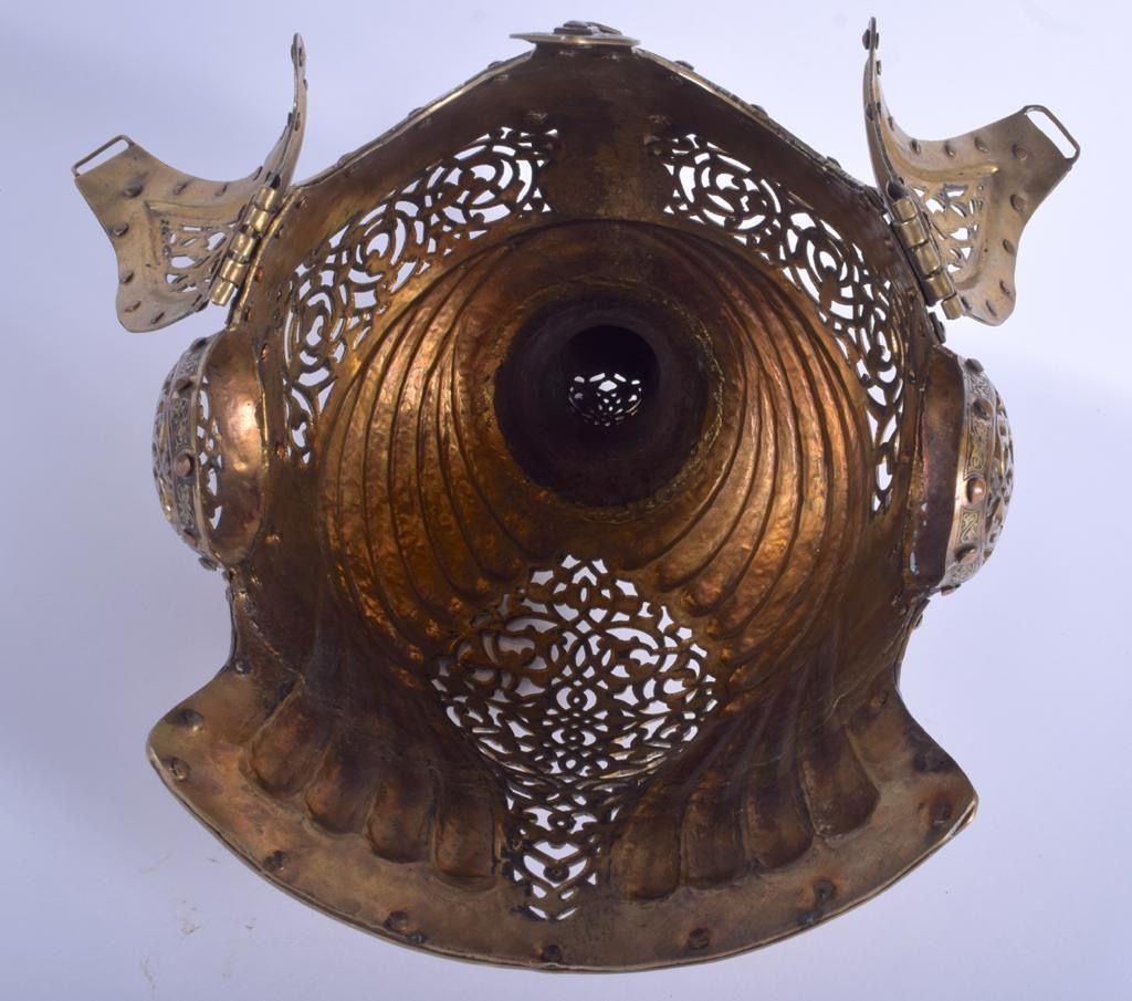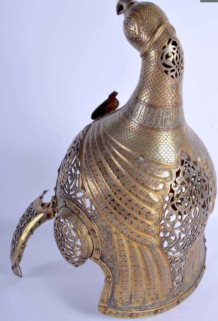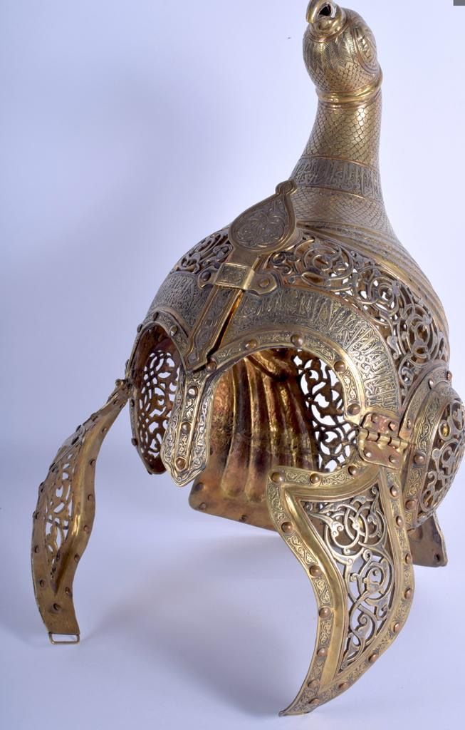 The bowl of domed conical form with bird head finial, the curving nasal with leaf-shaped finial with foliate screw lug, attached neck-guard, moulded cheek-pieces with openwork pattern.
