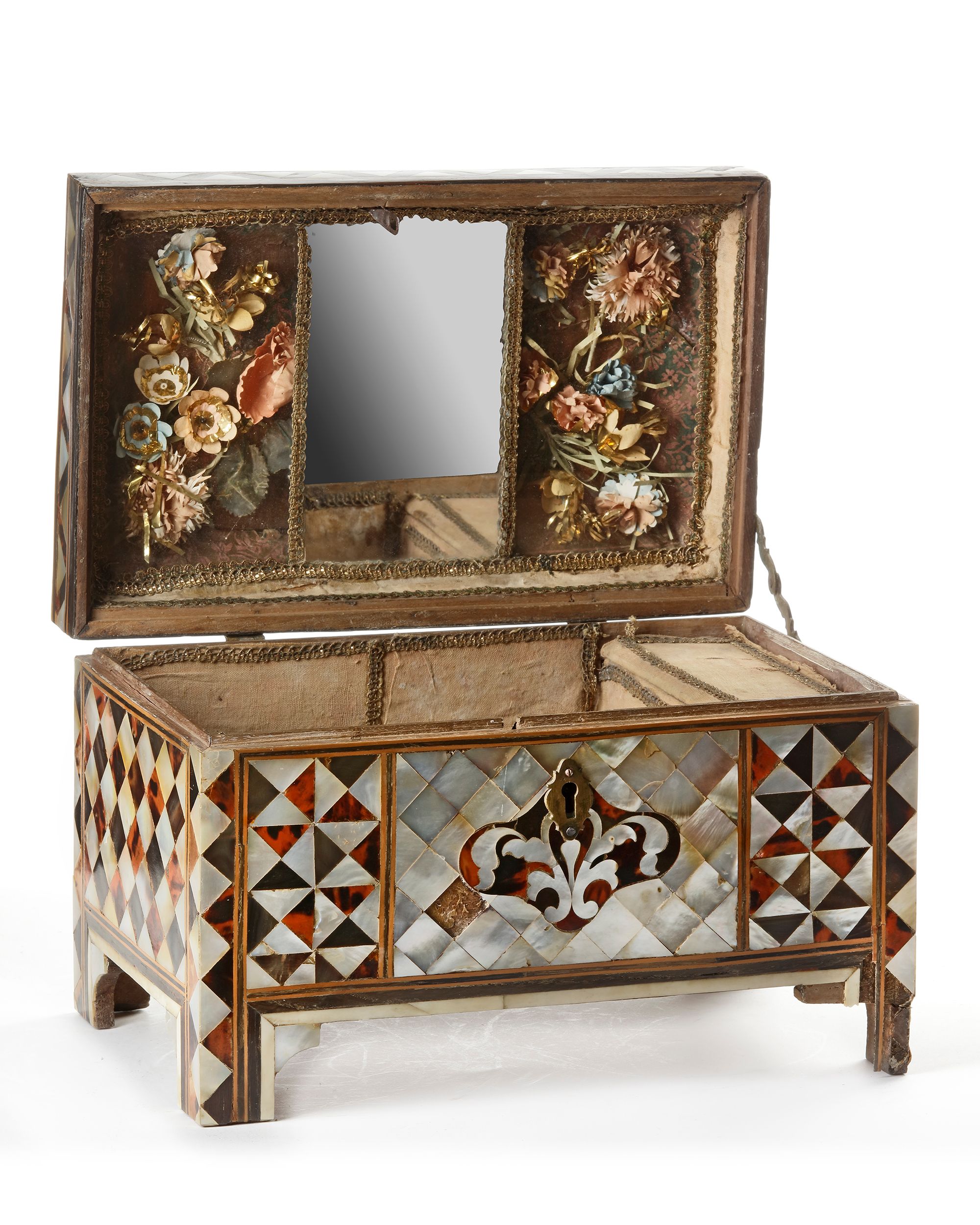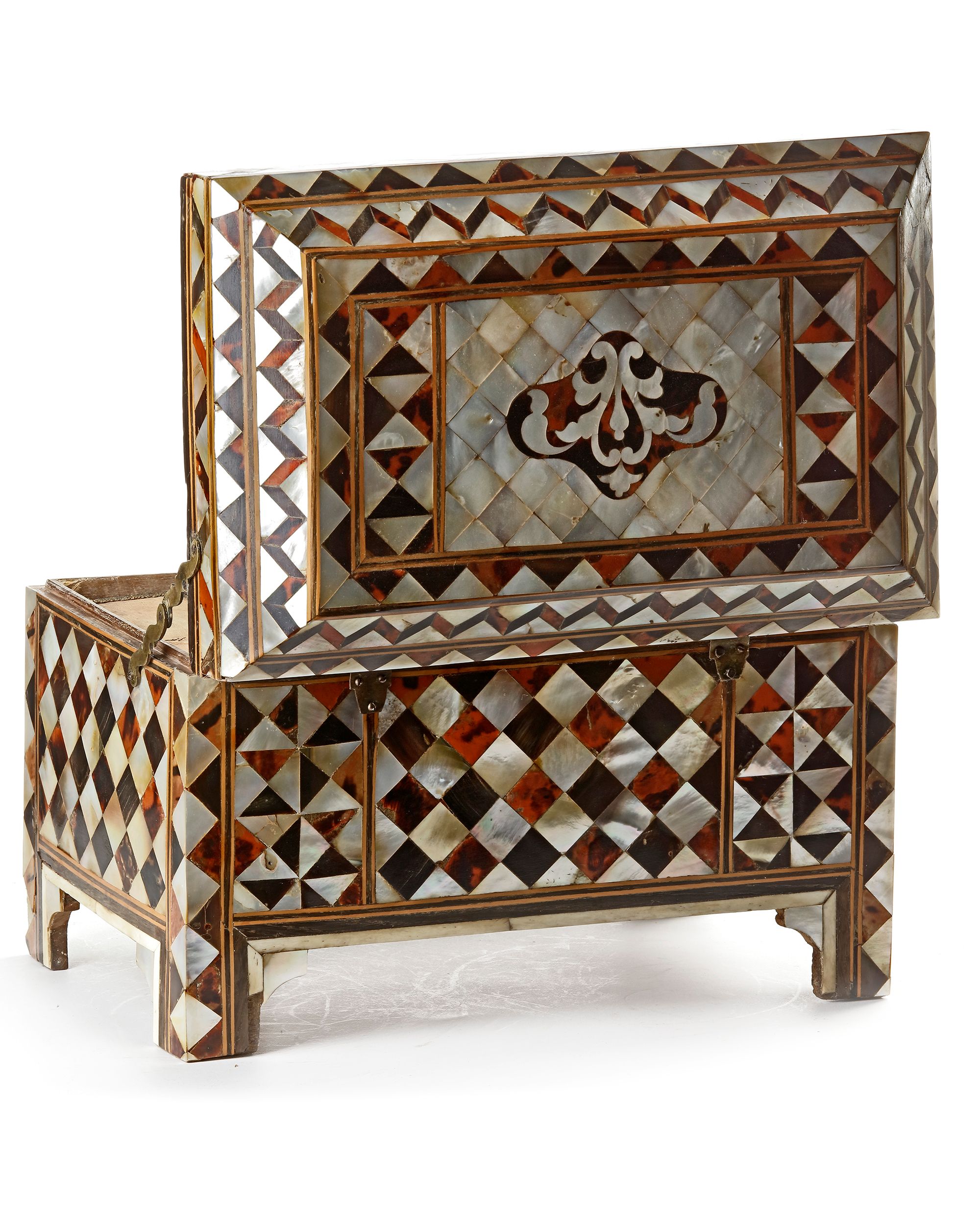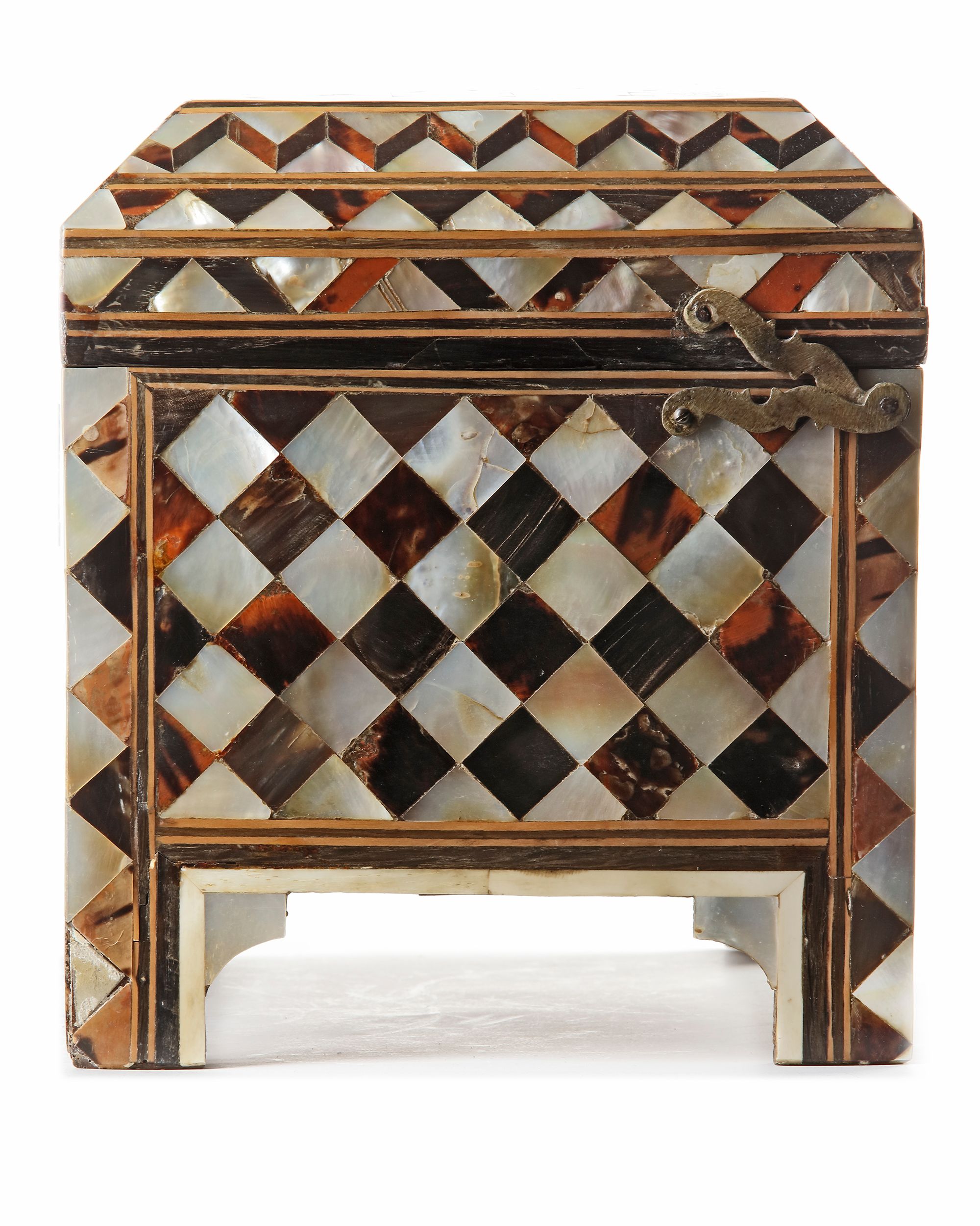 Of rectangular form on raised legs with curved spandrels and hinged coffered lid, the surface covered in inlaid mother-of-pearl and tortoiseshell panels in triangular geometric shapes, lid with cartouche, spandrels and central floral medallion, edges with band of bone inlays.