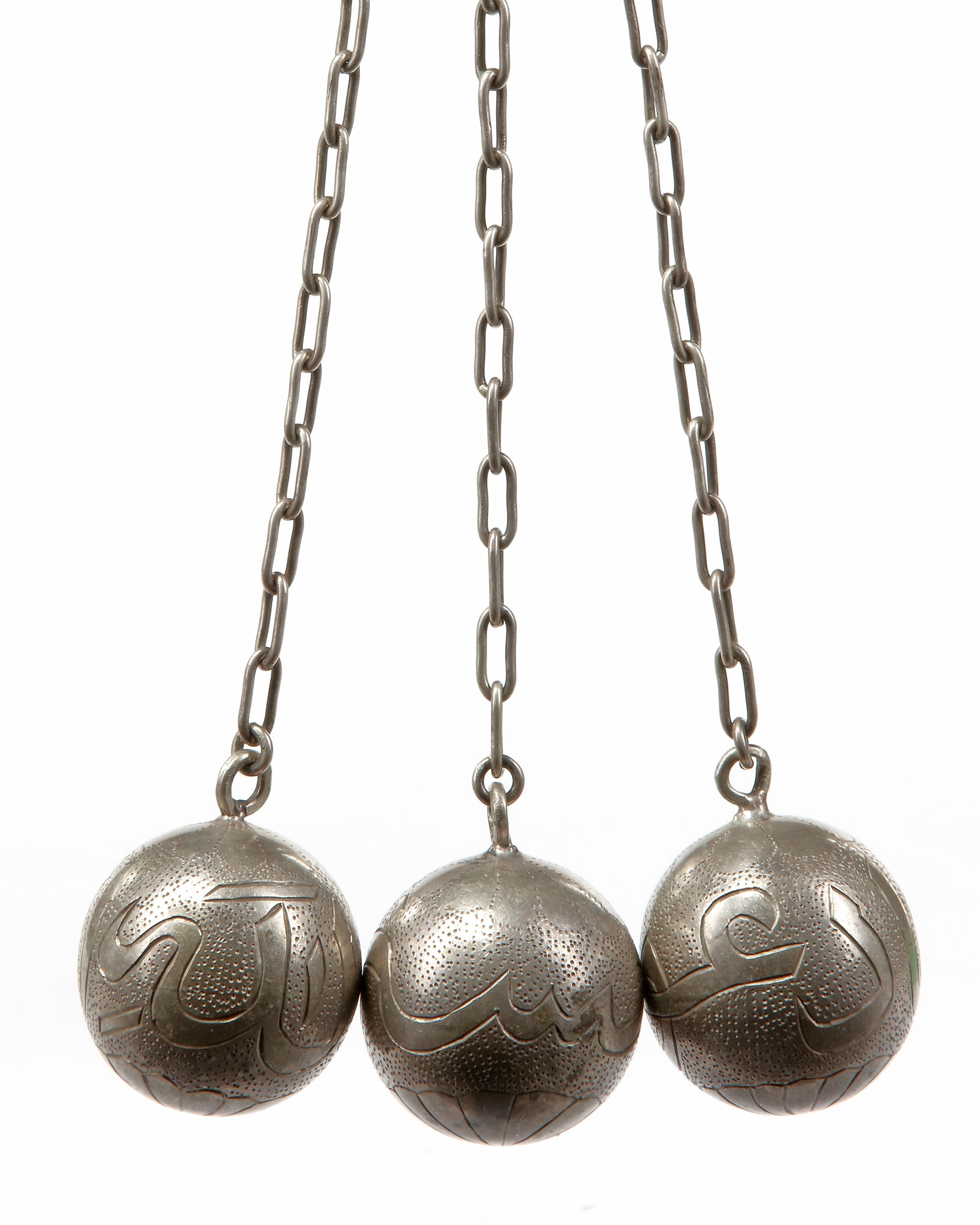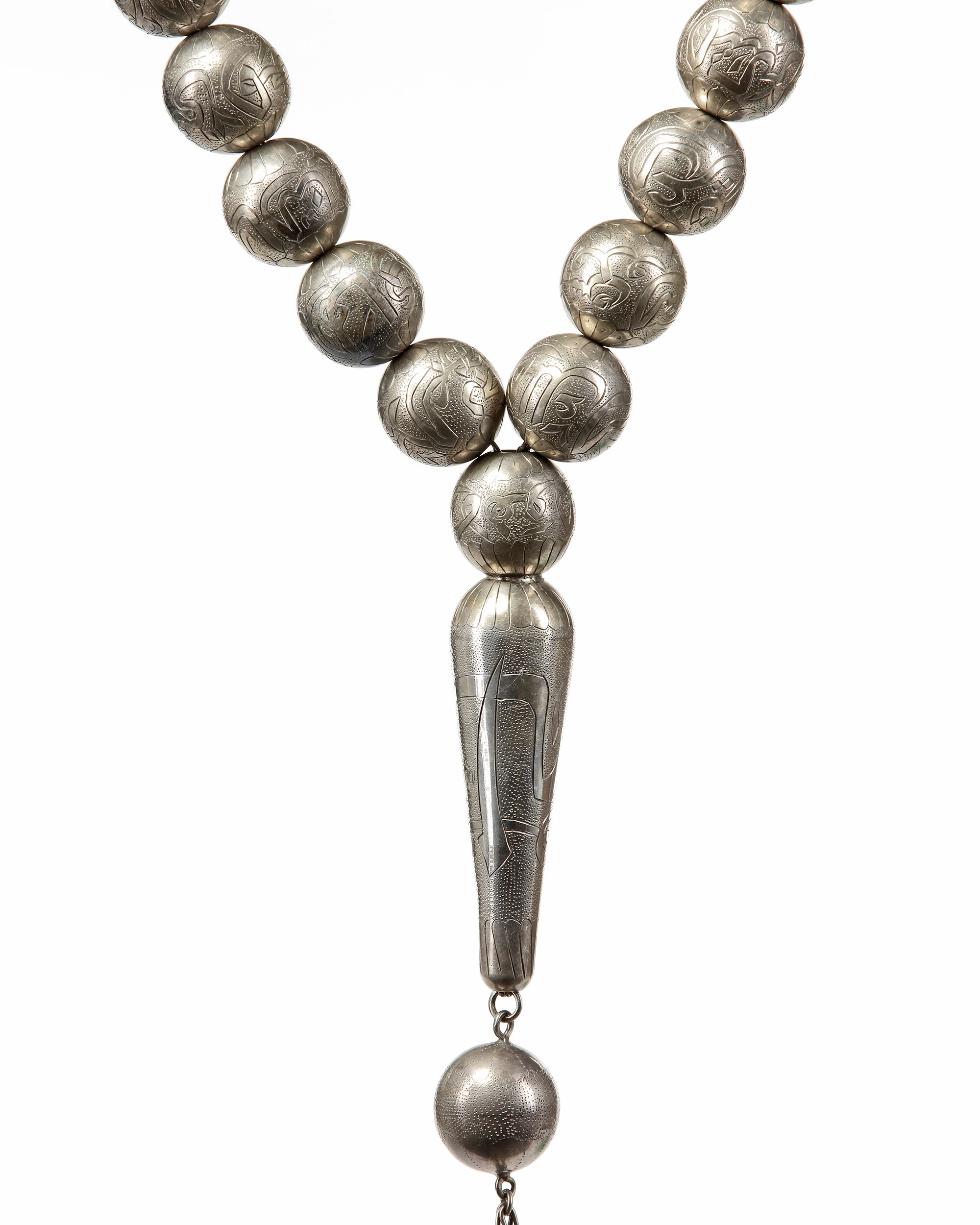 Consisting of 33 circular beads plus three extra small beads at the end with large tapering bead, each silver bead is carved to both sides with a name of the beautiful names of Allah, set between a band of stiff leaves to each side.