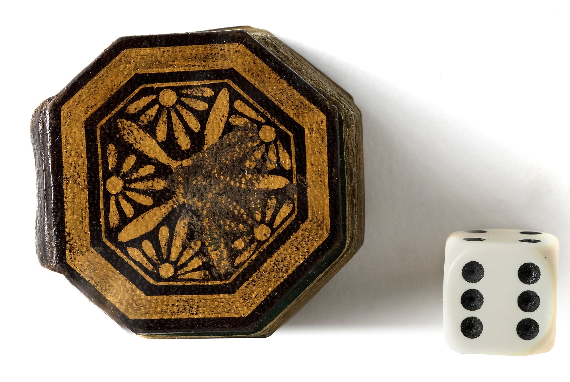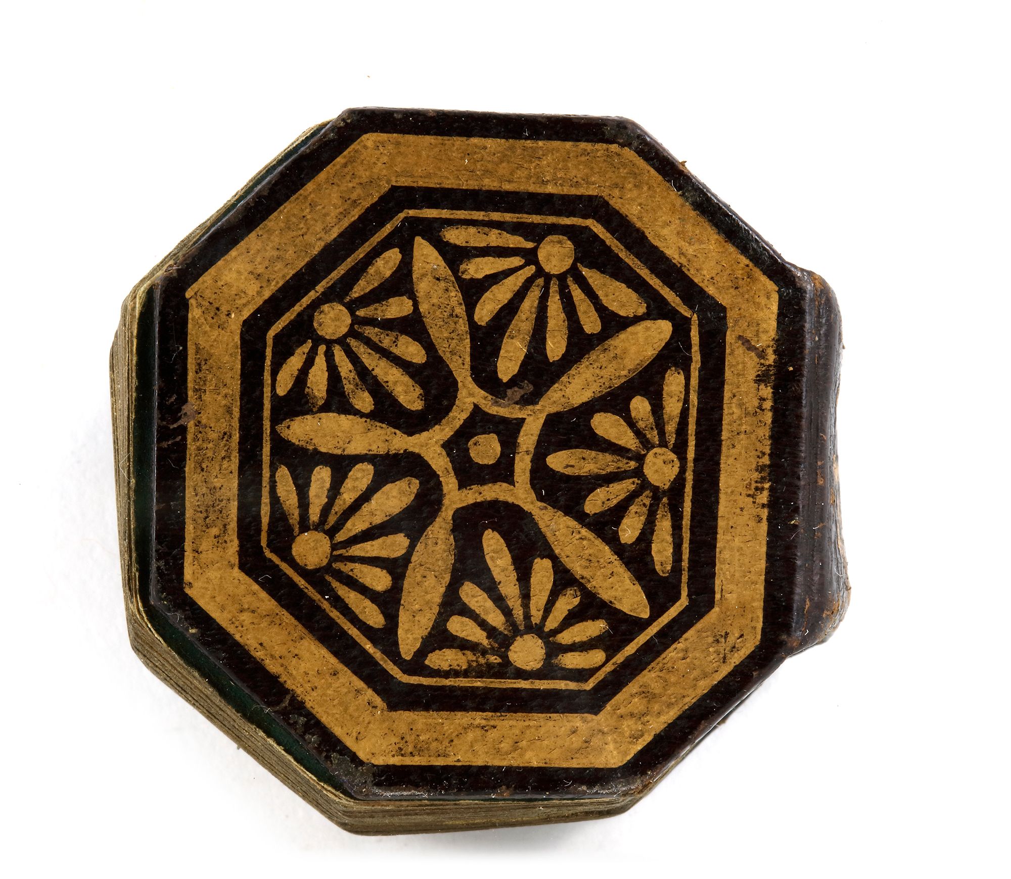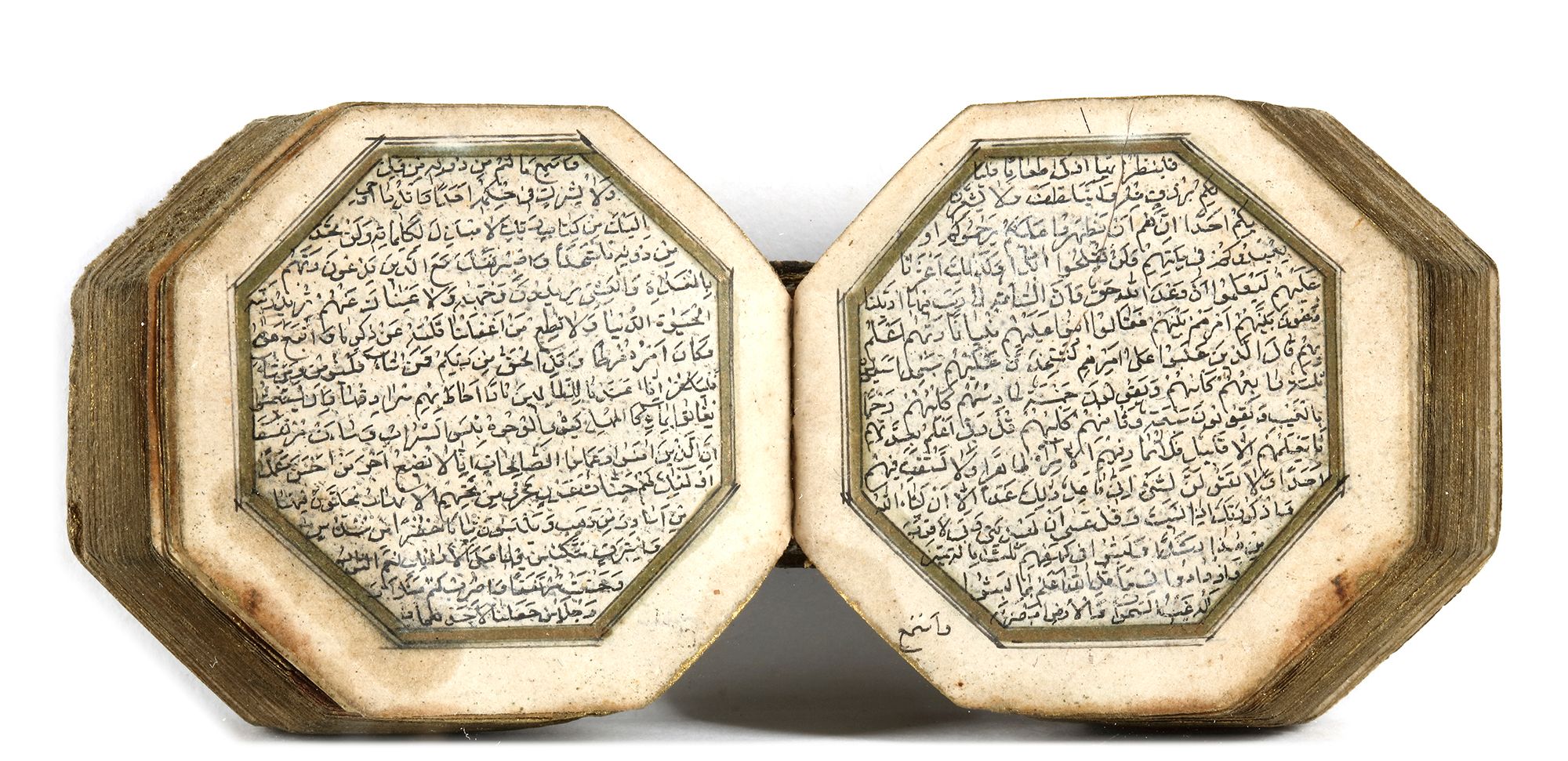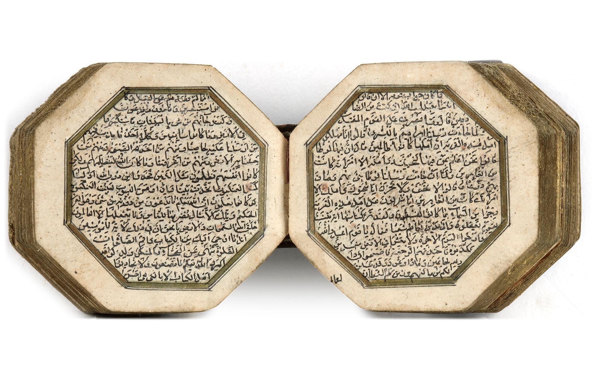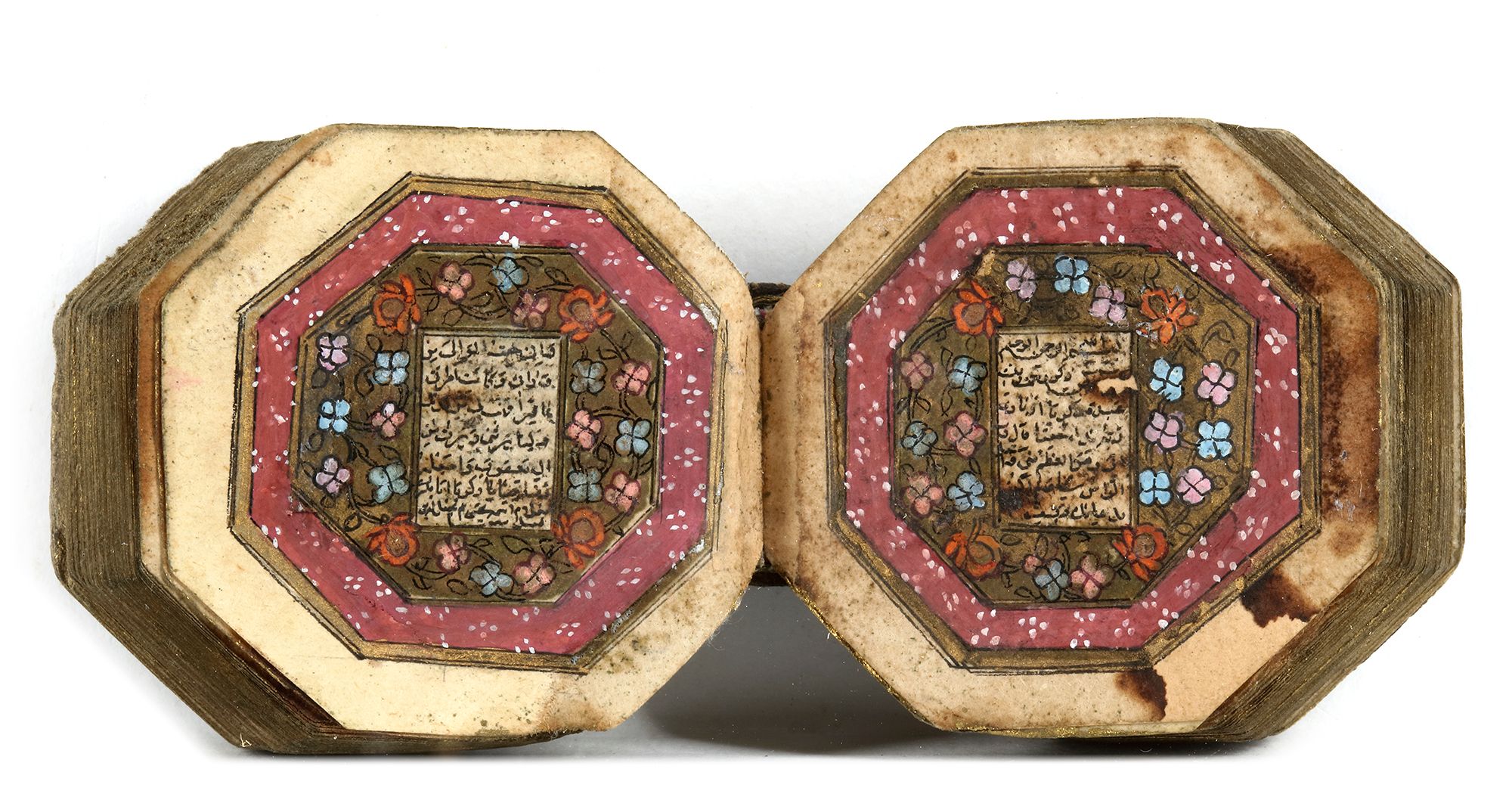 Arabic manuscript on paper, 279 leaves, 15 lines to the page written in minute naskhi script in black ink with diacritics and vowel points in black, catchwords, one illuminated double-page frontispiece in colors and gold, a second double-page halfway through the manuscript, surah headings in gold, some waterstaining mostly restricted to outer margins, penultimate leaf with later embossed ownership inscription, dark brown binding with covers painted with stylised petals in gold, leather outer case Manuscript: 4.2 by 4.1 cm. Case: 5 by 5 cm.