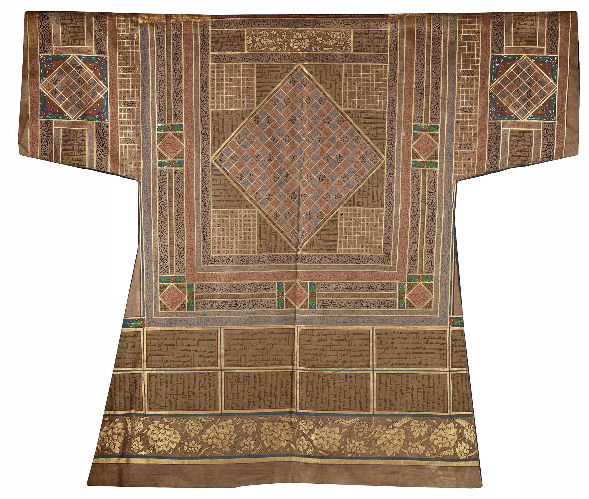 A shirt (jama) covered with text written in naskh scripts, in assorted colors, arranged in numerous panels, roundels, cartouches, cypress tree forms. The inscriptions include quotations from the Quran, invocations to Allah, attributes of Allah and prayers, Names of Allah. They are written in Kufic, naskh and thuluth script in different sizes and shapes, patterns, mirrored form and reserved against text and in colors of black, red, green, and gold. To the reverse different panels enclosing the names of Allah and different surahs of the Quran, Talismanic numbers and Quran verses, surround by gilt lotus, flowers and foliage. 130 by 110 cm.