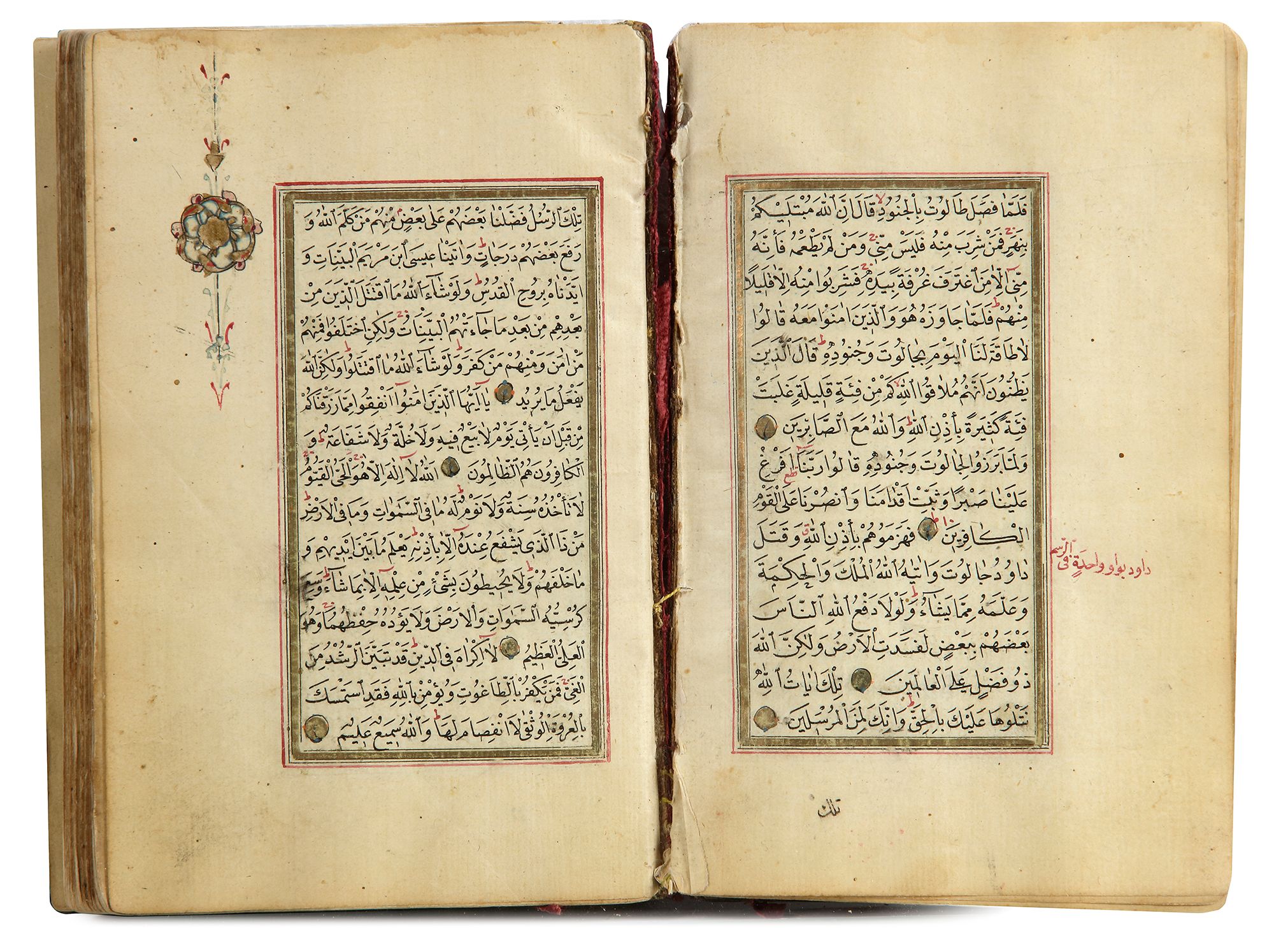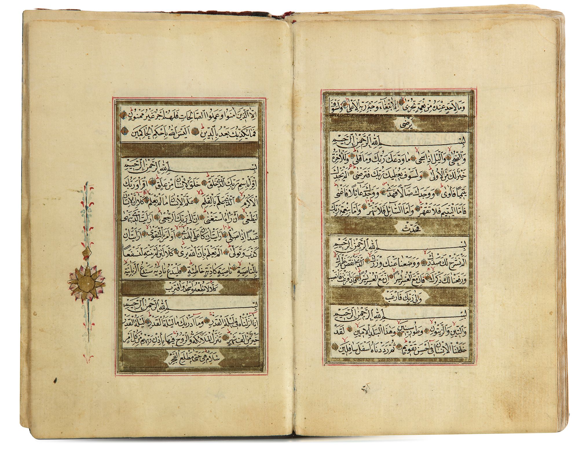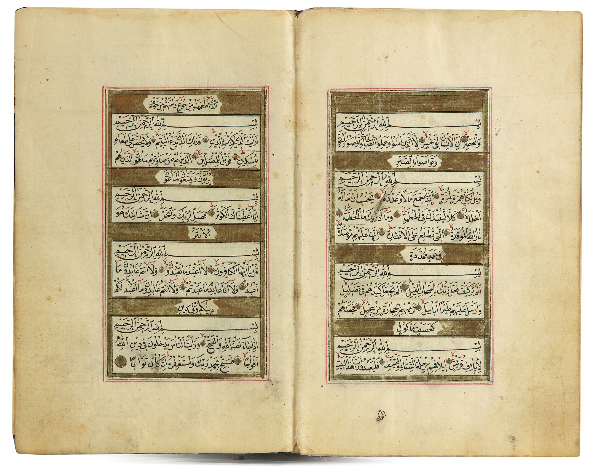 Arabic manuscript on paper, 15 lines to each page, written in black naskh script. Gold rosette verse markers outlined in black and pointed in red and blue dots, ruled in gold and red borders. Occasional marginal gilt 'juz and hezb' markers, two opening bifolia decorated with gilt and striking blue decoration. With morocco gilt stamped leather bidning Text panel: 6 by 11 cm. Quran: 11 by 18 cm