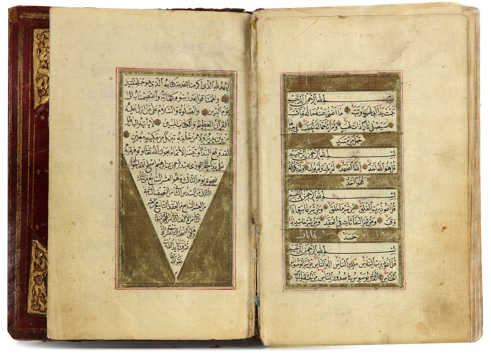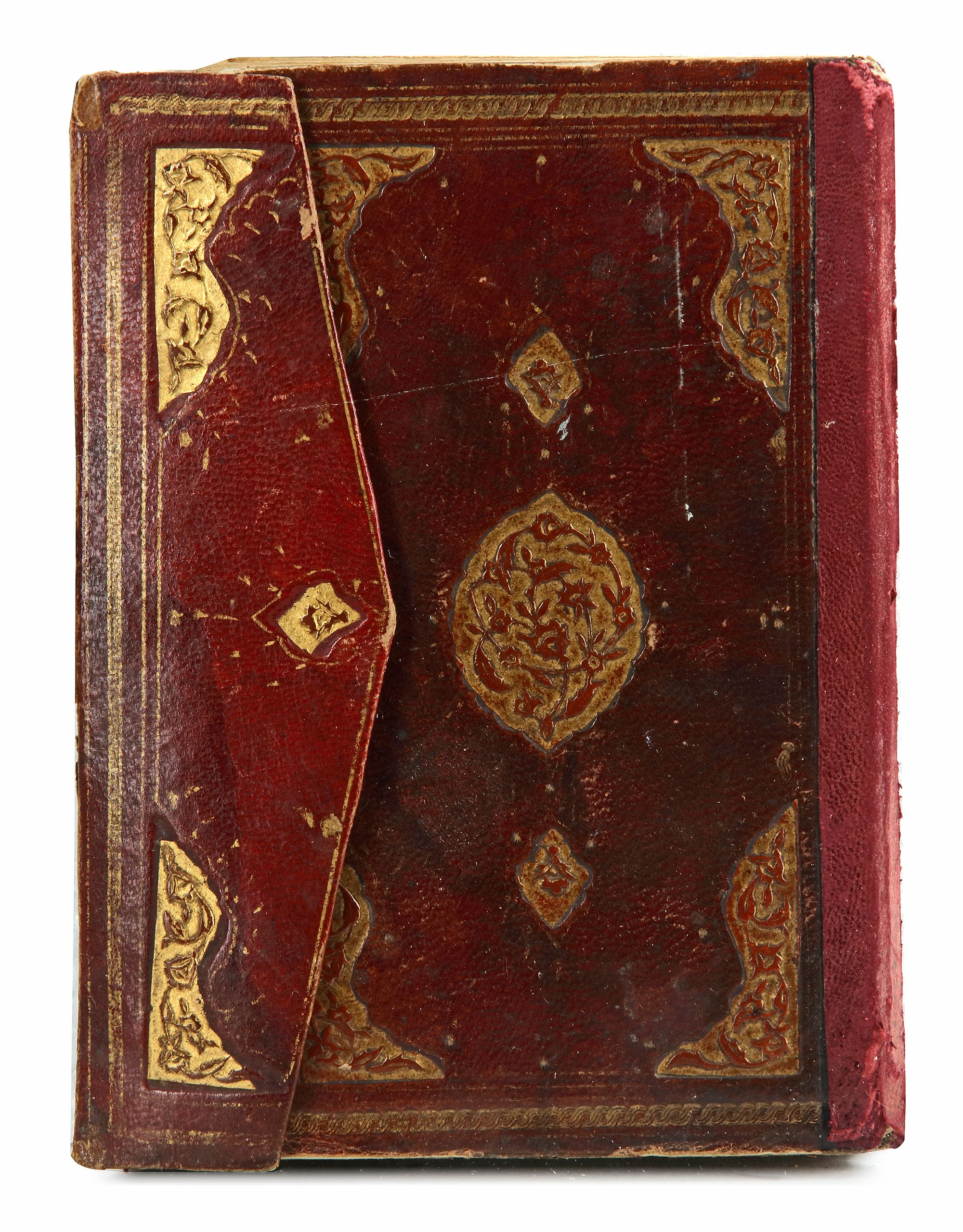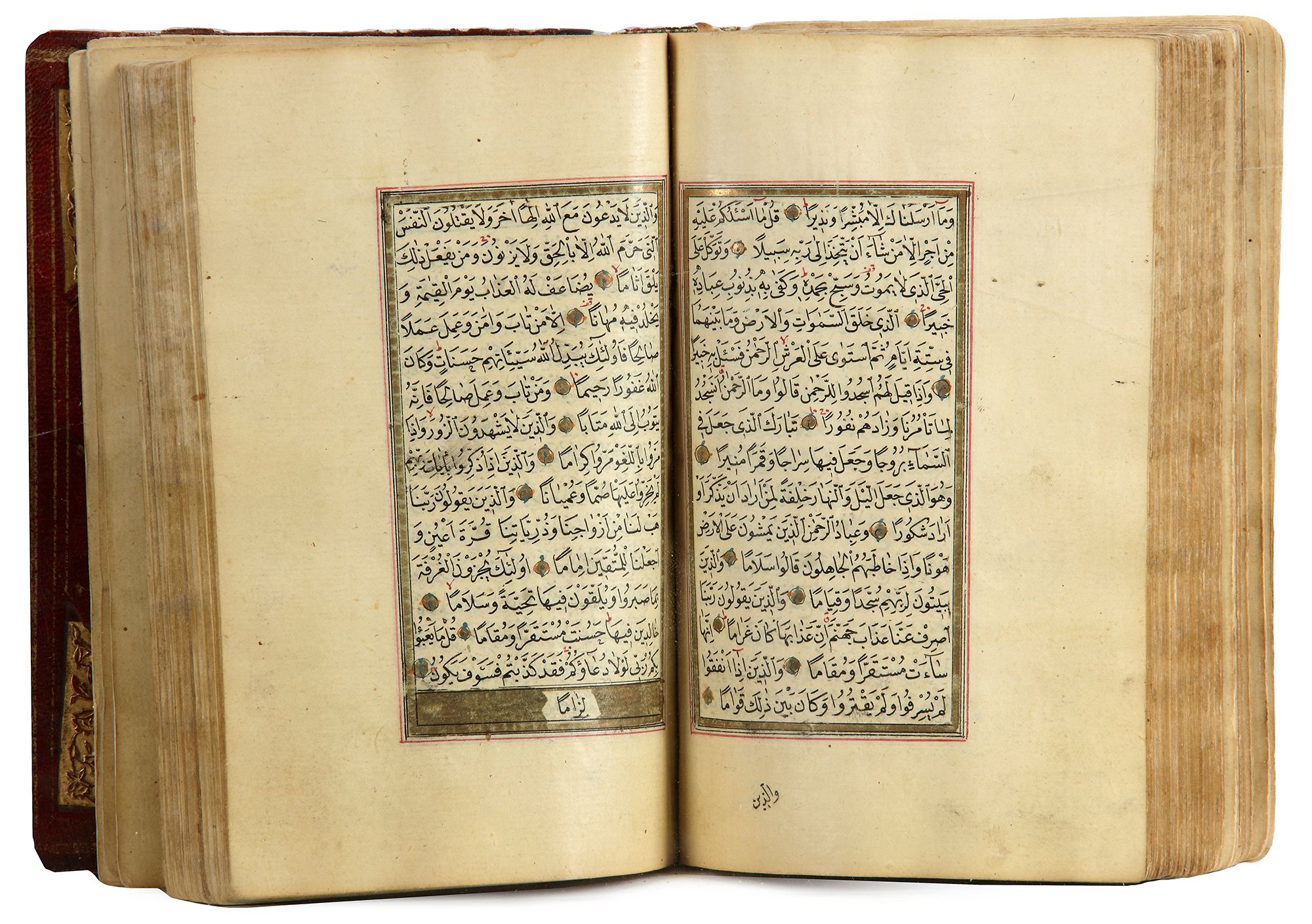 Arabic manuscript on paper, 15 lines to each page, written in black naskh script. Gold rosette verse markers outlined in black and pointed in red and blue dots, ruled in gold and red borders. Occasional marginal gilt 'juz and hezb' markers, two opening bifolia decorated with gilt and striking blue decoration. With morocco gilt stamped leather bidning Text panel: 6 by 11 cm. Quran: 11 by 18 cm