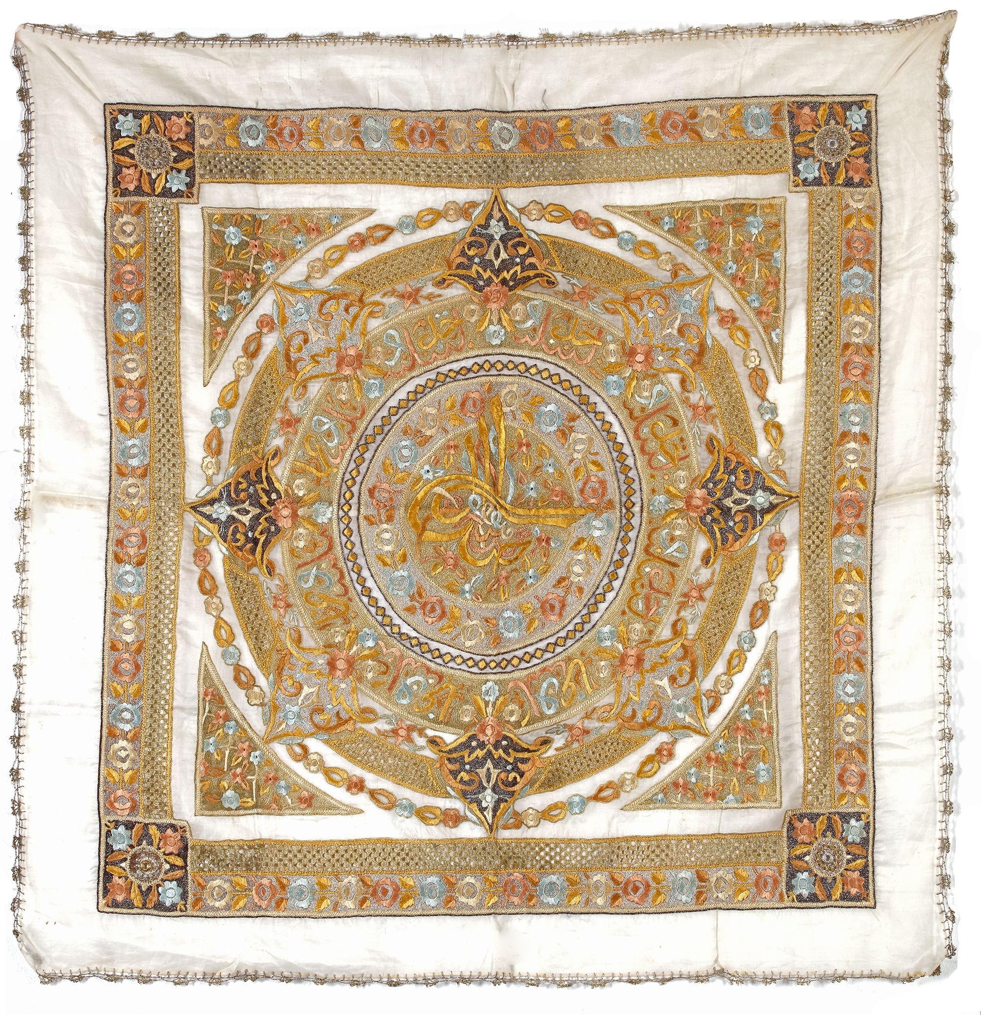 Ottoman embroidered silk square, with central tougher imperial monogram,