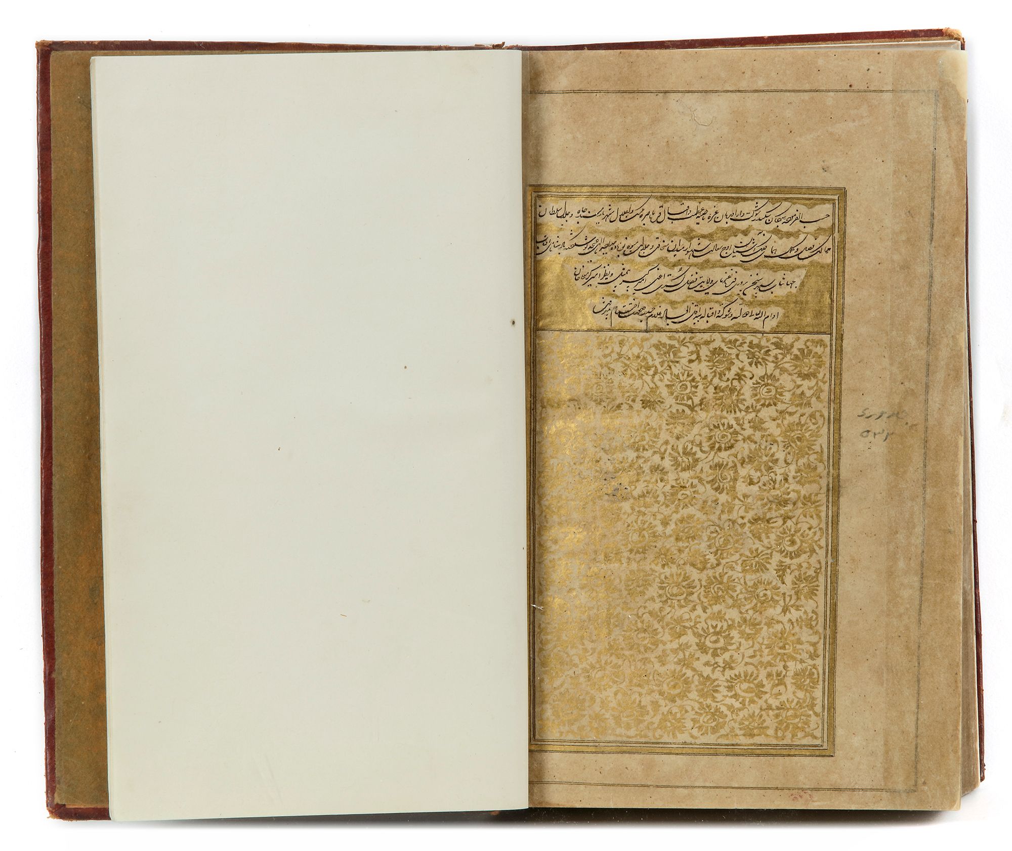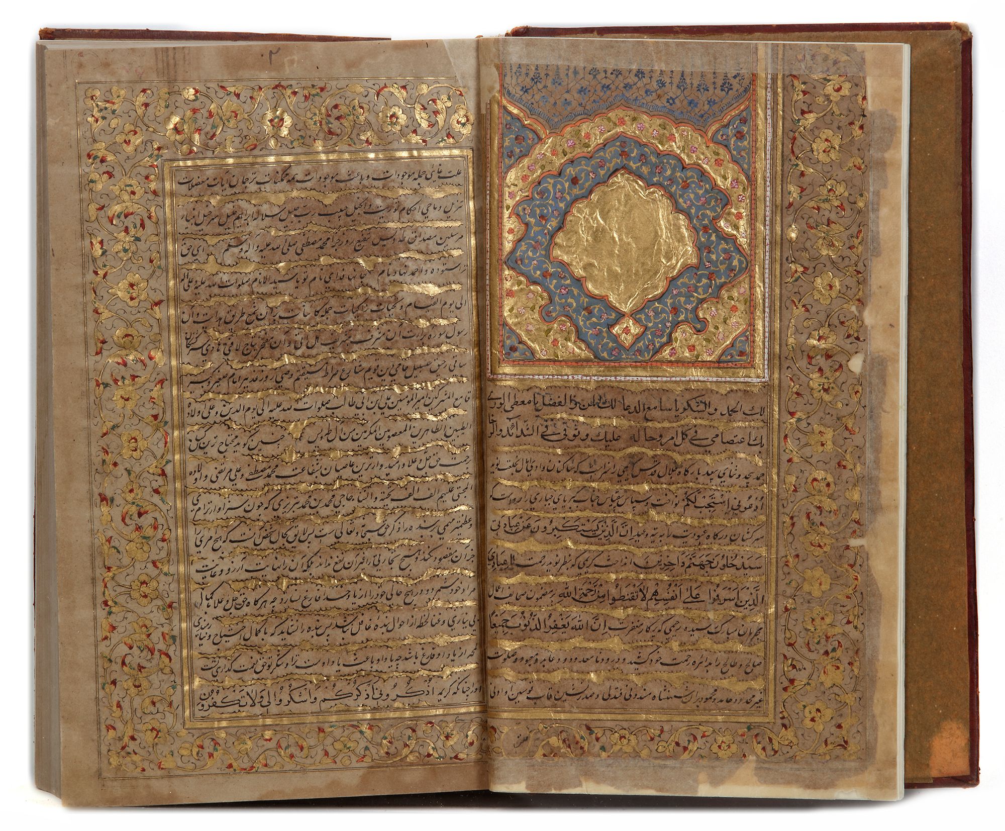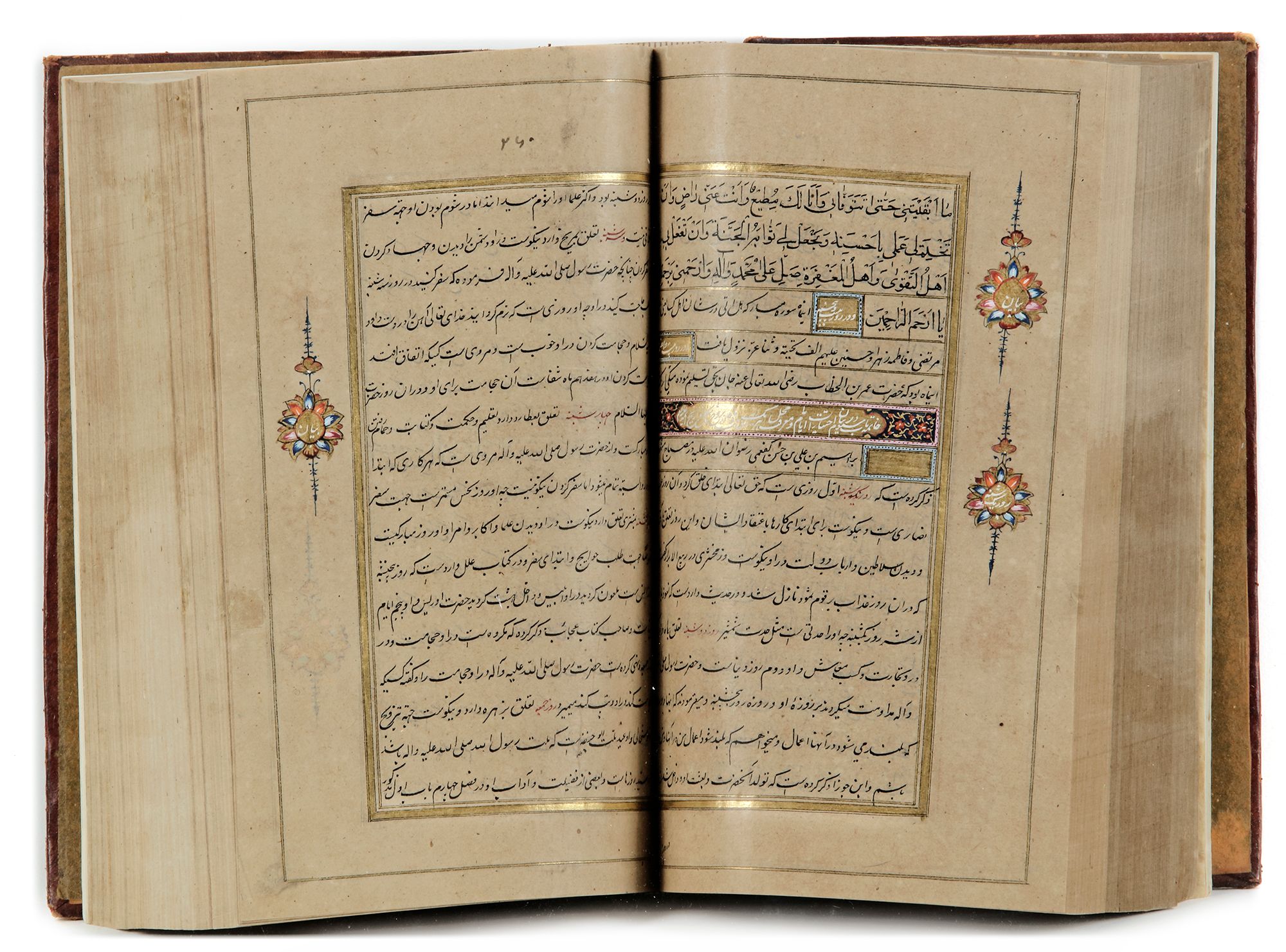 Arabic and Persian manuscript on paper, calligraphed in beautiful naskh and nastaliq black on seventeen lines per page, divided into several chapters including 'Maqam, Fazal and motalab' in Persian and Arabic, including Koranic extracts, recommended prayers and wise advice from the Imamite tradition. (Twelver Shiism). The manuscript opens with a beautiful double frontispiece richly illuminated, the subdivision titles are in white ink on a gold cartouche. Carrying in the last folio a dedication in chekasta for Gholam Haydari, probably the sponsor or a possessor of the book. Binding without flap in red morocco. 24.5 by 14 cm.