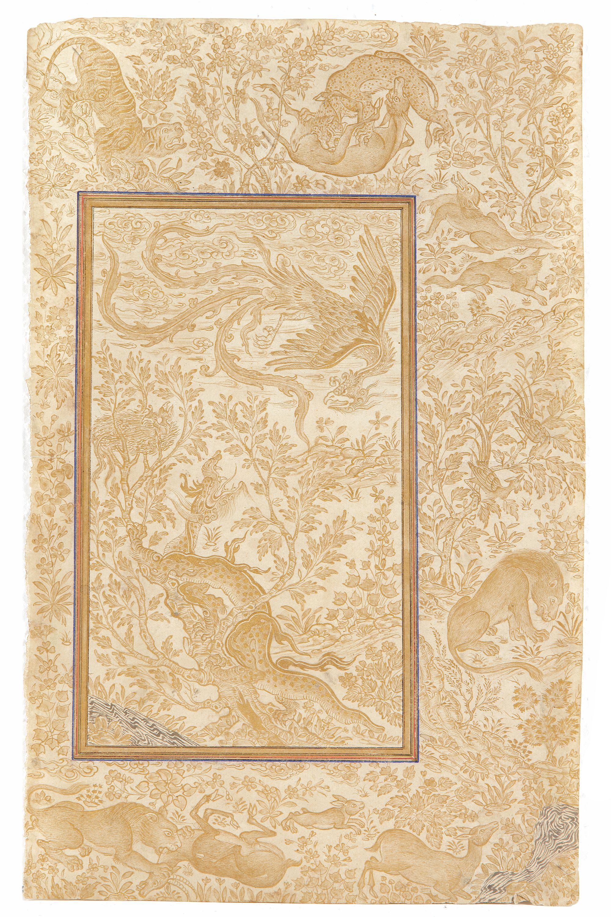 The folio decorated in gold with real and mythical beasts in a landscape. 44 by 21.5 cm.