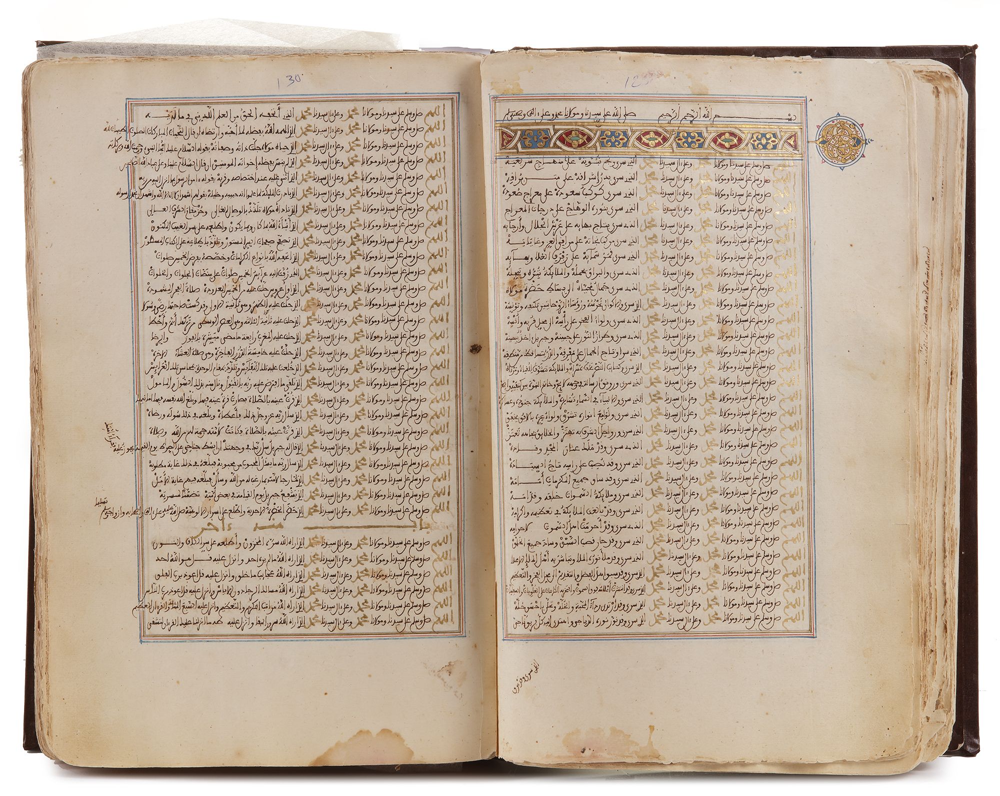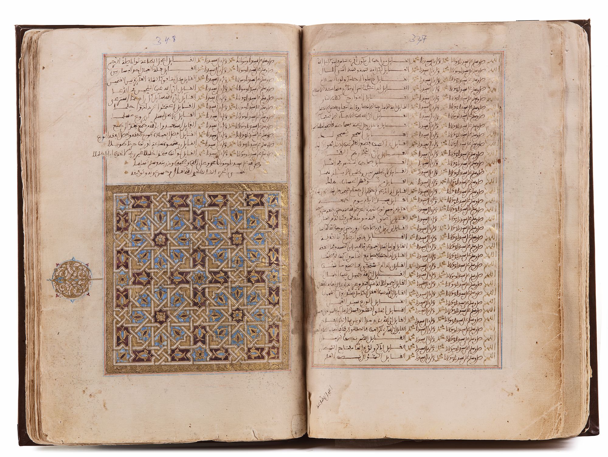 An Arabic manuscript on paper, 242 leaves, incomplete at beginning and end, 33 lines to the page written in Maghribi script in brown ink, headings and the words Allah and Muhammad picked out in gold or red throughout, inner margins ruled in red, blue and gold, catchwords in wide margins, two illuminated headpieces and two illuminated panels decorated with arabesques and geometric designs in colors and gold.