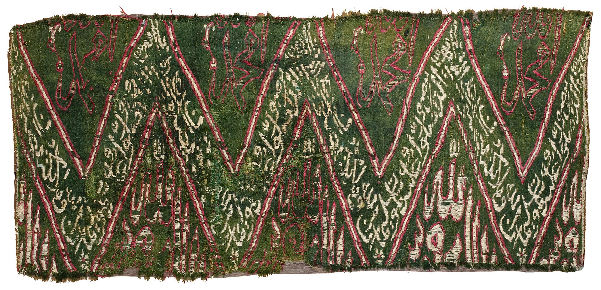 A fragment of silk hanging panel in the Rawdah Al-Mutahara, this fabric was woven in the tribute-color kemha technique.With an inscribed weave in cream-colored and red silk over a light green ground. Embellished with an undulating band which assume the form of a continuous chain made up of number “7”s, running from the beginning to the end of the cloth, enclosing Quran 33 surah Al-Ahzab, the Clans, v. 56. Embroidered further above the band with Allah and Muhammed and Kalimaat al-Tawhid to the lower section. 35 by 80 cm.