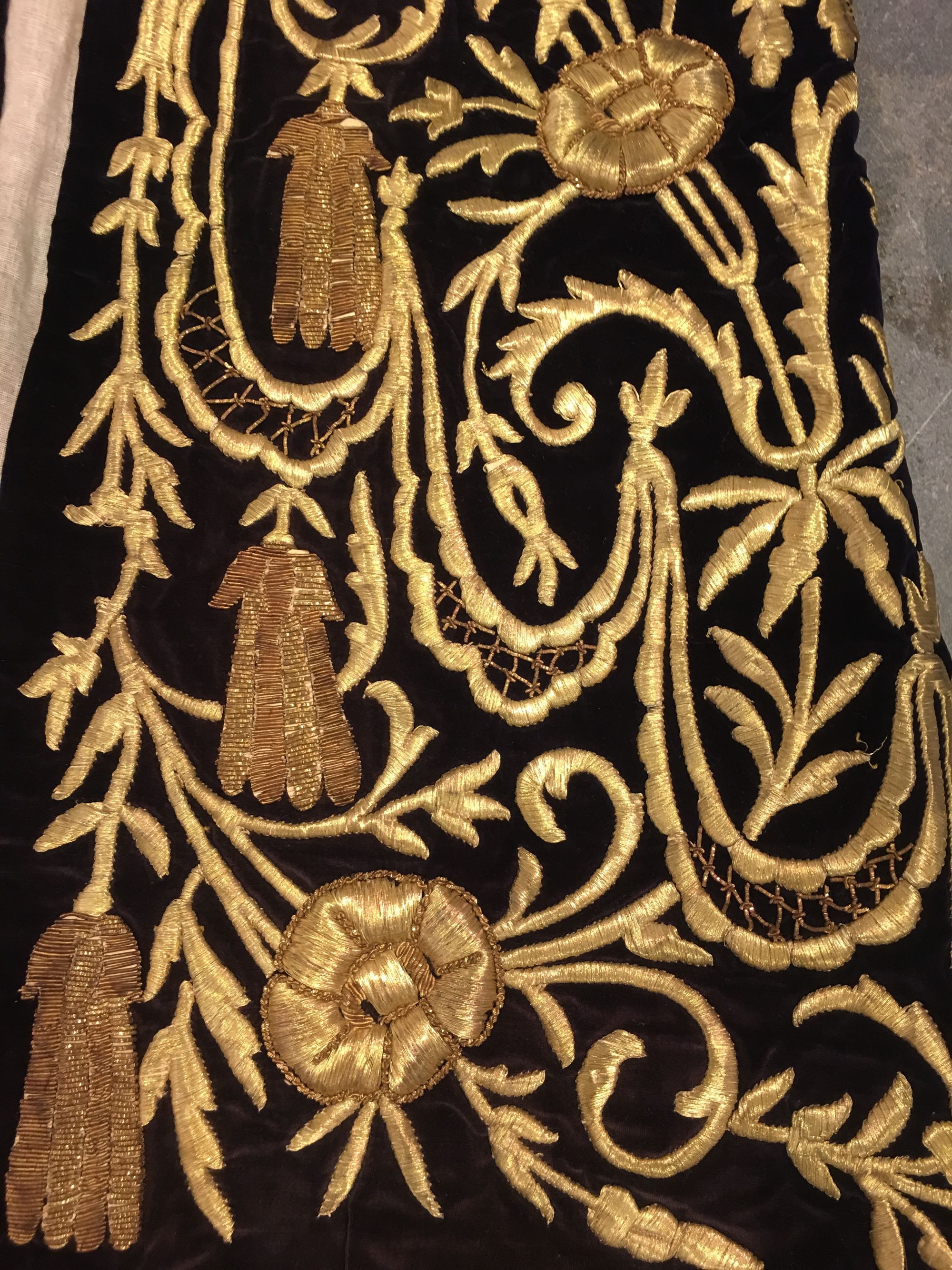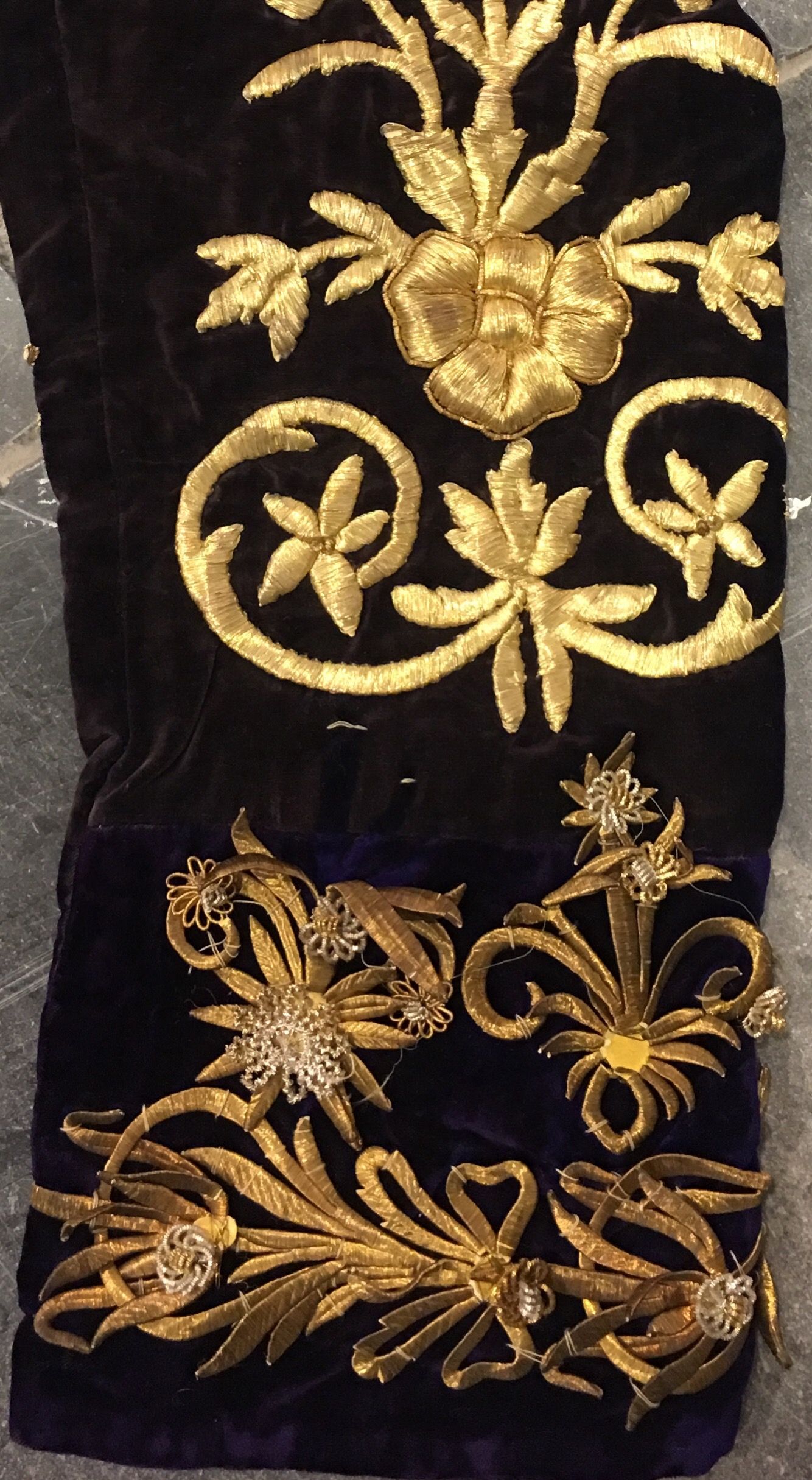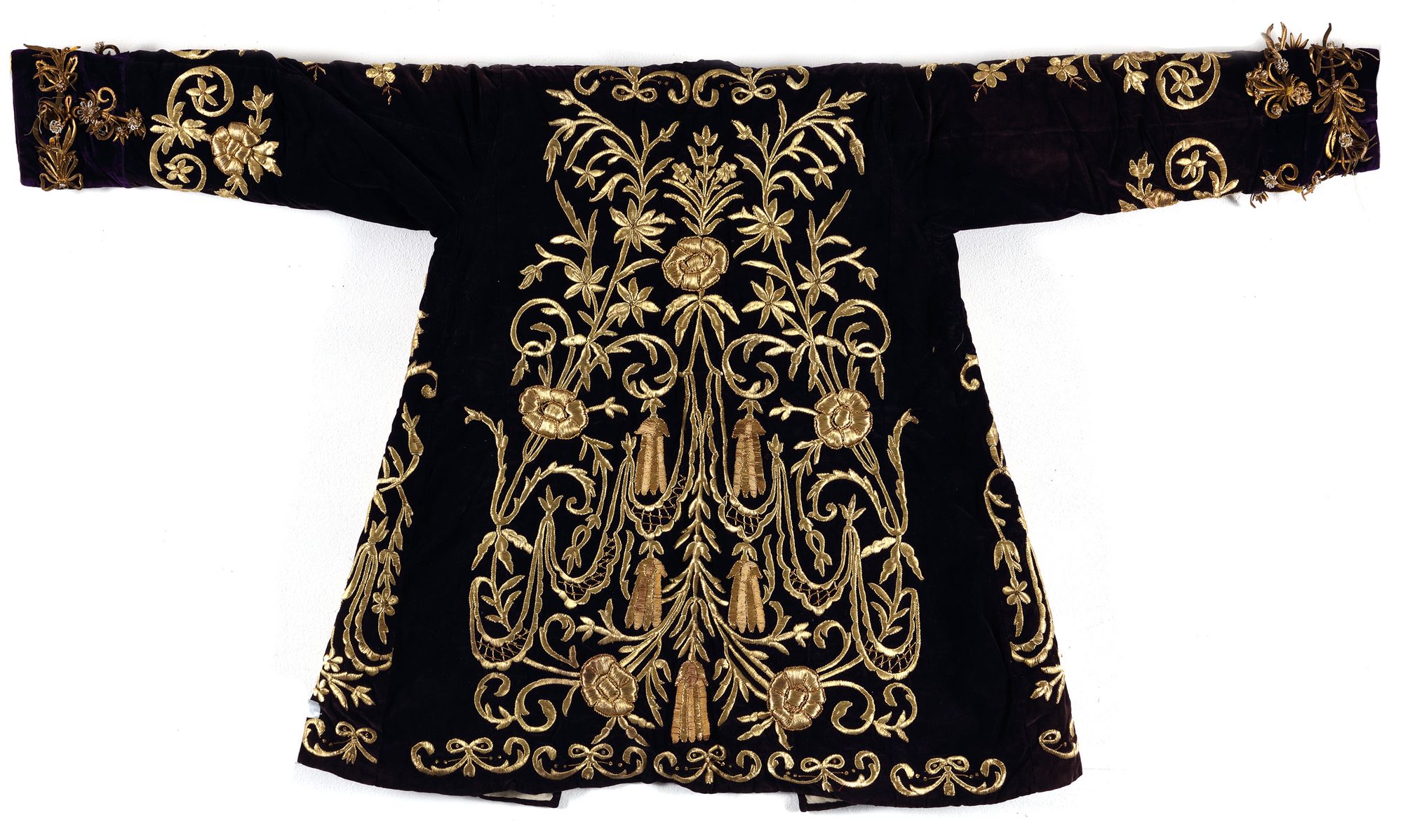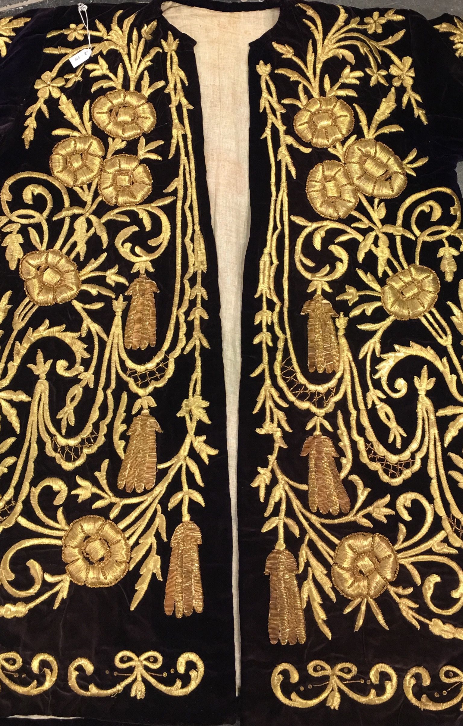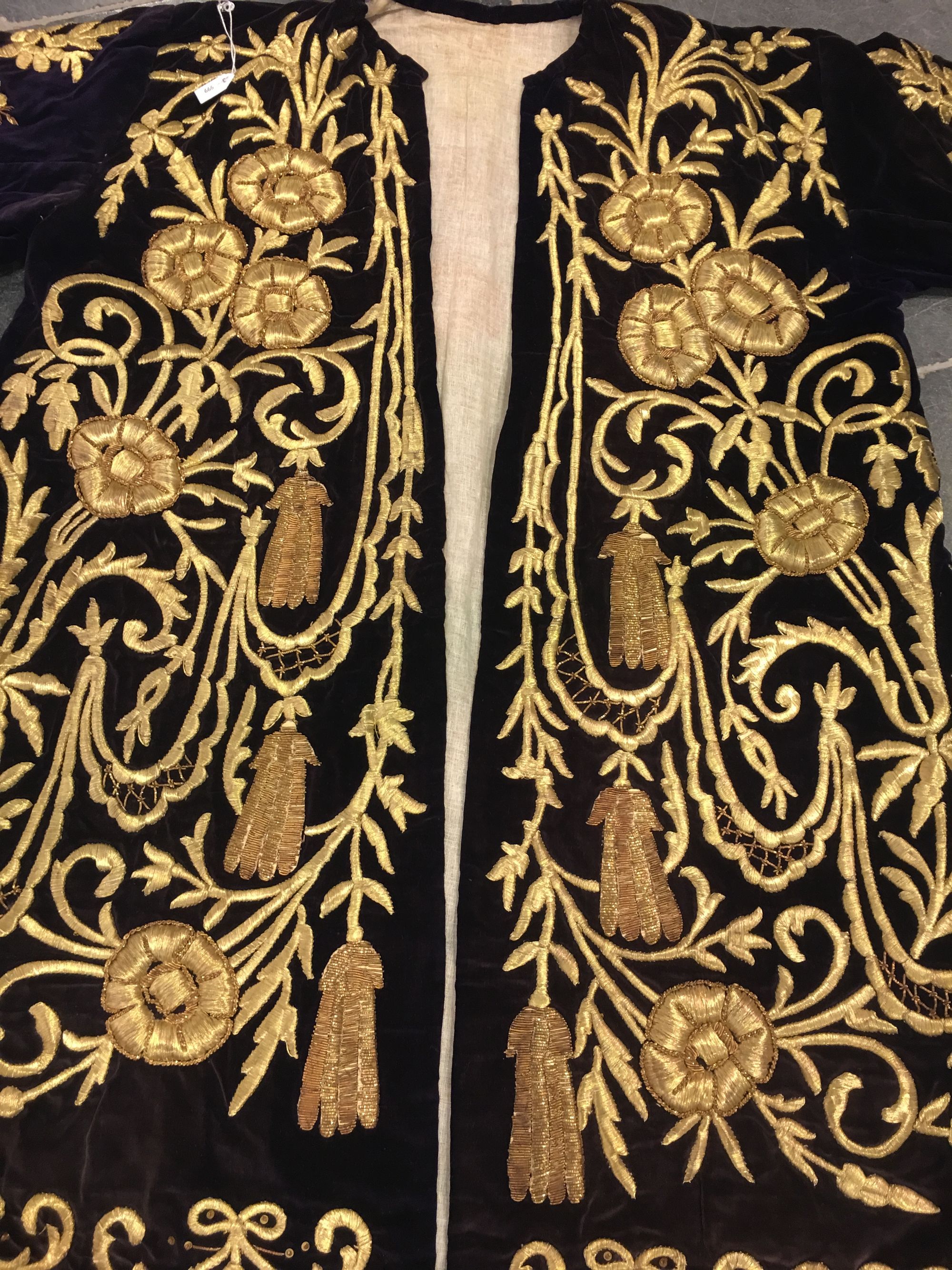 A velvet jacket of deep purple color, embroidered in gilt threads and embellished with dense design of flowers heads and foliage.
