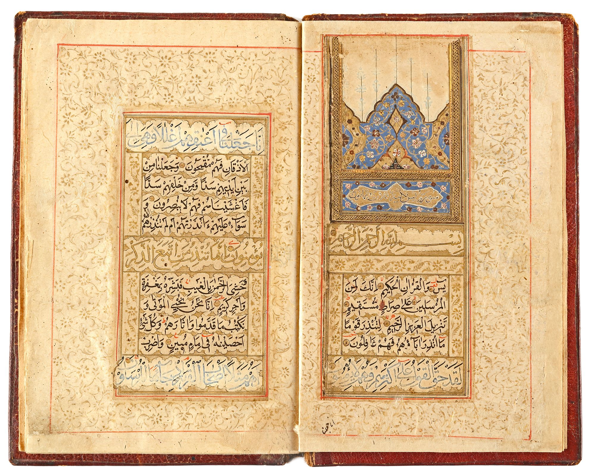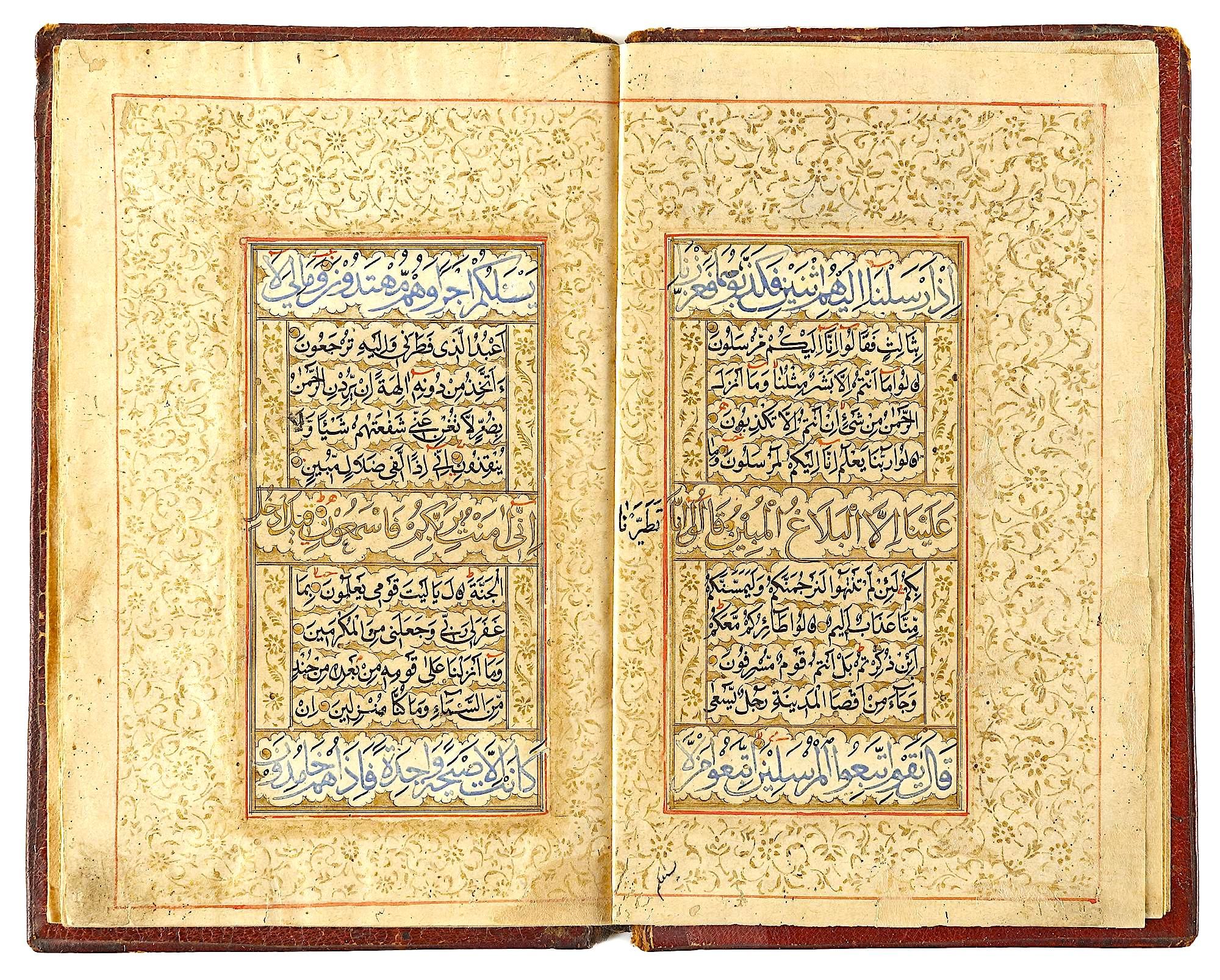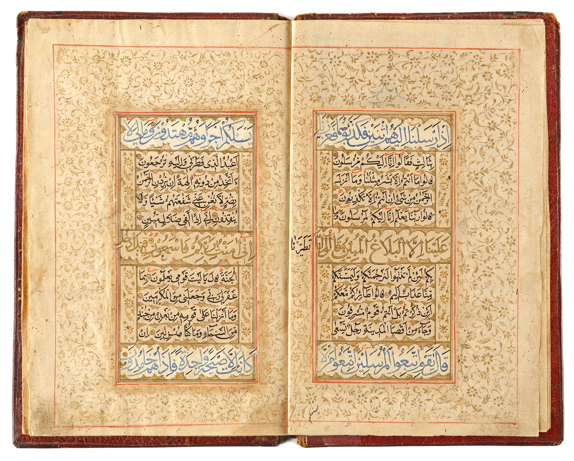 Arabic manuscript on paper, 19 leaves with 11 lines to each page, written in thuluth, naskh and muhaqqaq script. The bismallah of each surah written in muhaqqaq script, each page with 3 lines in large gold and blue script and 8 lines in black naskh script, all reserved in cloud bands against a gilt ground.