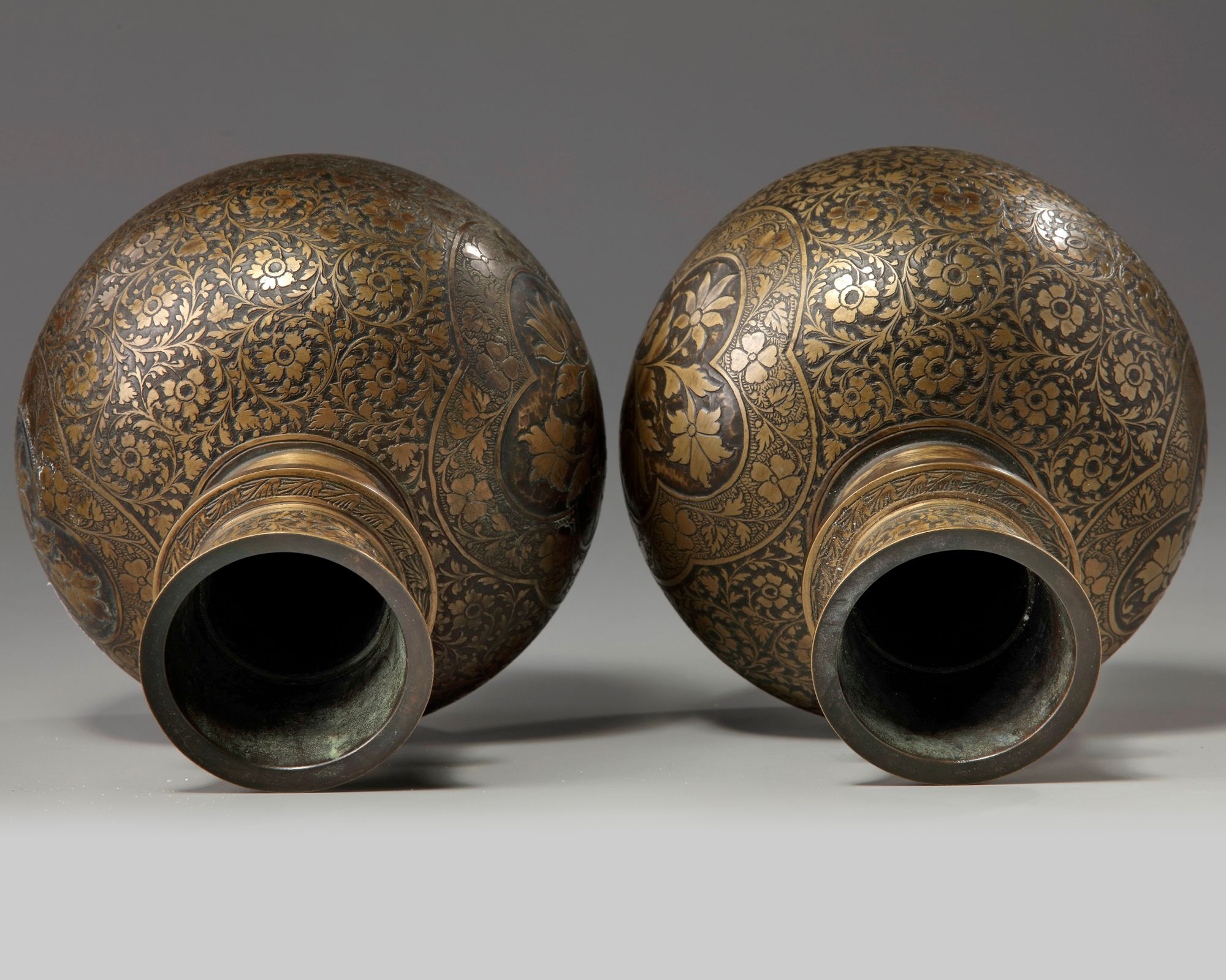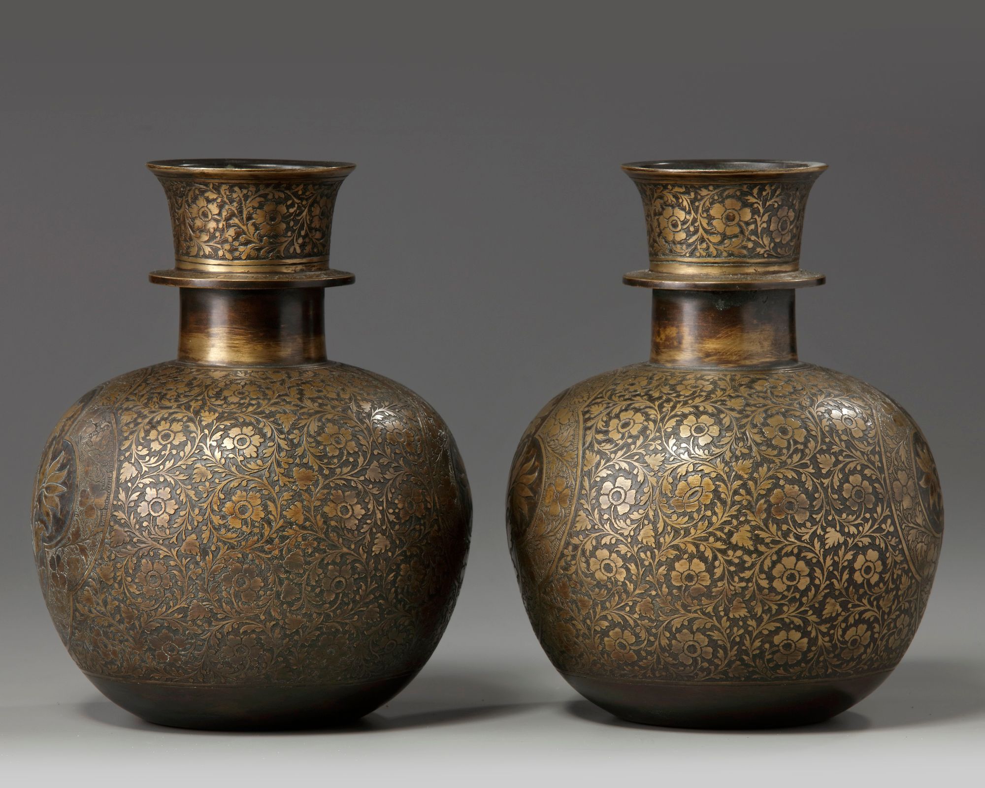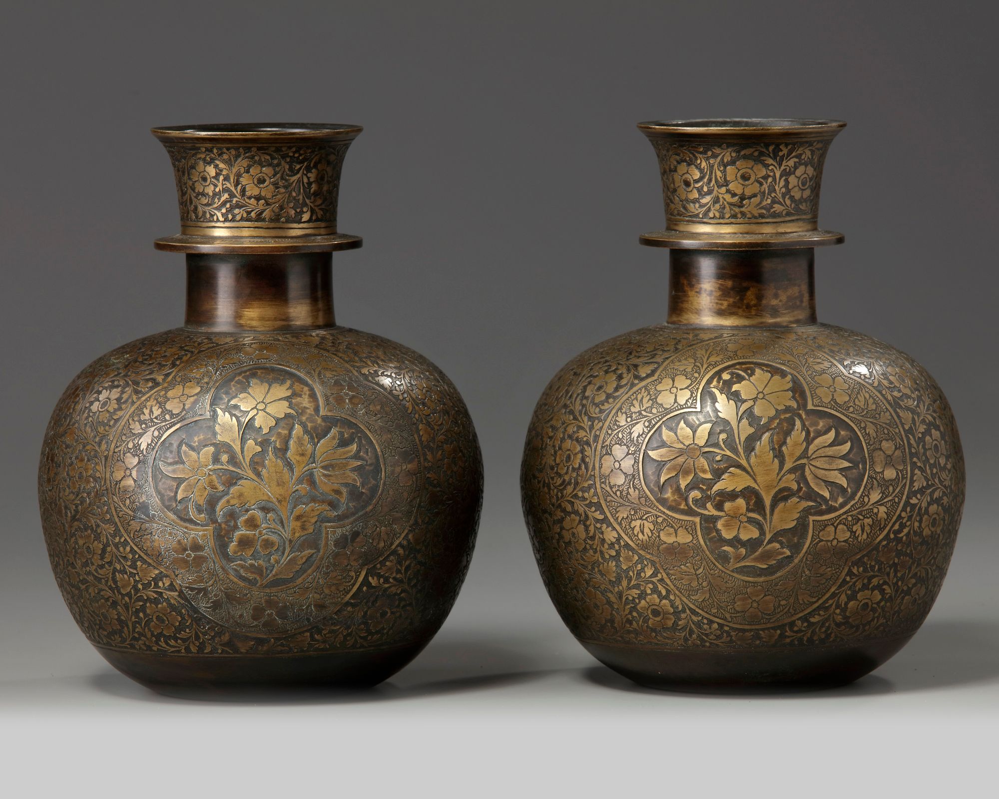 Of spherical form with pronounced collar and flaring rim, the body engraved with flower sprigs surrounded by vegetal scrolls bounded by geometric bands, shoulder and rim with bands of flowering vine