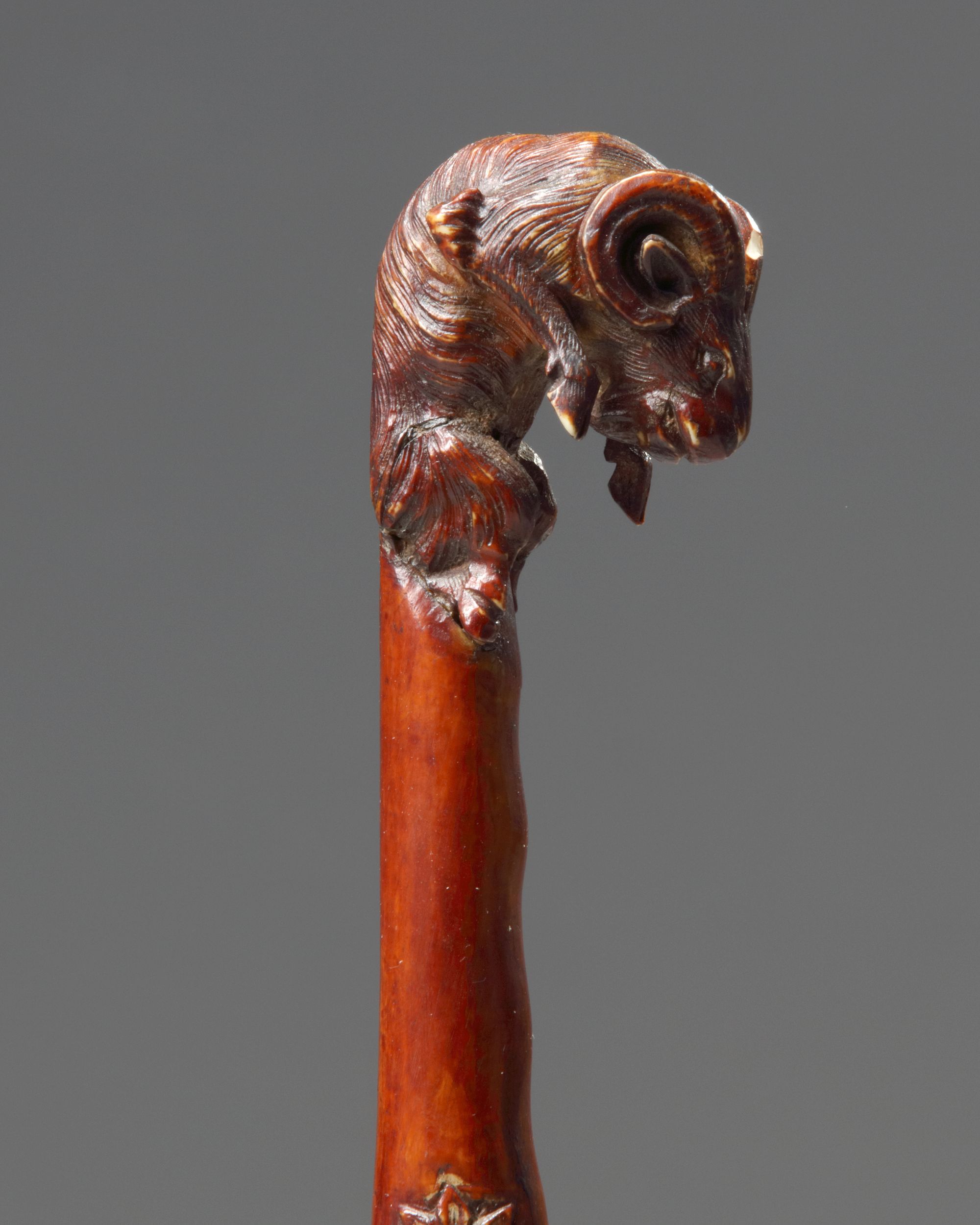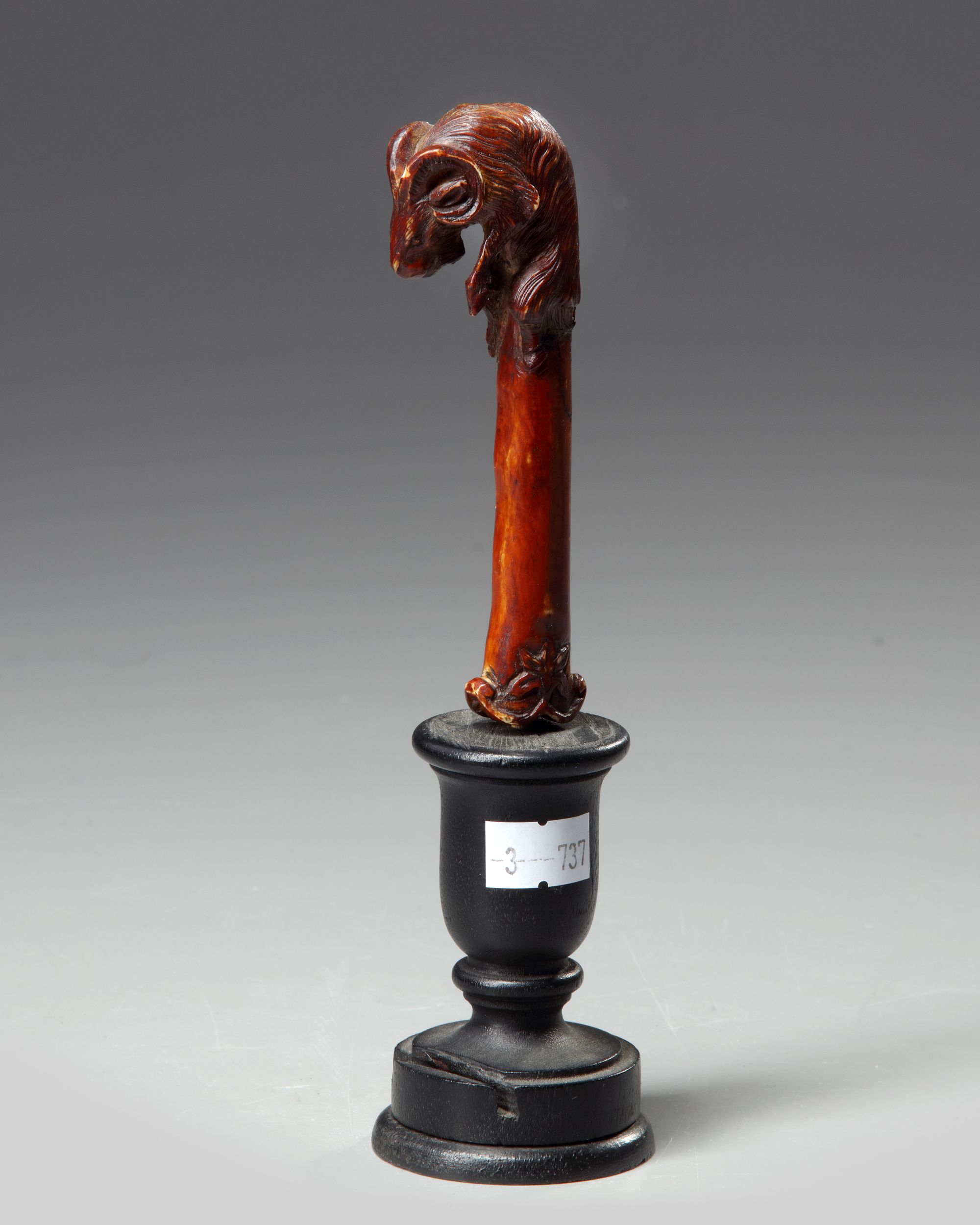 A Mughal ivory hilt dagger head, carved in the form of a ram's head with a floral design at the base. Height with stand 19 cm.