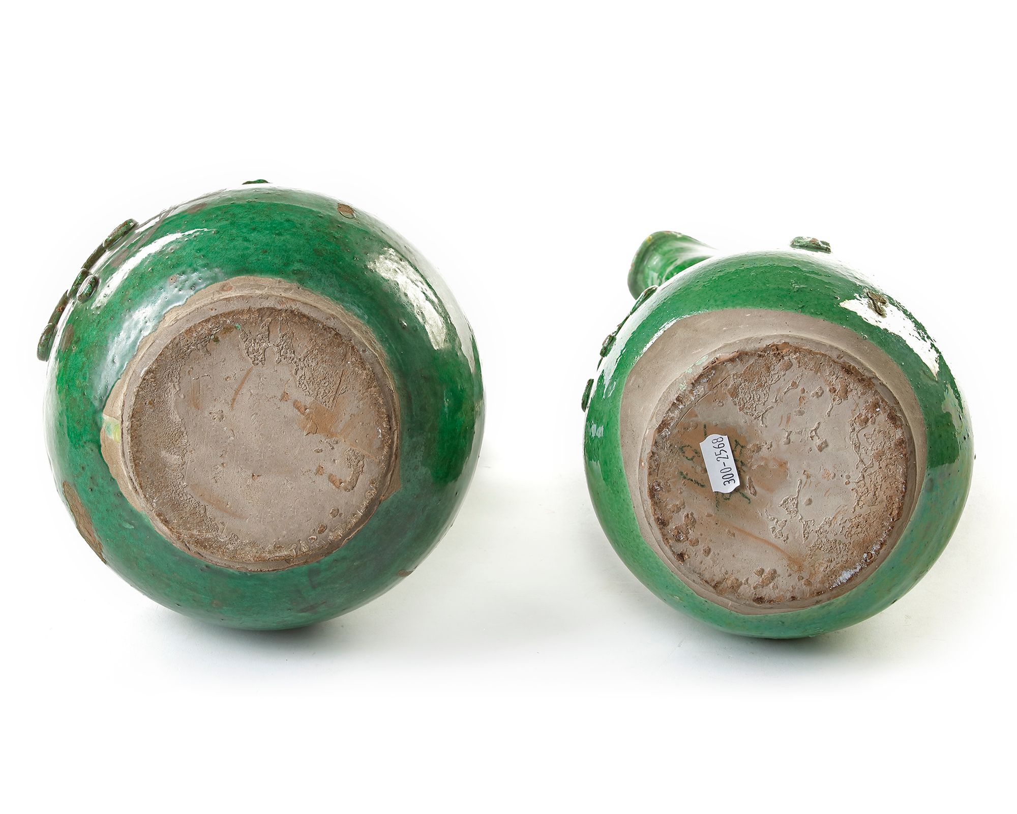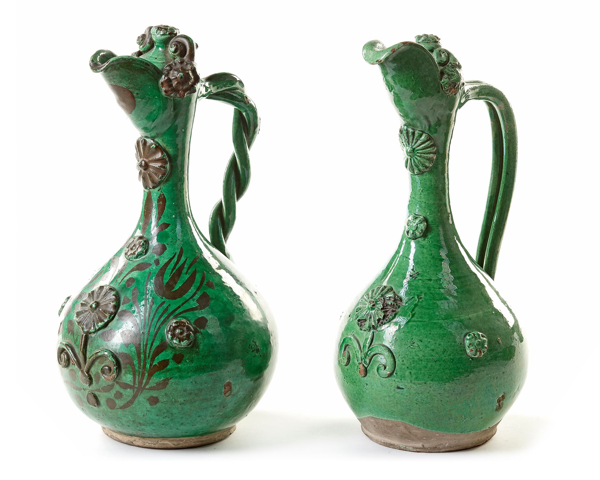 Each with bulbous body, long tapering neck and braided handle, the body and spout decorated with applied rosettes.. 36 cm. high