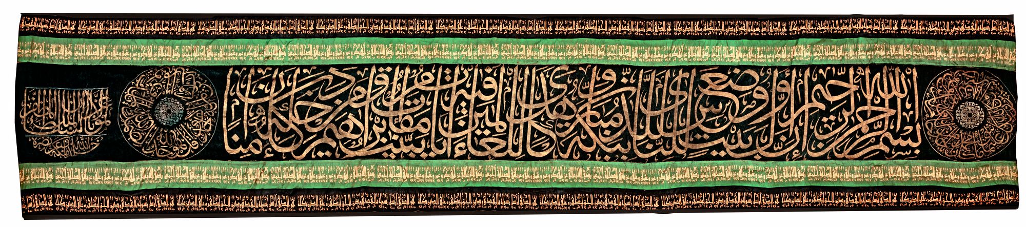 The Hizam, or belt, is an inscribed band that encircles the upper part of the Kaaba, of rectangular form, inscribed over a black silk ground, the surface broken into cartouches of various shapes and sizes. The central section (3) with a gilt repeated inscription on a black ground of Quran 61 surah Al-Imran v-96-v.97 in thuluth script, flanked by two circular panels enclosing in thuluth script (4) Quran 33 surah Al-Ahzab v.40 and (7) Quran 112 surah Al-Iklas also known as Al-Tawhid. Further stylized (8) with Glory to our Mawlana Sultan, the victorious king Long may He reign. The upper rectangular section (1)encloses Quran 61 surah As-Saff v.9. The second section of the upper part (2) with a prayer of the four Caliphs and the rest of the companions.The lower section in Kufic script (5) with Quran 112 surah Al-Iklas also known as Al-Tawhid and (6) with Quran 2 surah Al-Baqarah v.144. 630 by 130 cm.