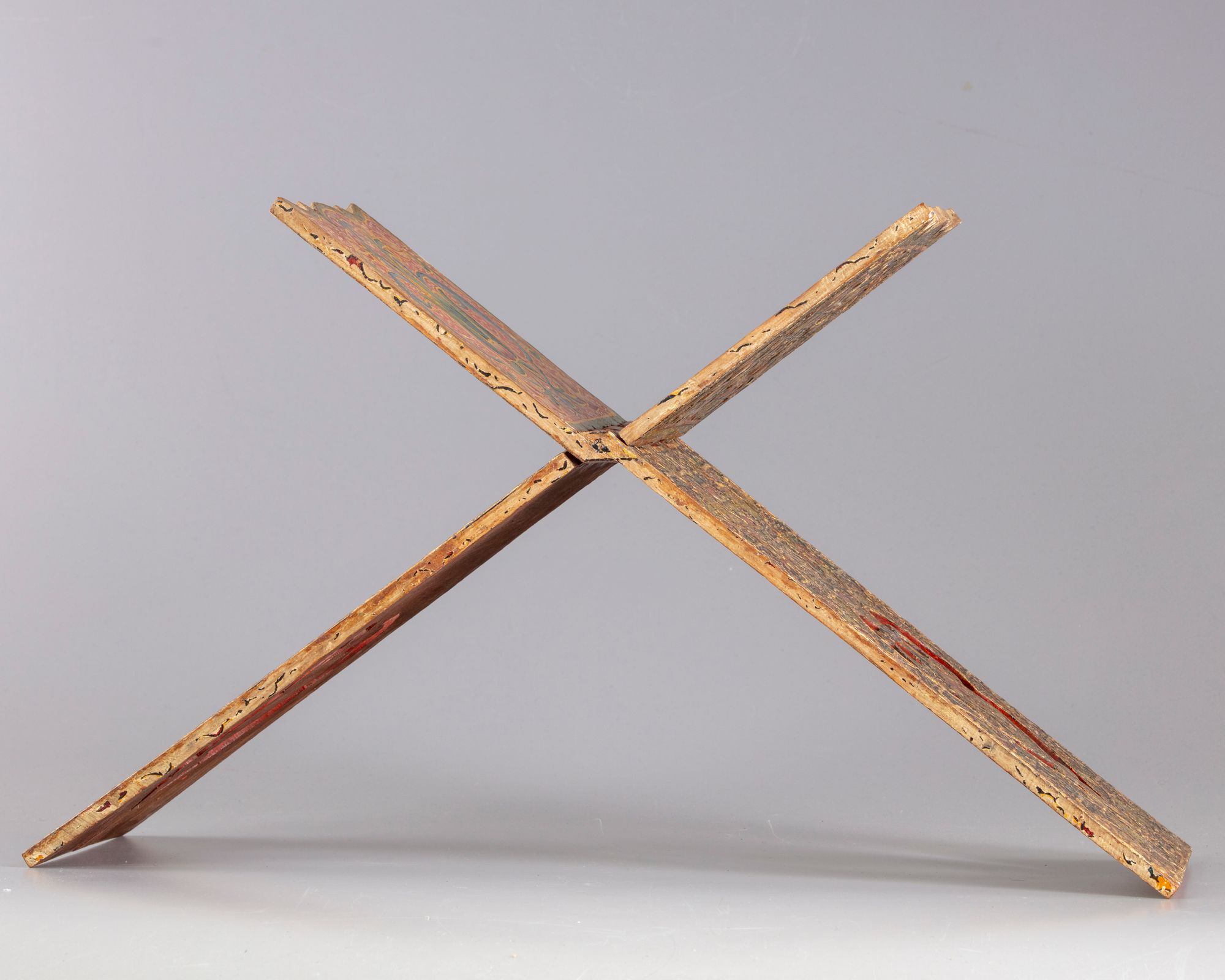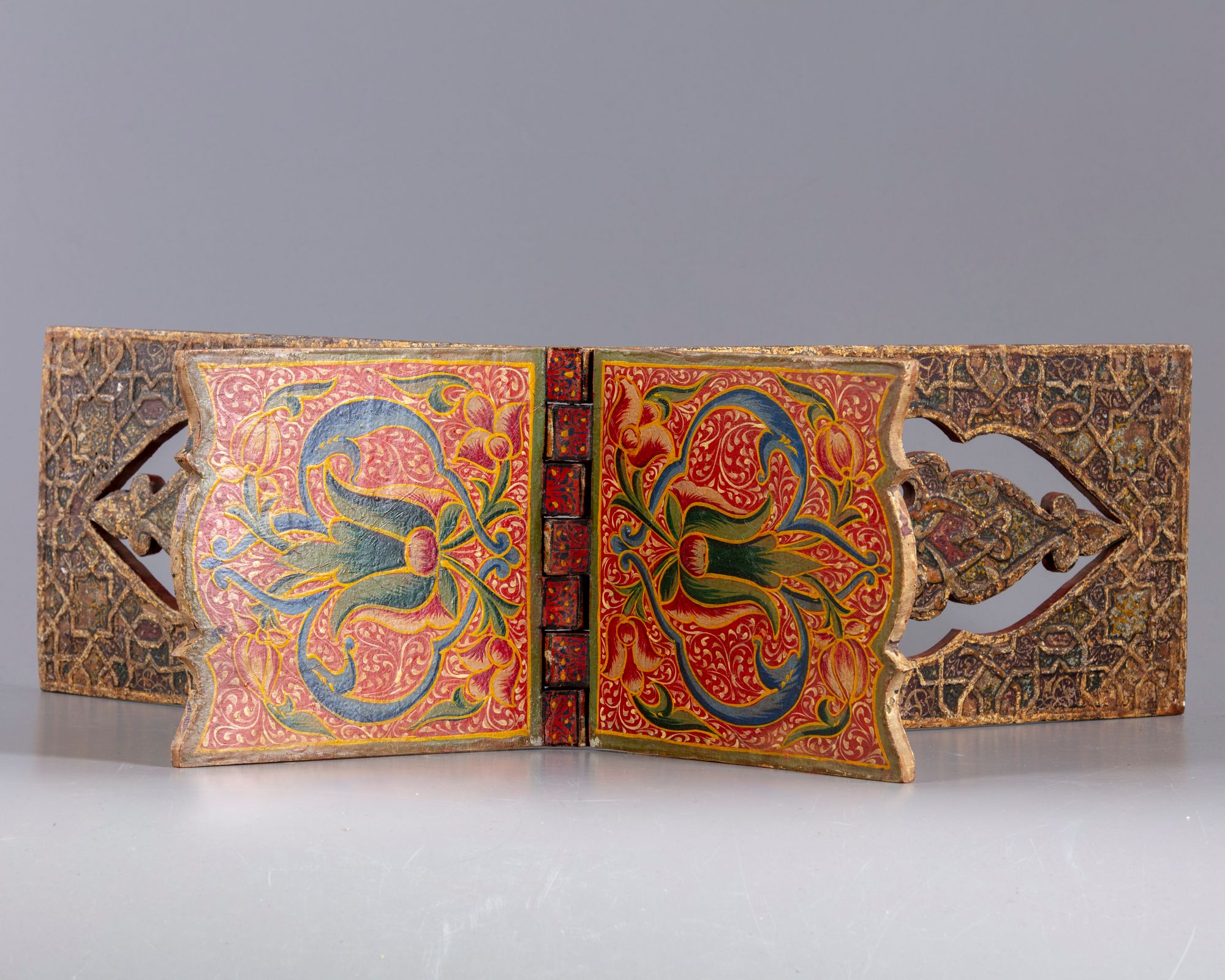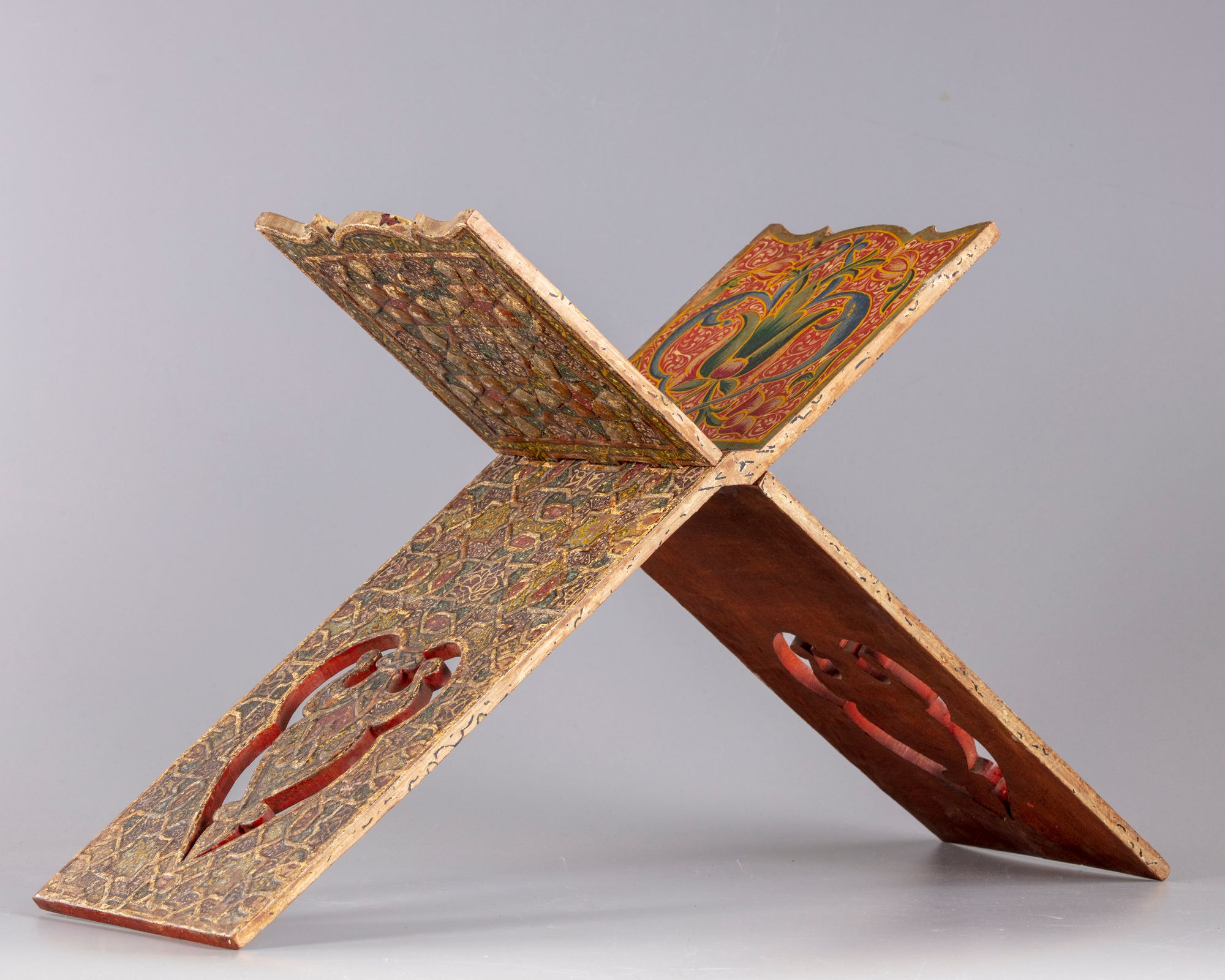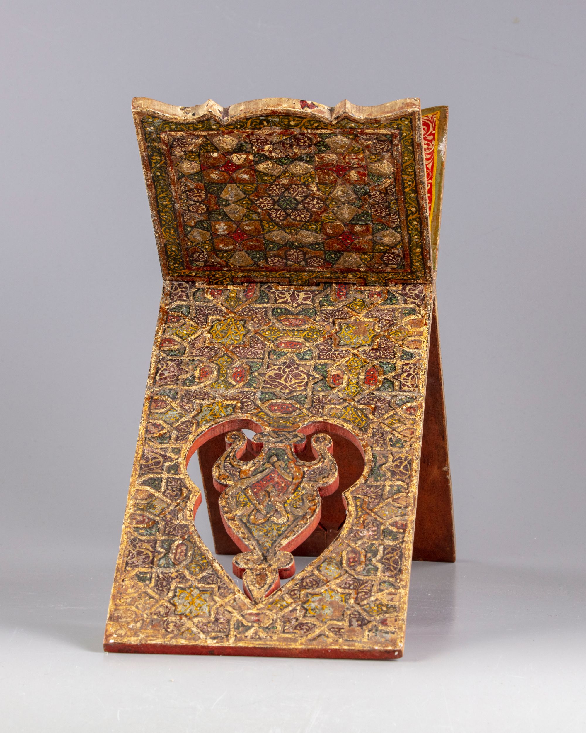 An Islamic Kashmiri lacquered Quran stand, decorated to the interior with lotus flowers amongst foliage, to the exterior carved with geometric designs.