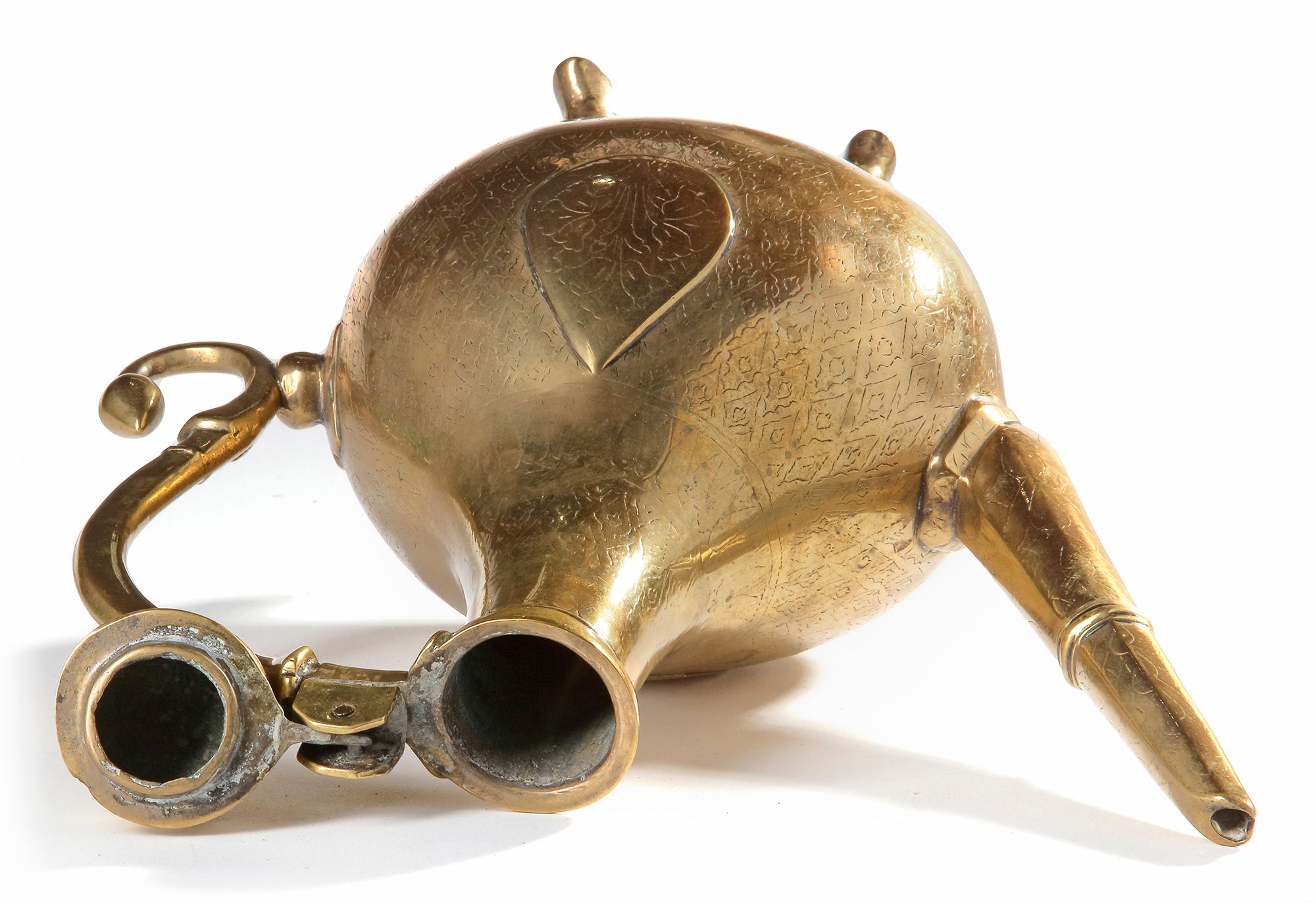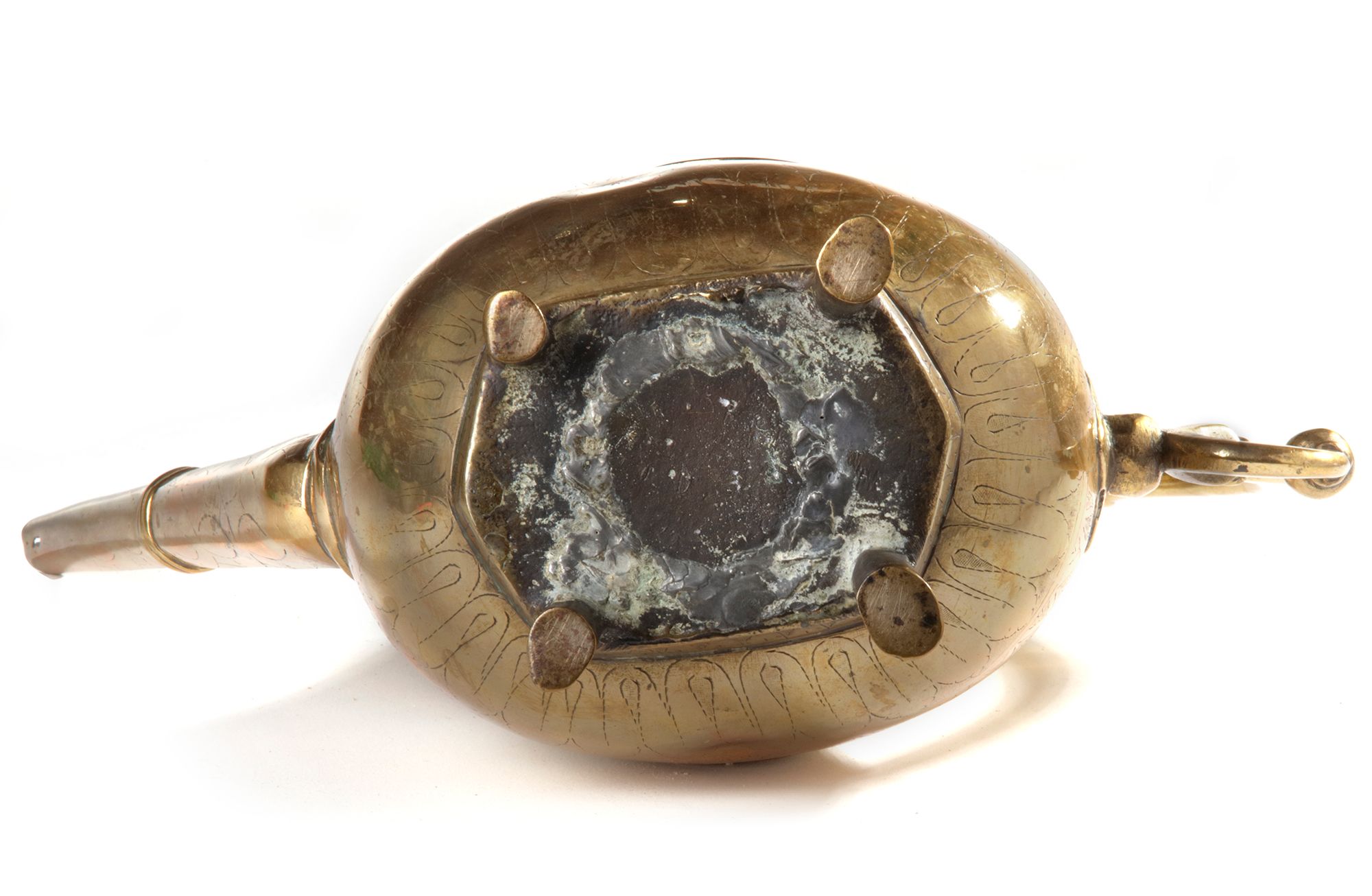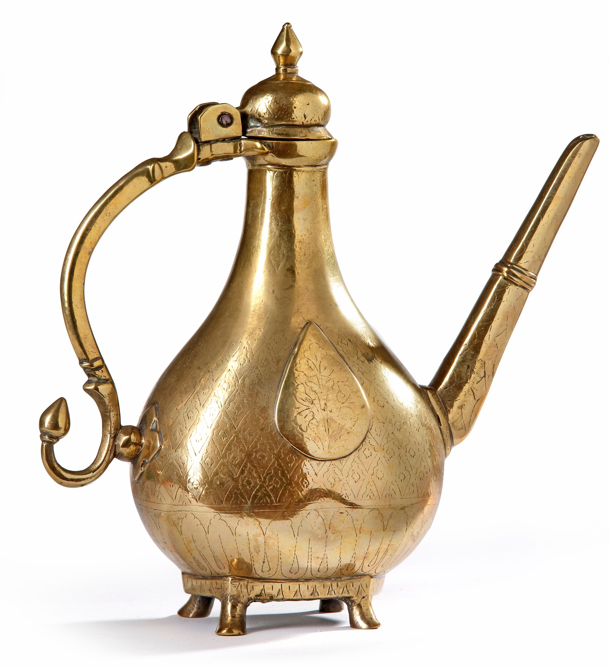Of pear shaped form on four feet with leaf-shaped panels to each side, on an engraved ground of small flowers 29 cm height.