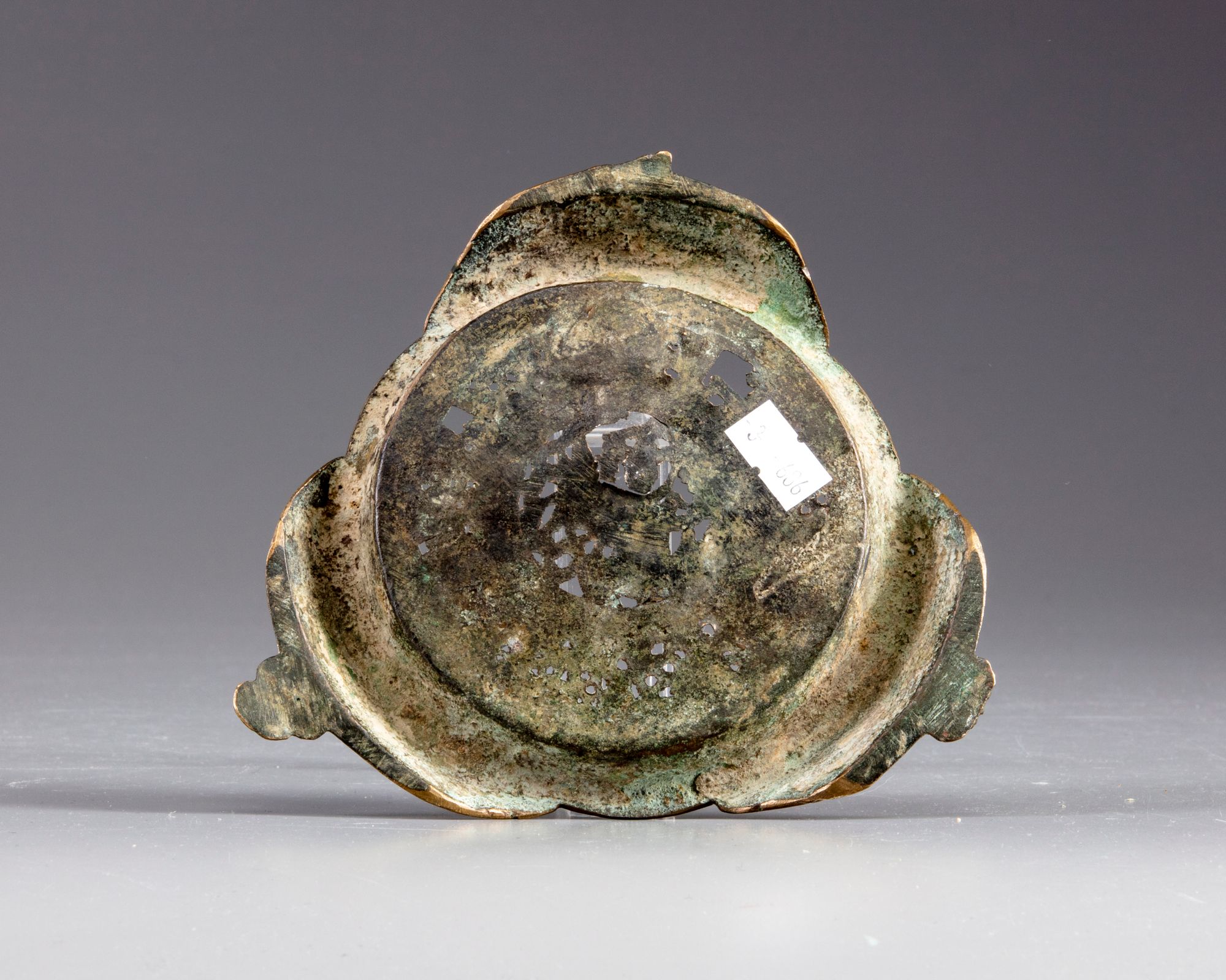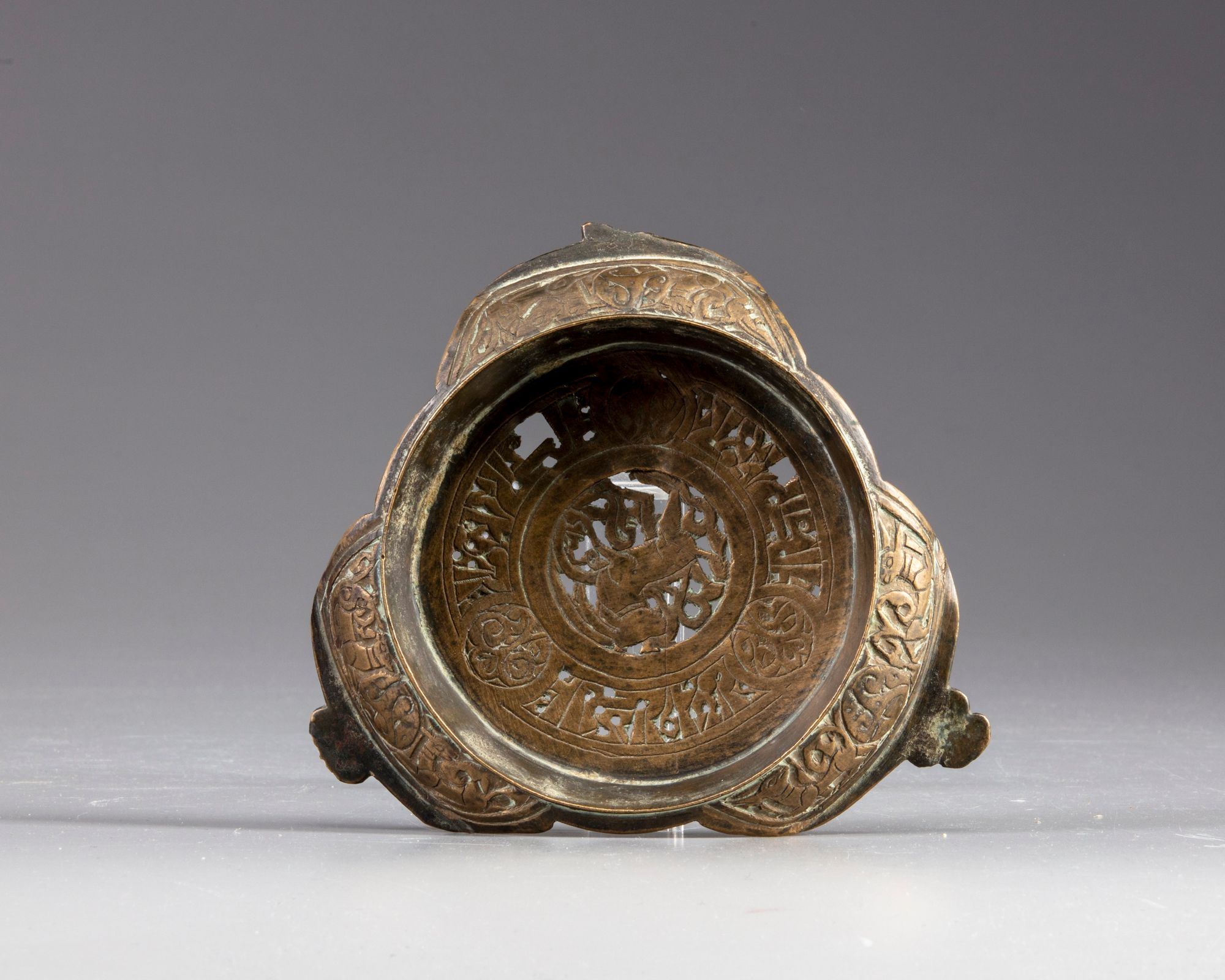 An islamic persian lamp stand, decorated and pierced with a central roundel enclosing an animal and surrounded by an Arabic calligraphy in kufic script.