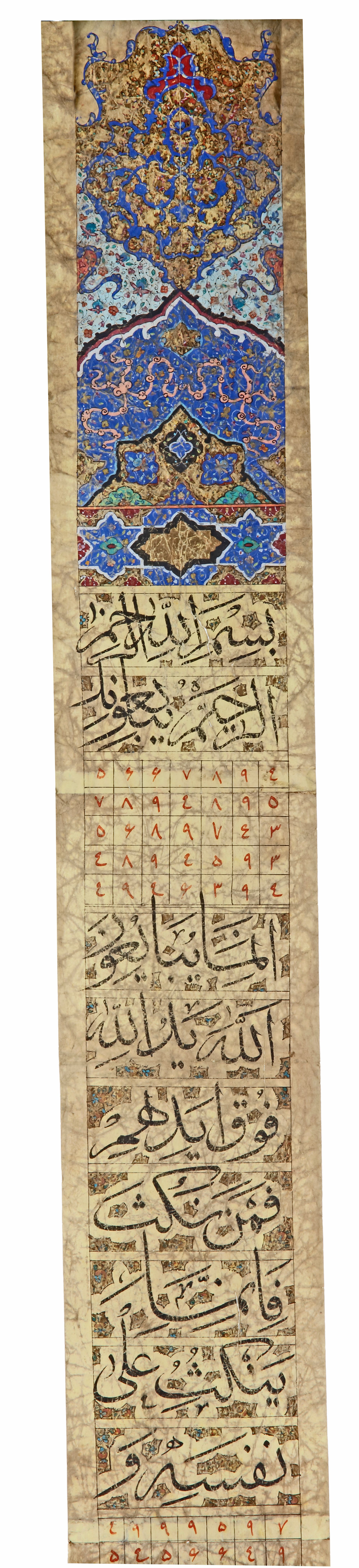 Arabic manuscript on paper, written in black thuluth and naskh script reserved in clouds, with tables of talismanic numbers. The inscription of Quran 48 surah Al-Fath v.7 and v-10. The upper part with gilt and striking blue decoration with a roundel of a view of Mecca. Written by Mohammed and dated 1211 AH/1796 AD 145 by 10 cm.