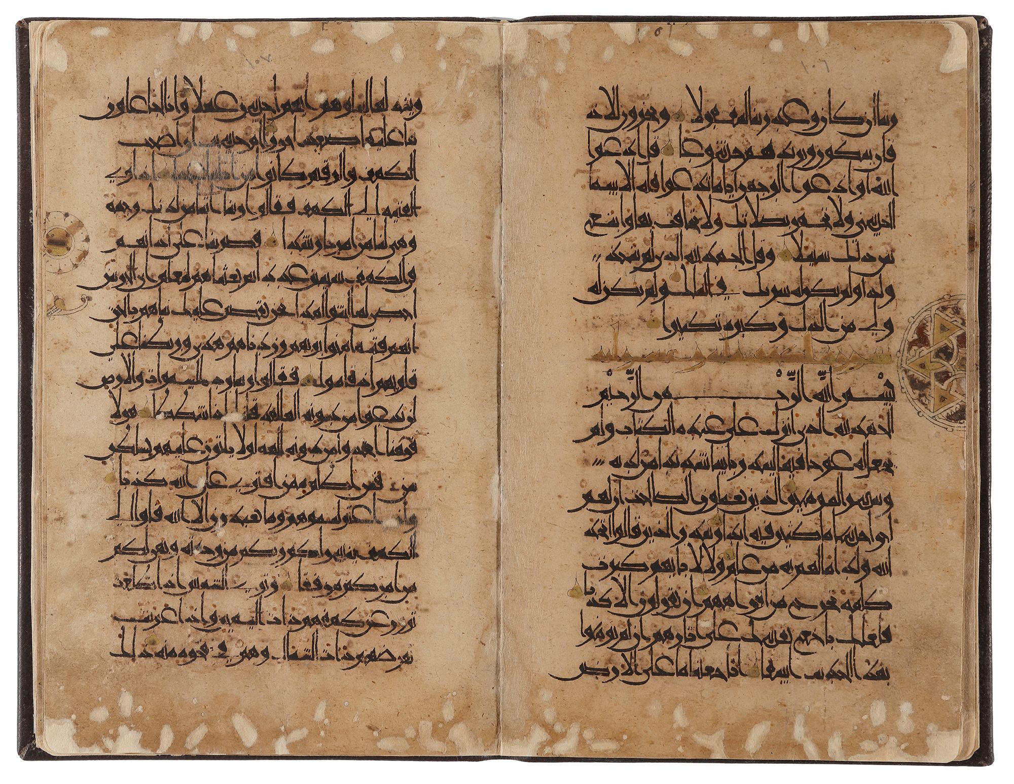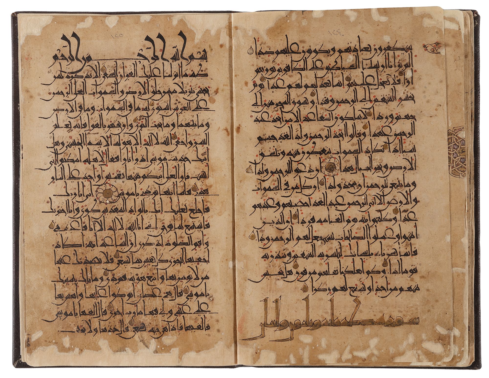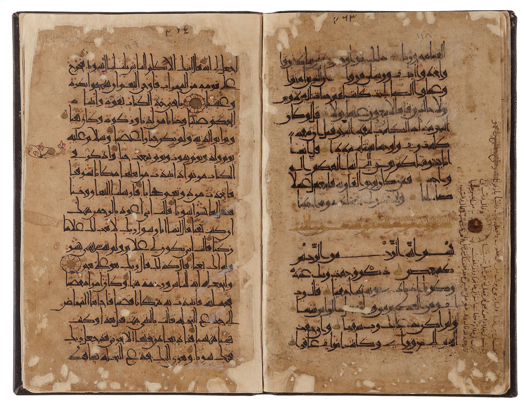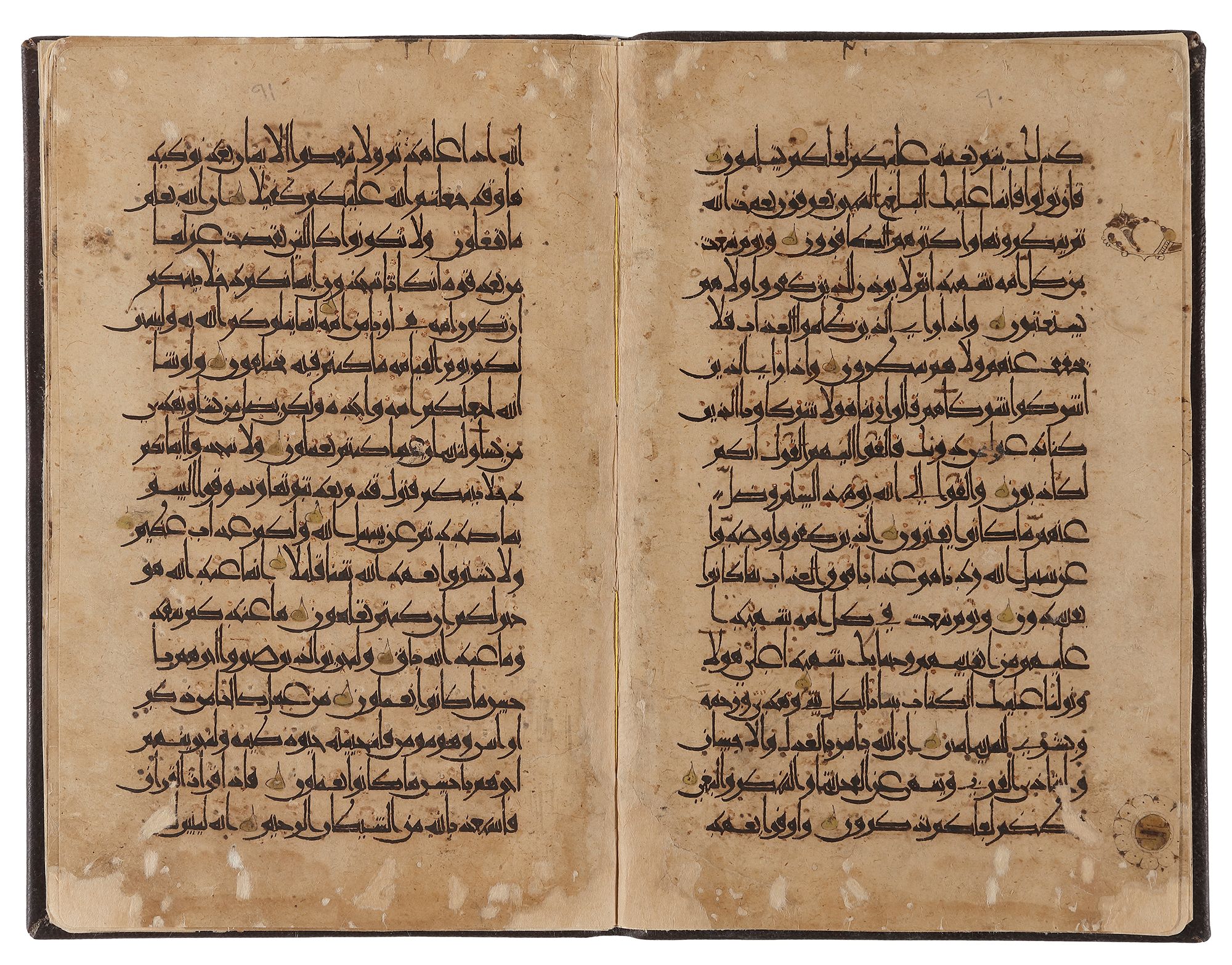 Comprising parts from Quran from surah Al-Ma’ida to the end of surah Yusuf. Arabic manuscript on paper, 99 leafs, each 11 line, plus two flyleaves. Folios with surah heading in gold, in black ink thuluth script. Diacritics and name of surahs in red ink, also the margins written on Hizibs and Juzs in black ink, without any divisions among the verses. The section from the Quran bind with brown leather cover. Folio: 18 by 23 cm. each